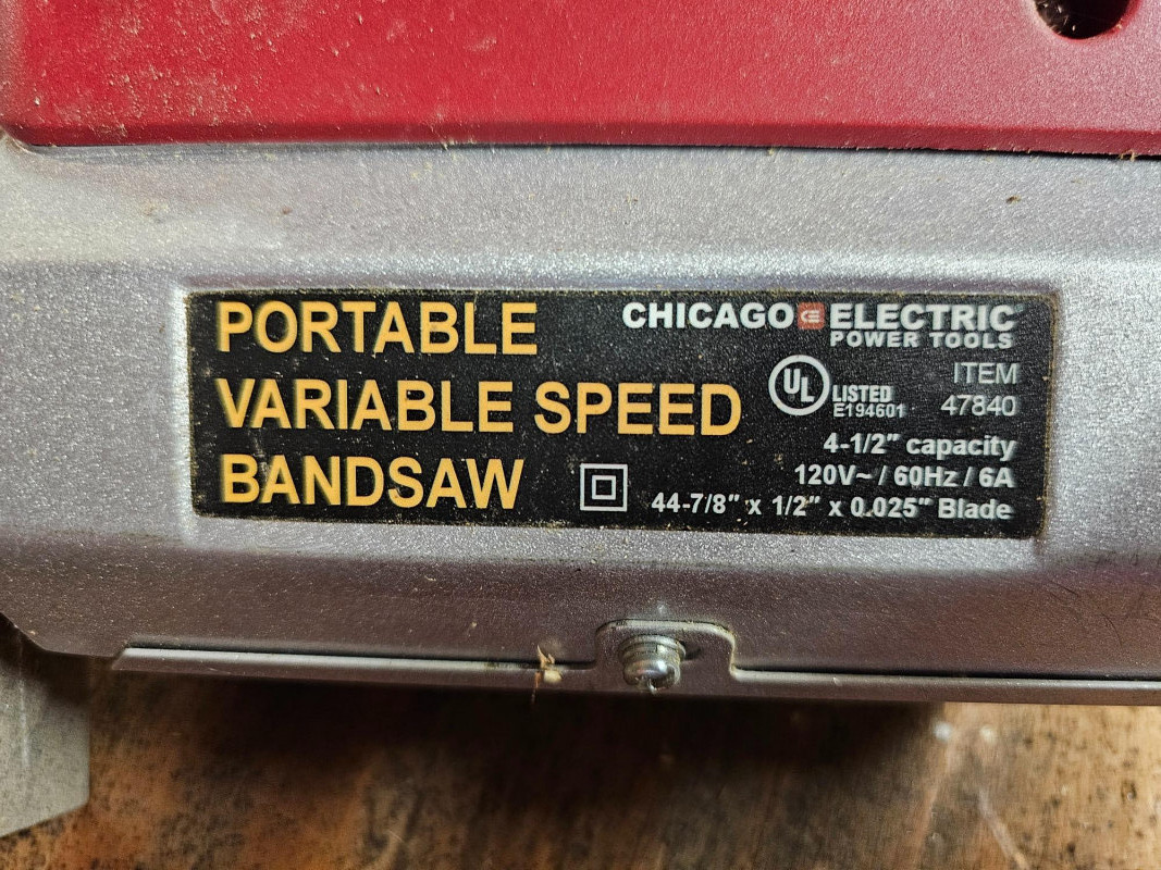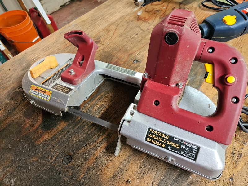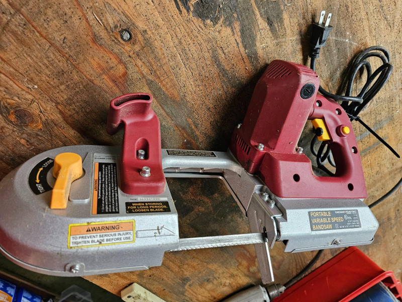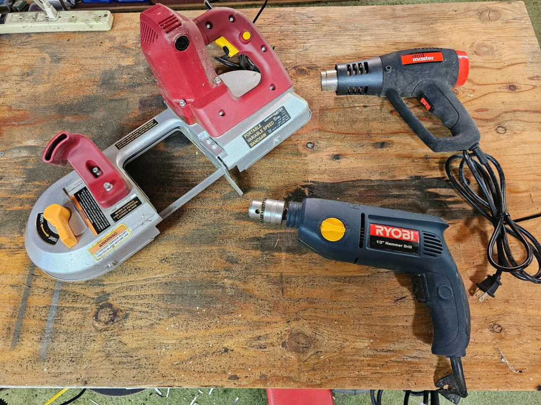 3 Corded Power Tools (Portable Bandsaw, Hammer Drill & Heat Gun) Chicago Electric Portable Variable Speed 4.5" Capacity Bandsaw - Item #47840 Ryobi 1/2" Hammer Drill - Model #HD501 Drill Master Dual Temperature Heat Gun - Item #62340 All Tested - All Work! 3 corded tools total