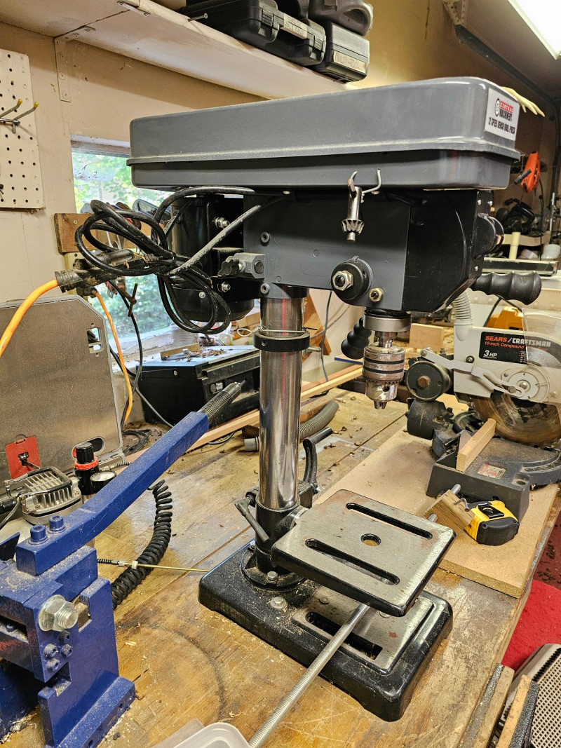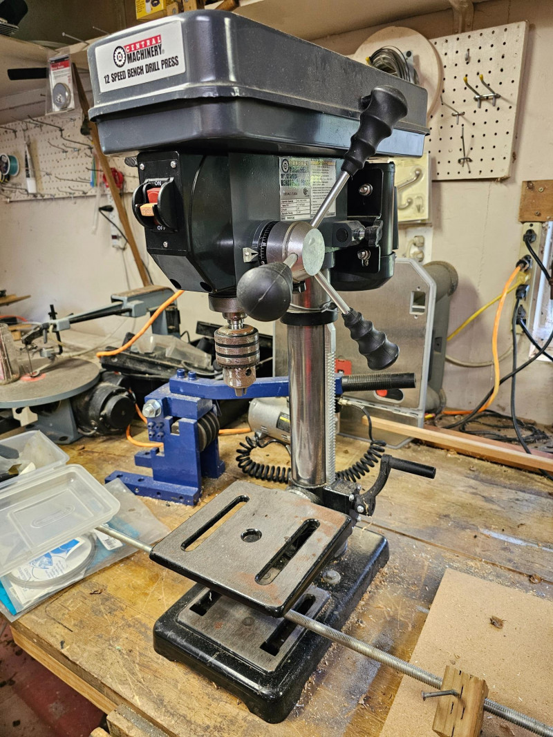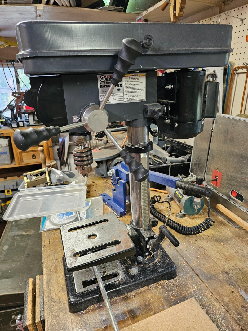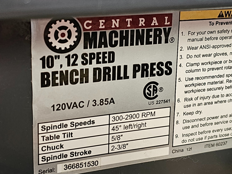 Central Machinery 10" 12-Speed Bench Drill Press Item #60237 120V 3.85amp Includes chuck key Tested - Motor makes noise but chuck didn't spin 27"T x 9"W x 19"D