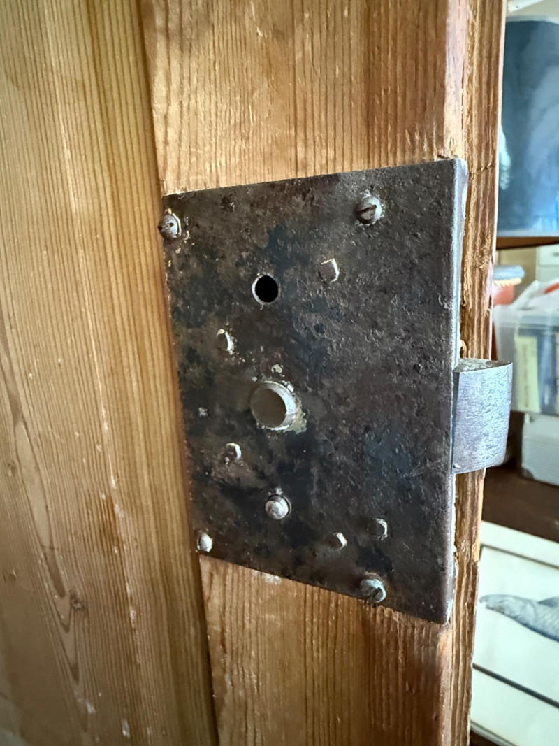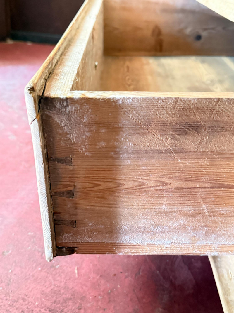 Antique European Pine Armoire With Drawer Inside has been modified with shelving and metal brackets. Some organic growth is noticed inside and out. 36.5x22x79”