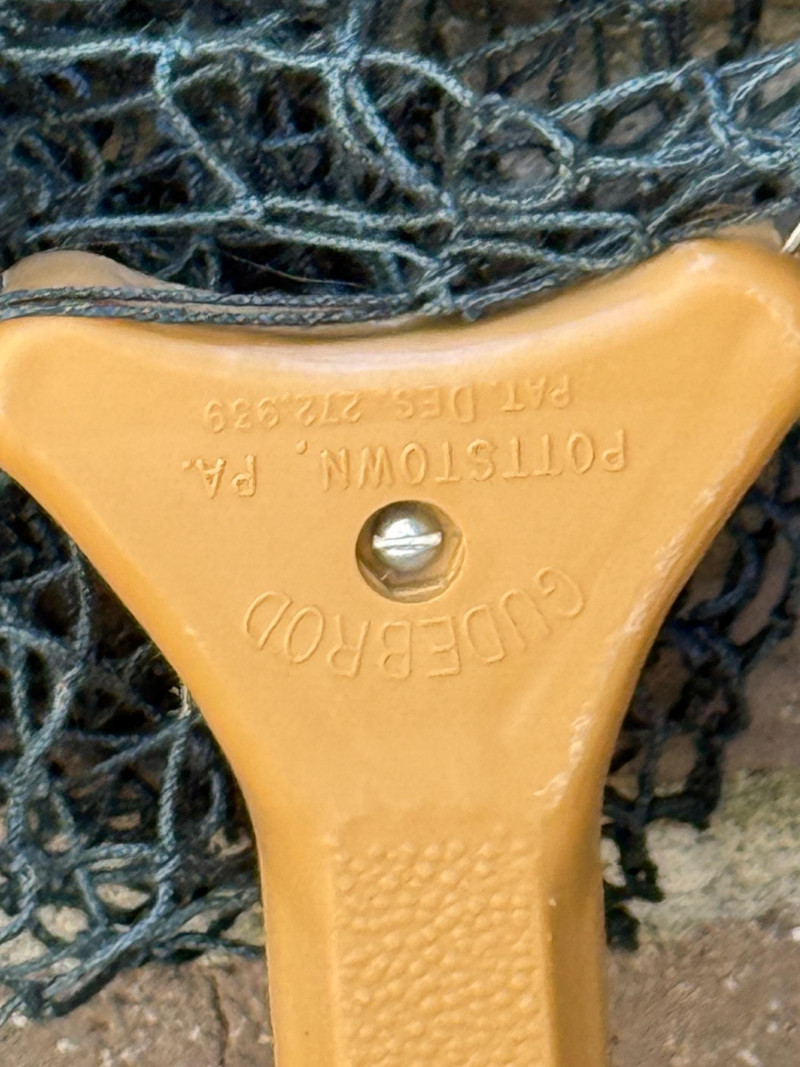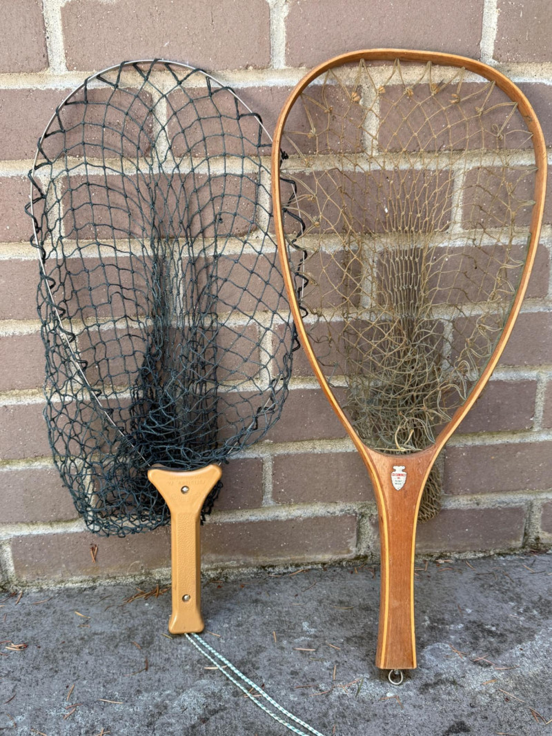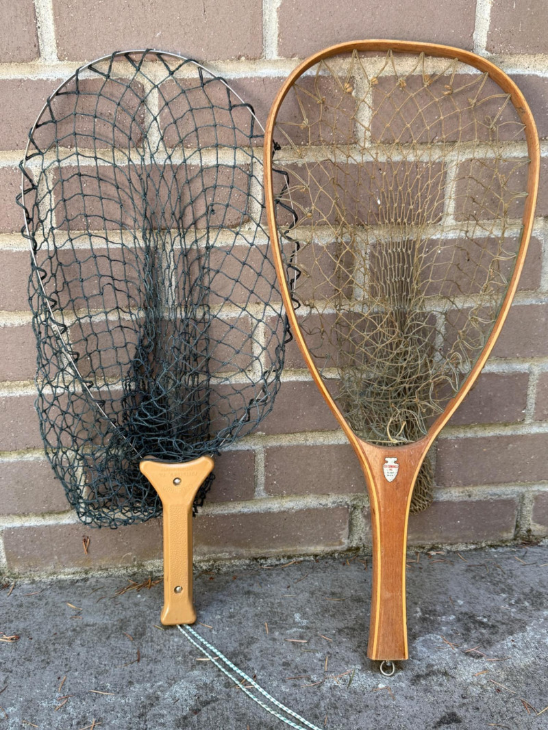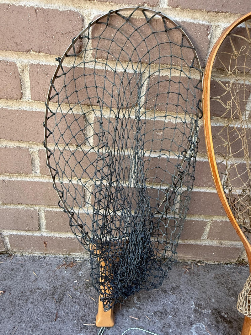Fishing Nets Plastic handle Gudebrod, Pottstown, PA metal frame net is 22.5x10” Wood inlay Ed Cummings Flint, MI net is 23x10.5” Both nets appear complete with no holes.