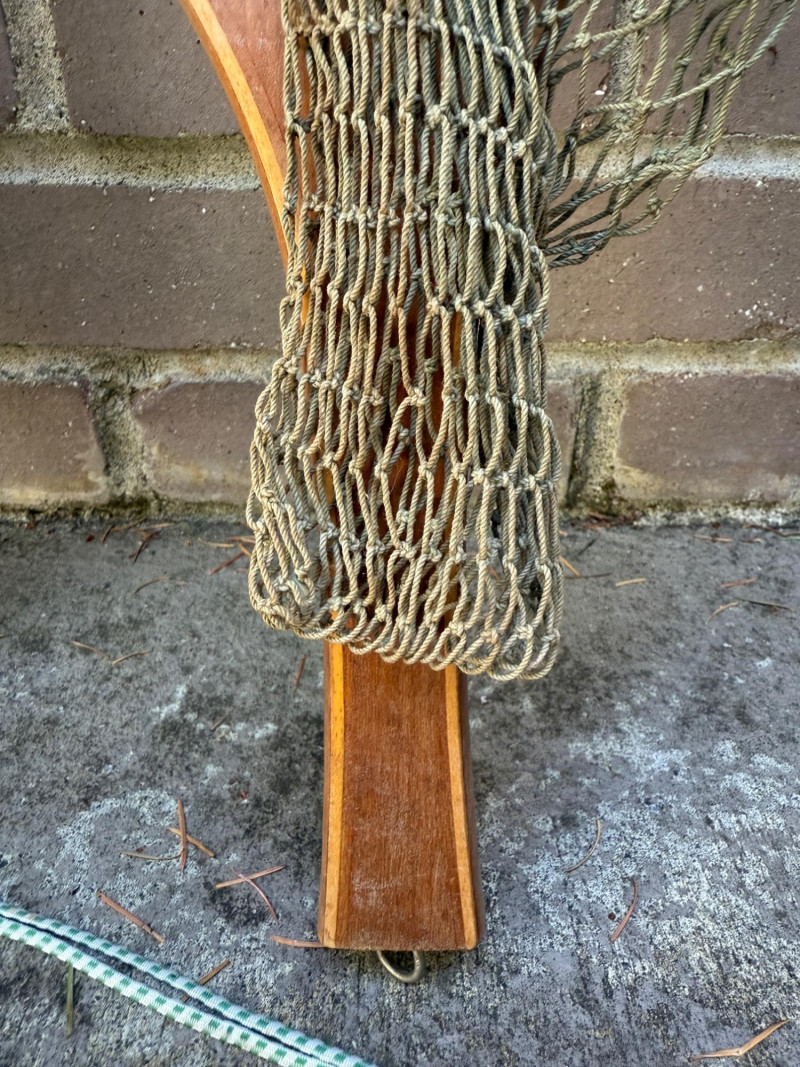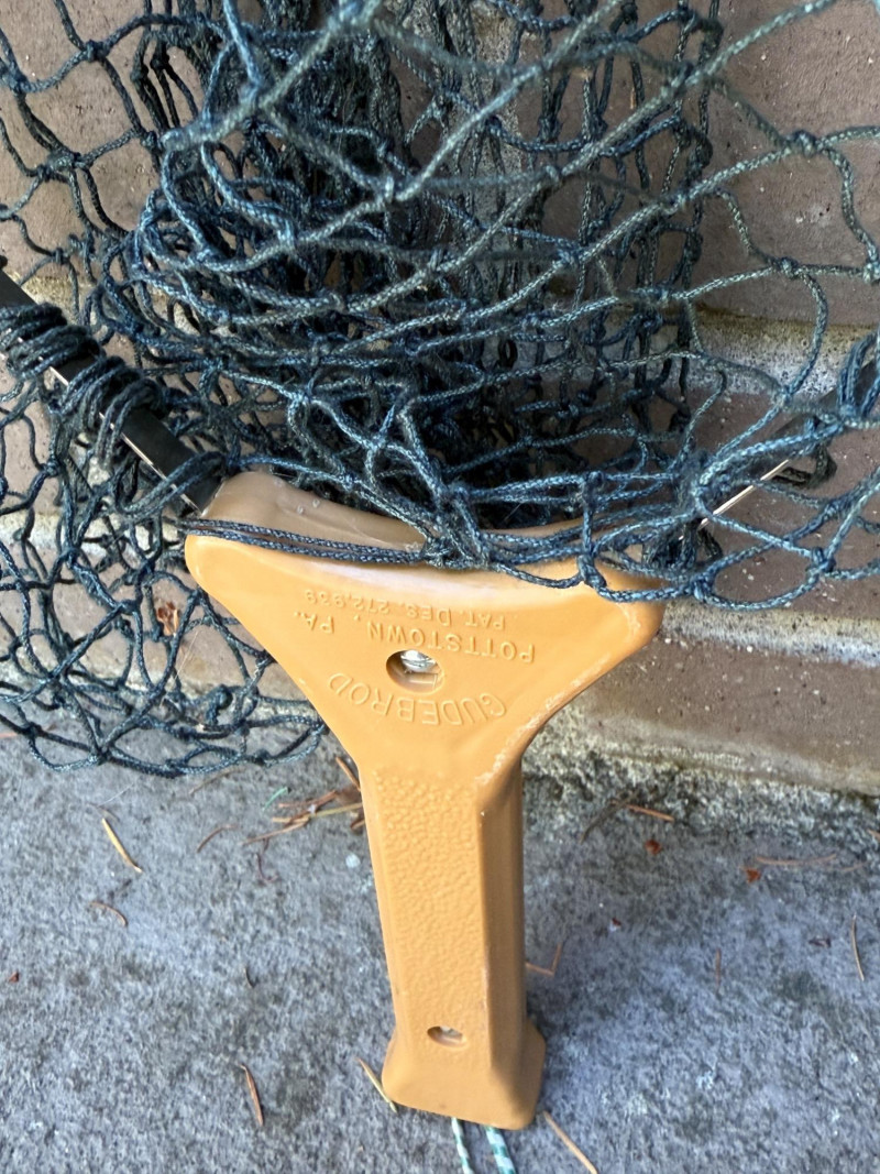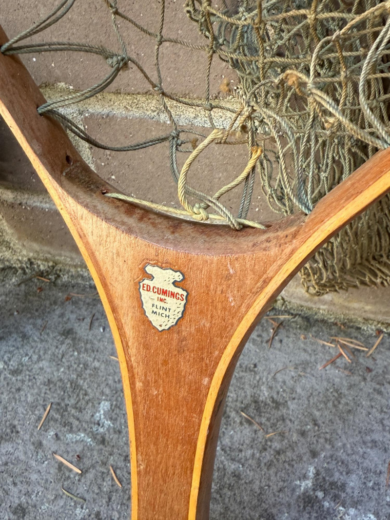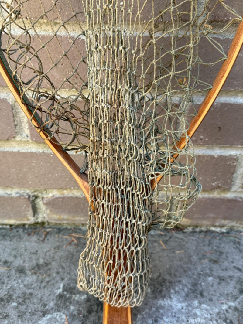 Fishing Nets Plastic handle Gudebrod, Pottstown, PA metal frame net is 22.5x10” Wood inlay Ed Cummings Flint, MI net is 23x10.5” Both nets appear complete with no holes.