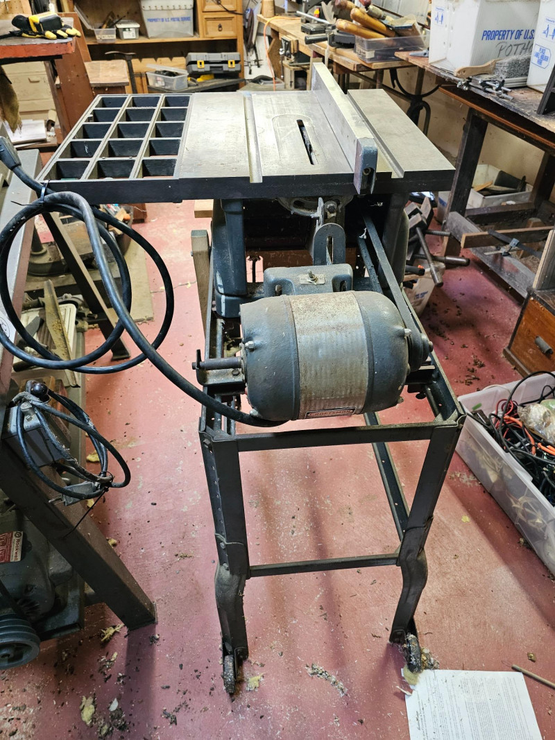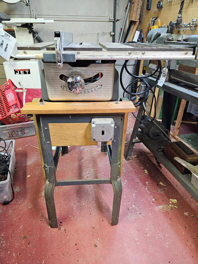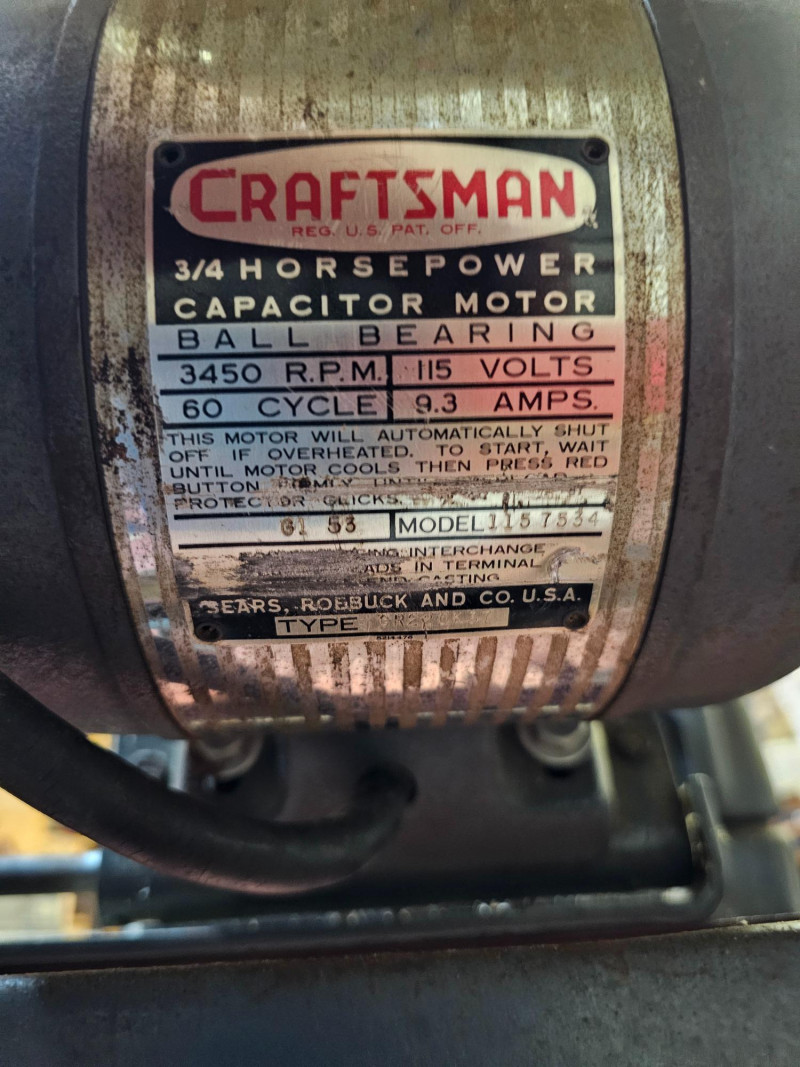 1950s Craftsman Table Saw Made By Sears, Roebuck & Co Model #103.22160 Vintage Craftsman table saw with metal stand. Powered by a 3/4hp Craftsman motor. Chrome finish on the front panel looks great, an era when they built tools to last! Tested - Works! (Motor & motor bracket could use some tightening up) 43"T x 27"W x 34"D