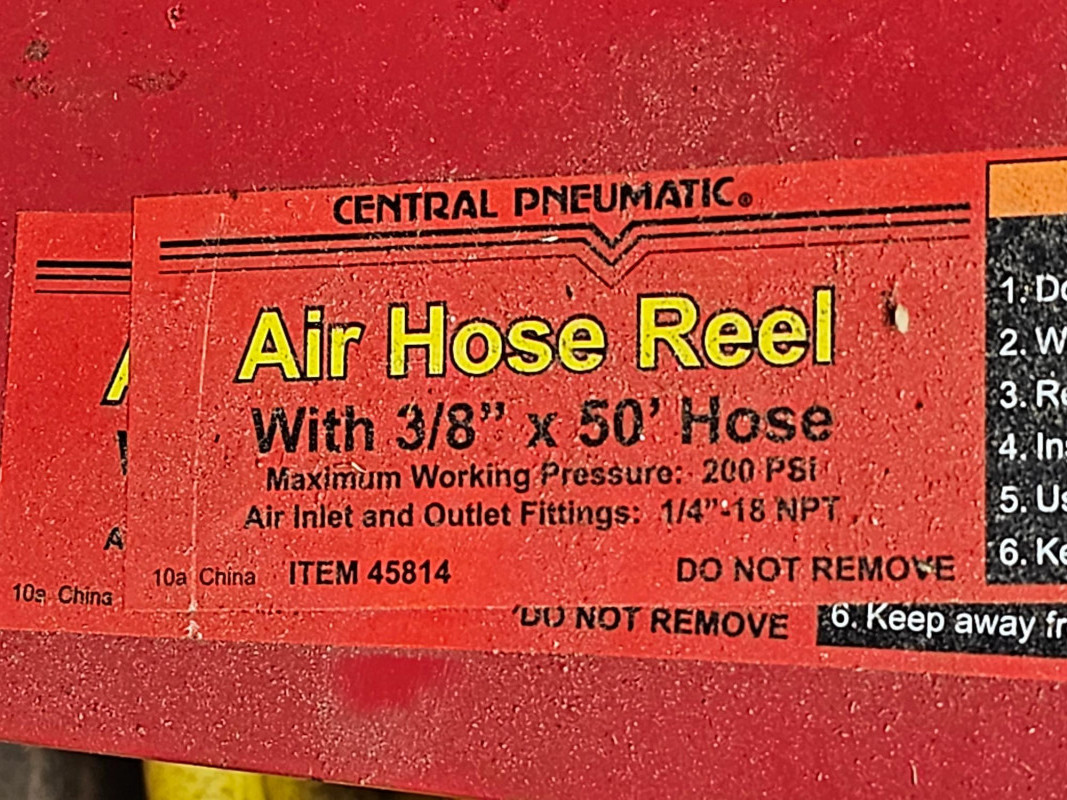 Central Pneumatic Air Hose Reel & 50' 3/8" Hose Item #45814 Brand and Model: Central Pneumatic Air Hose Reel, Item 45814. Hose Specifications: Includes a 3/8" x 50' hose. Pressure Rating: Maximum working pressure of 200 PSI. Fittings: Air Inlet and Outlet Fittings are 1/4"-18 NPT. 17"T x 17"W x 7"D