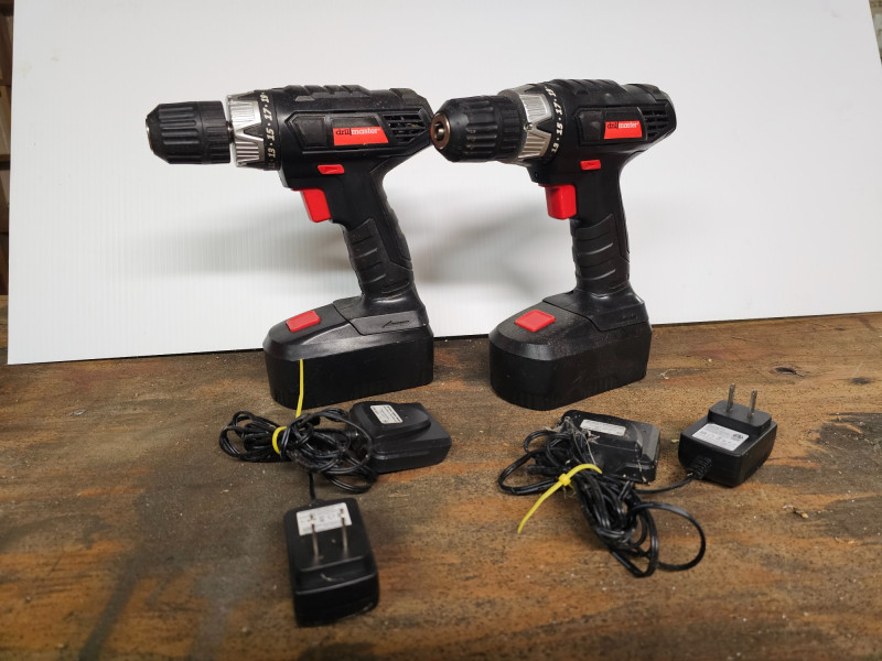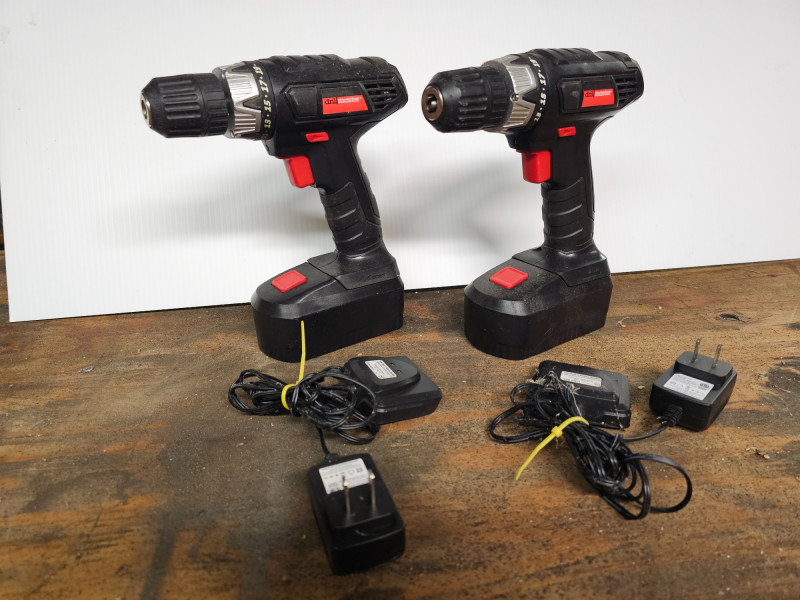 (2) Drill Master 18V Cordless Drills & (1) Impact Driver, (2) 18V Batteries & (2) Battery Chargers (2) Drill Master 3/8" cordless 18V drills Item #62873 (1) Drill Master 1/4" cordless 18V impact driver Item #61424 (2) 18V Batteries (2) 18V battery Chargers Tested - Works!