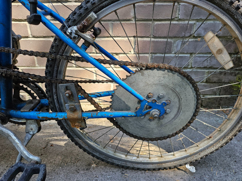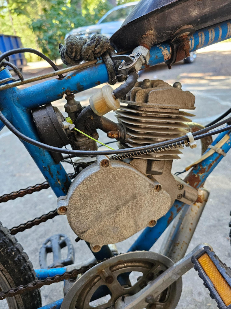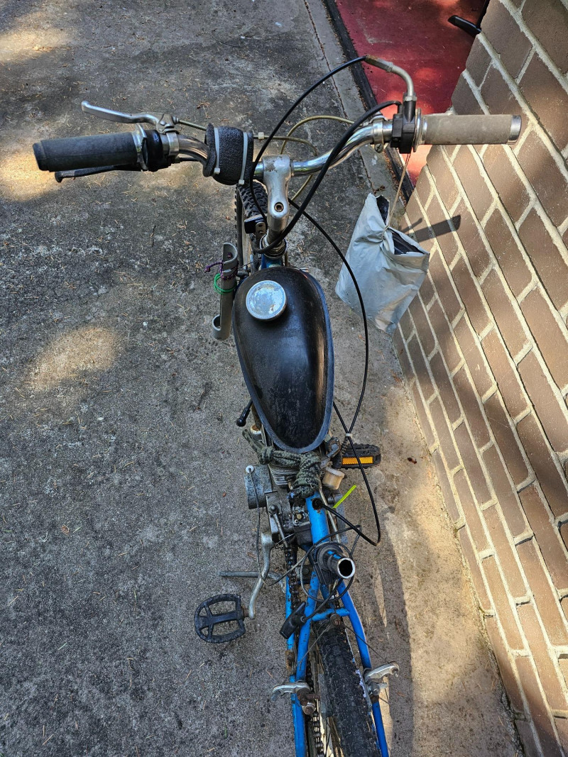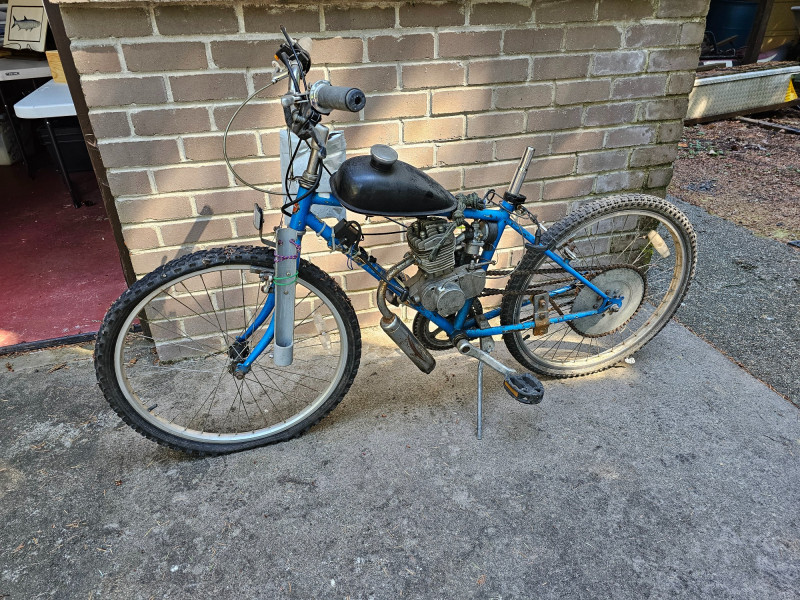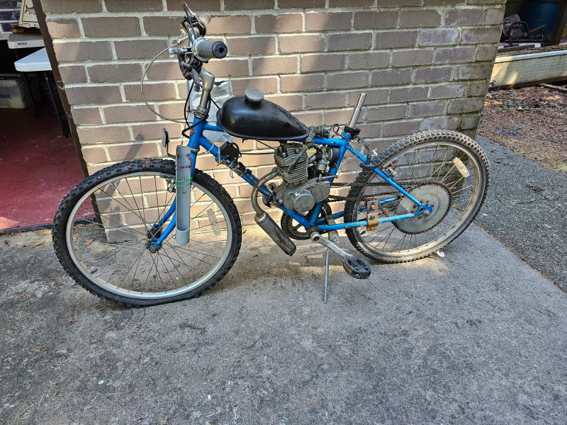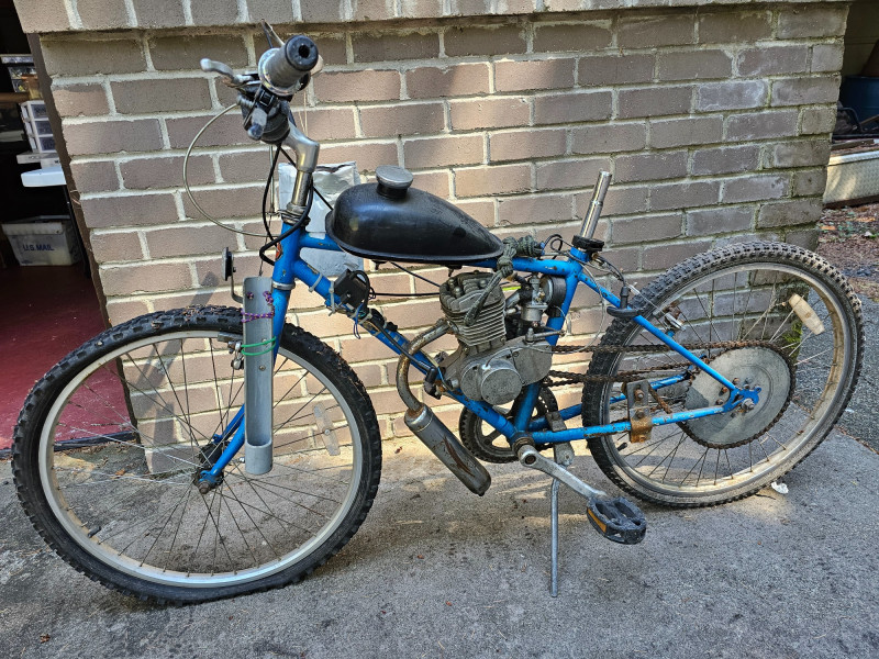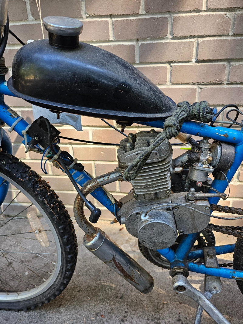 Schwinn Bicycle With A Motor Project! Schwinn bicycle with a mall gas motor and chain drive setup. Gas tank, exhaust and throttle setup Tires are flat, no seat Unsure of the completeness of the project or if it has ever run. Continue and finish this cool project!