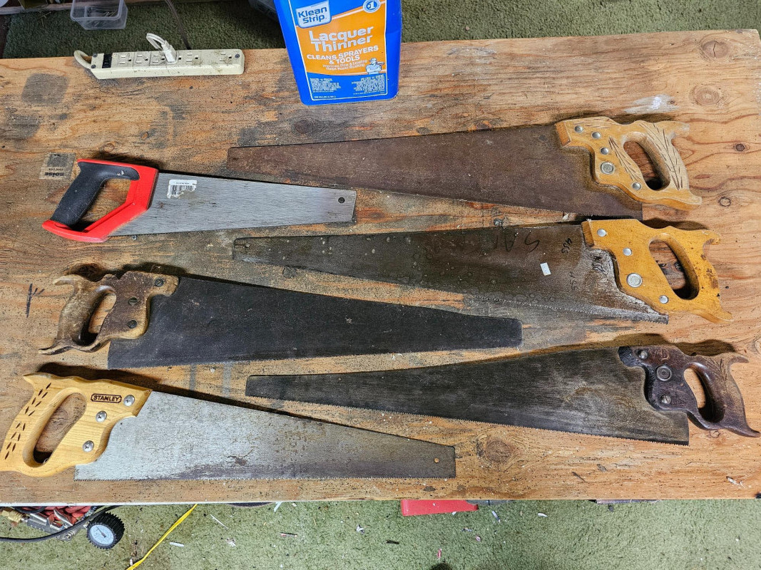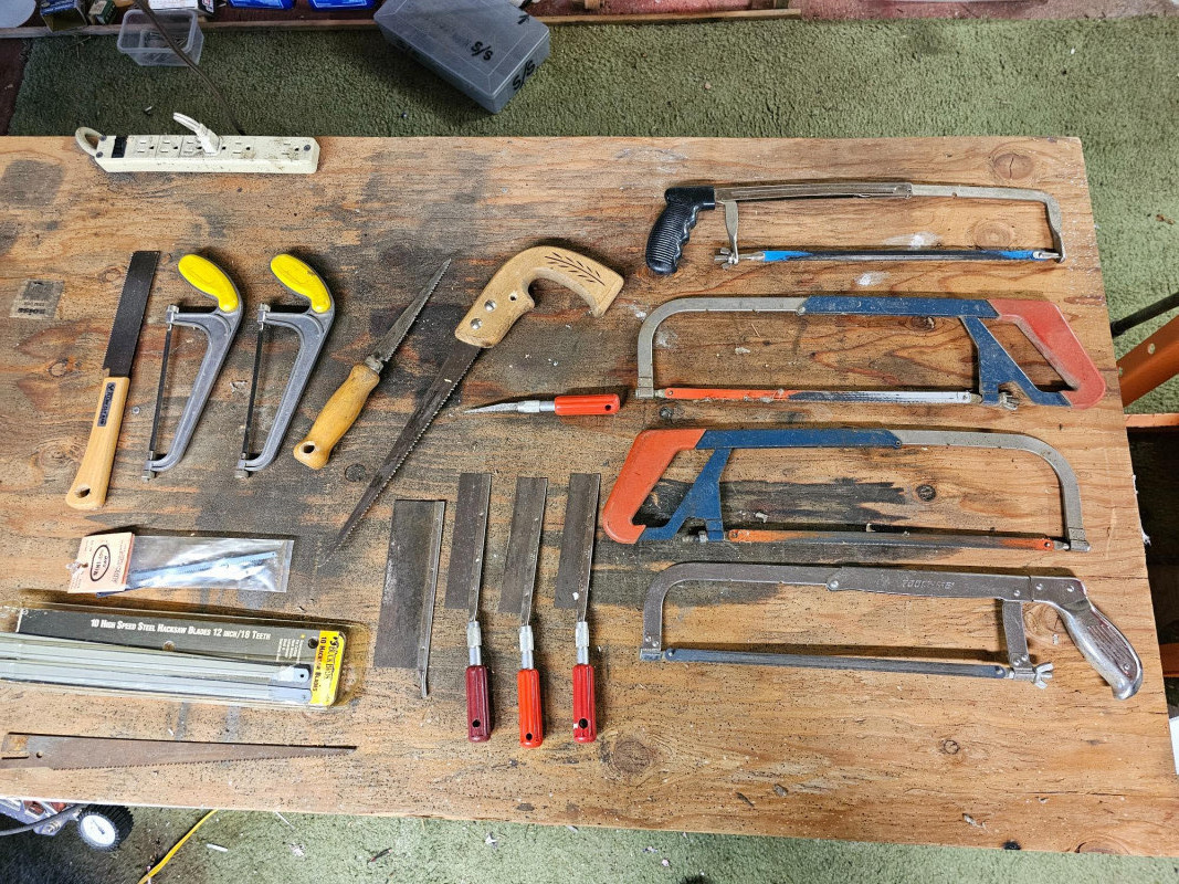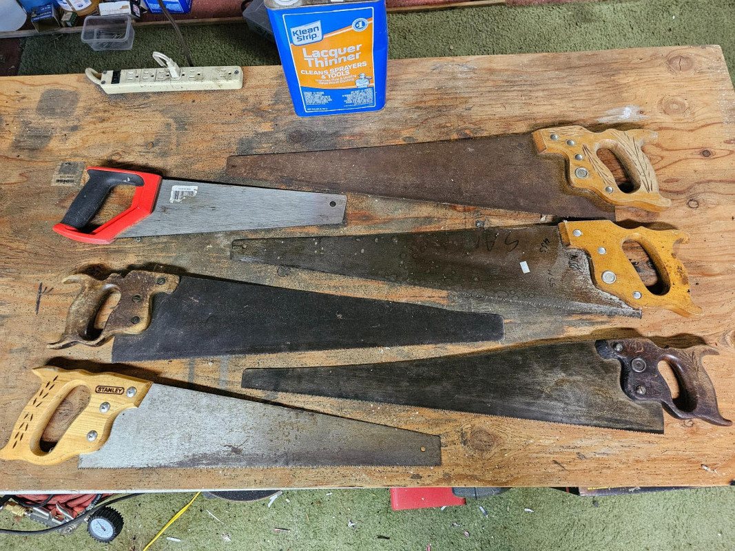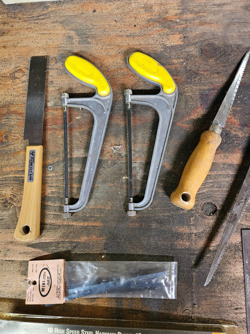 Tote Full Of 20 Hand Saws! Wood saws, hacksaws, flush cut saw, small saws, big saws, and extra hacksaw blades 20 saws in all!