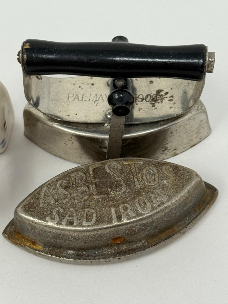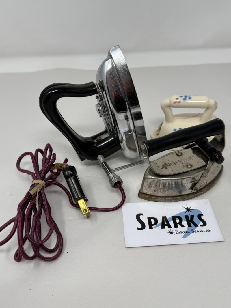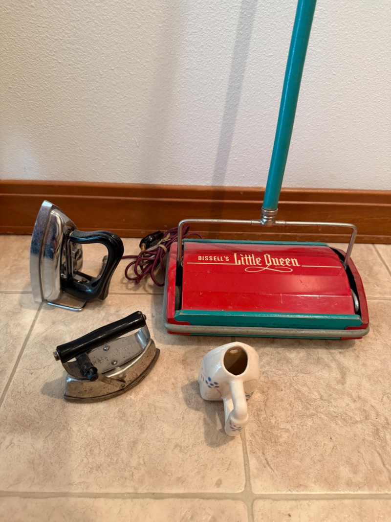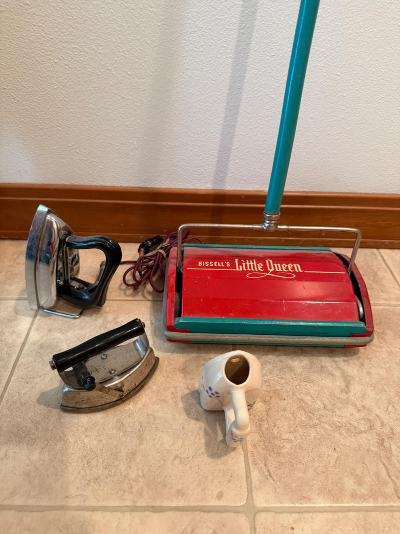 Sad Iron, Mini Iron - Bissell Little Queen Floor Sweeper Asbestos Sad Iron Mini electric iron, untested Ceramic water dispenser Bissell’s Little Queen Carpet Sweeper