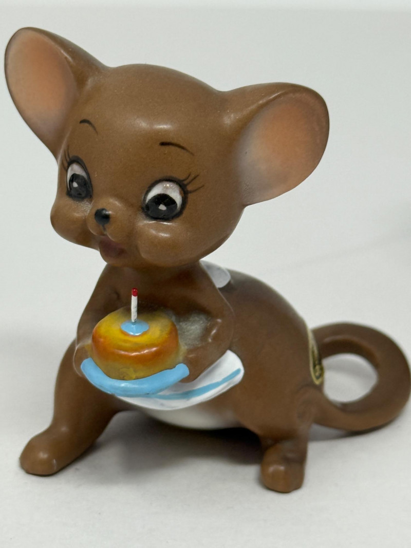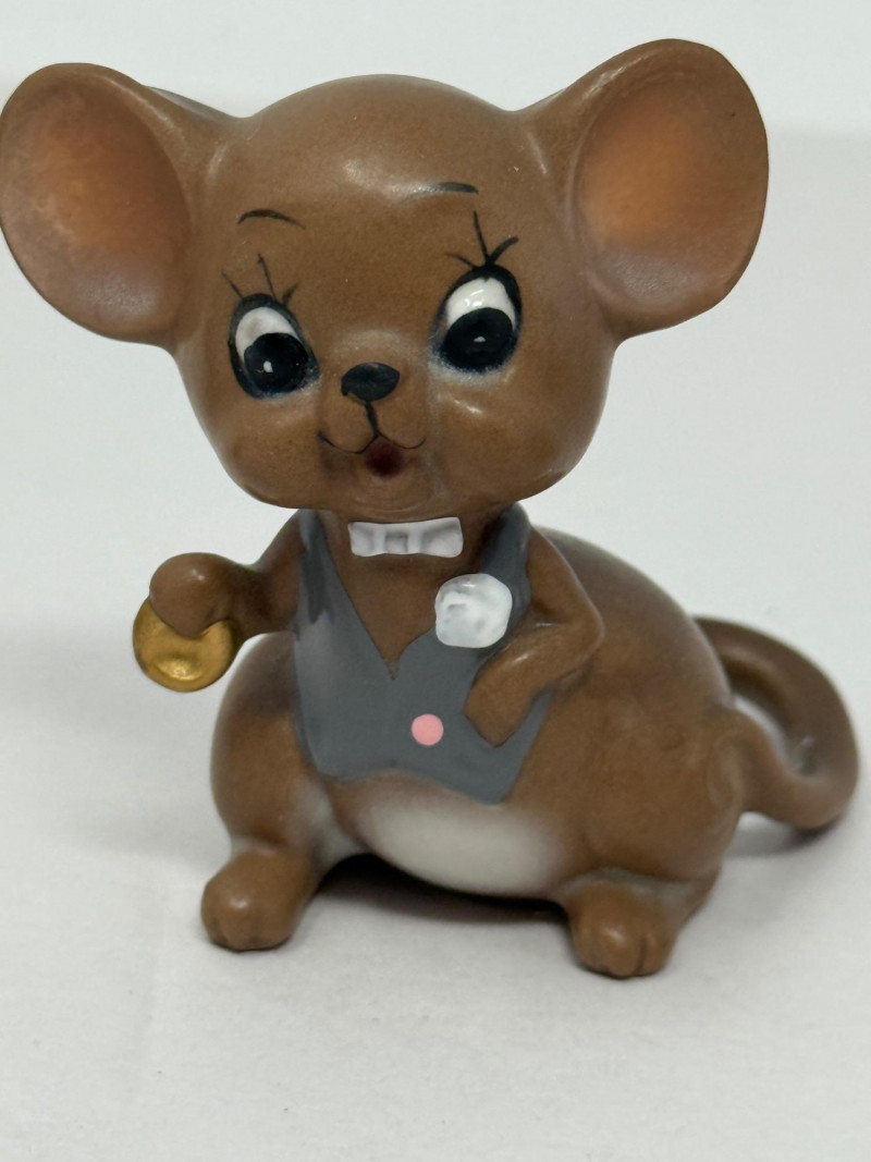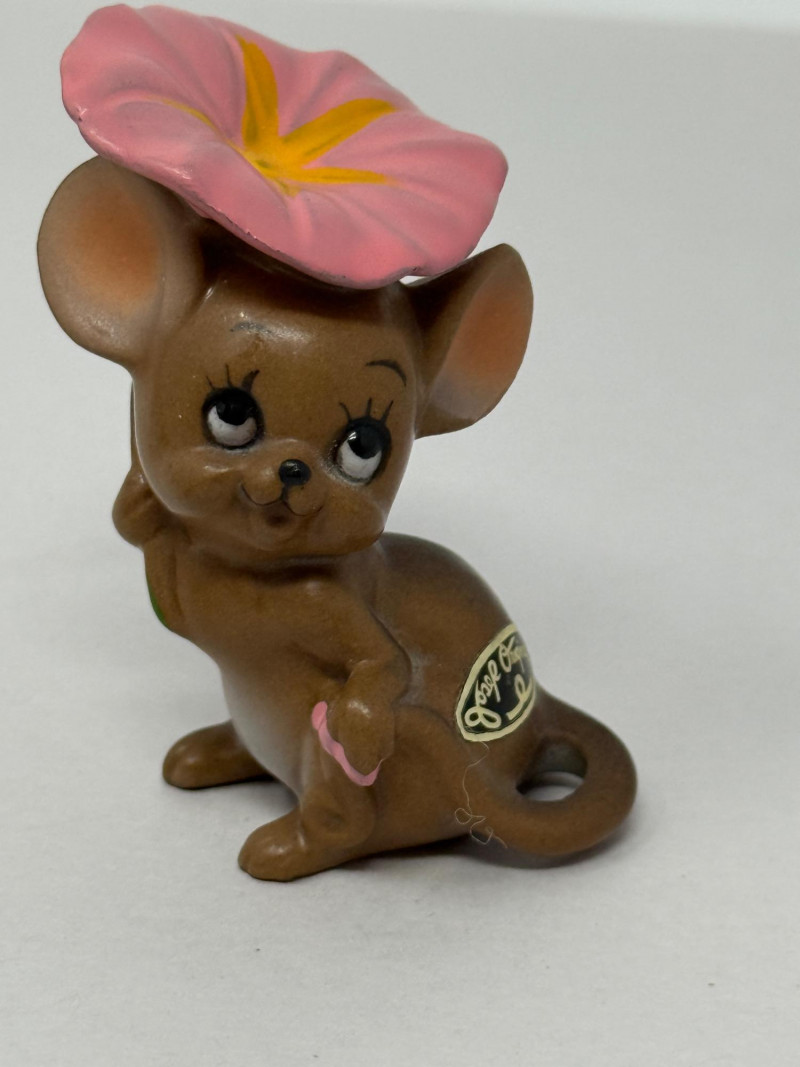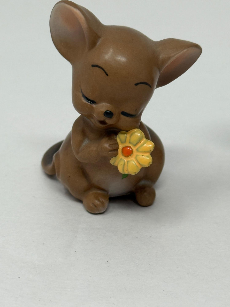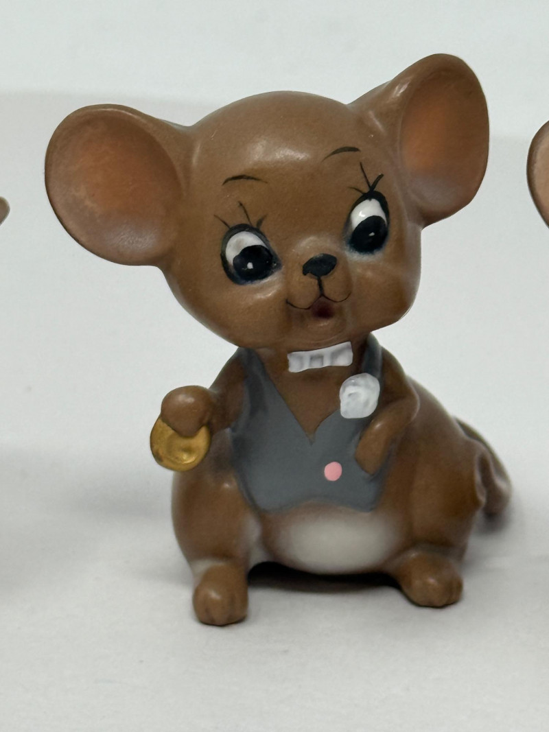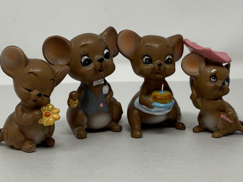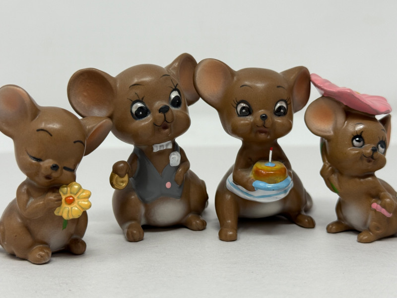 (4) Mini Josef Original Figurines From the Mouse Village Series 2.5” and smaller. 1950's Groomsman Mouse Yellow Daisy Mouse Birthday Mouse Morning Glory Mouse