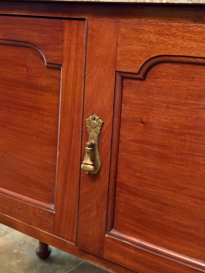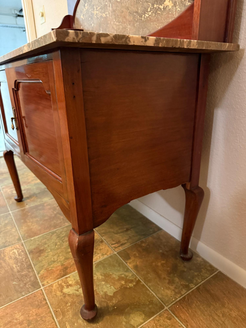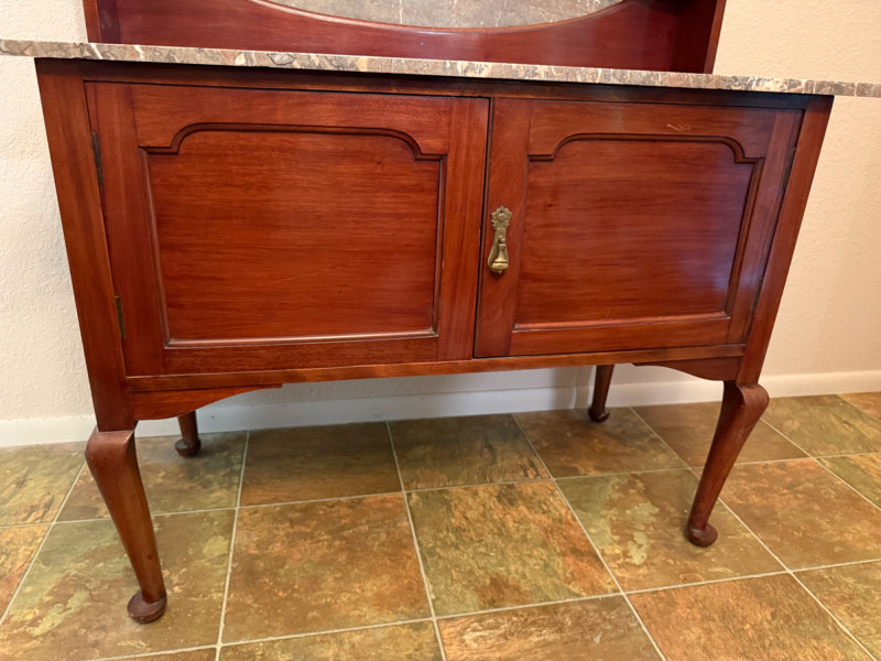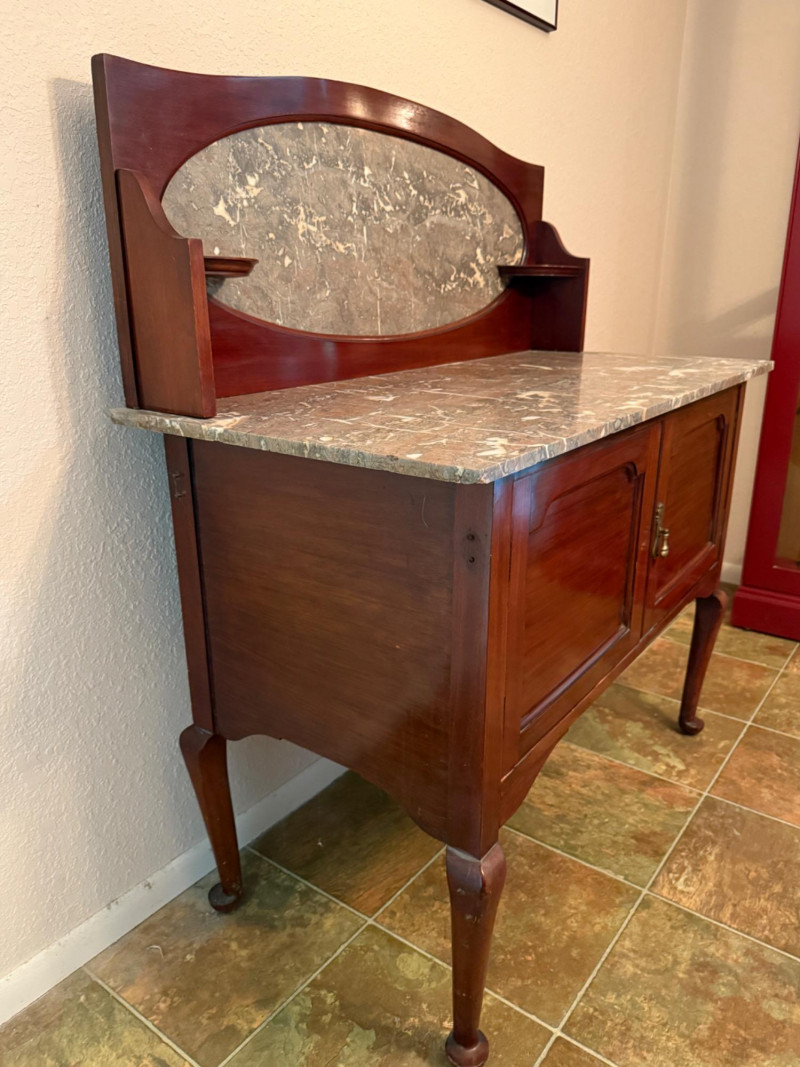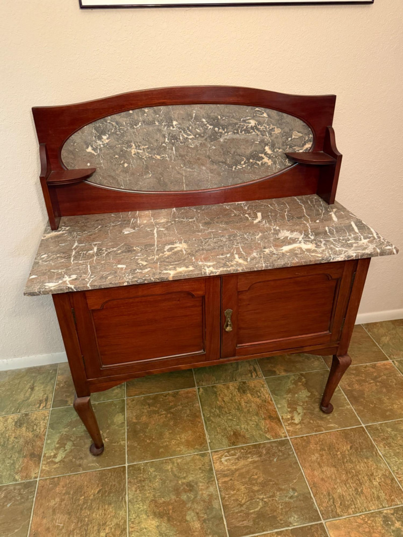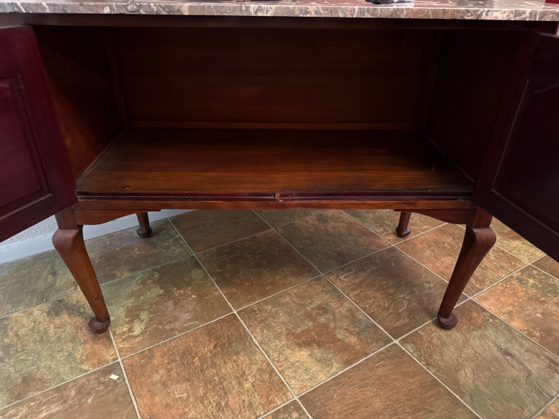 Granite top and back cabinet with cabriolet legs. Possibly a wash table with double doors. This would make a beautiful modern day bath replacement vanity. 42x29x46”