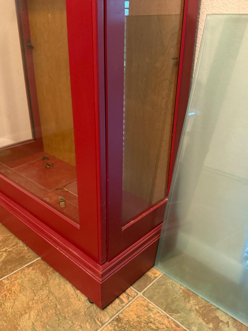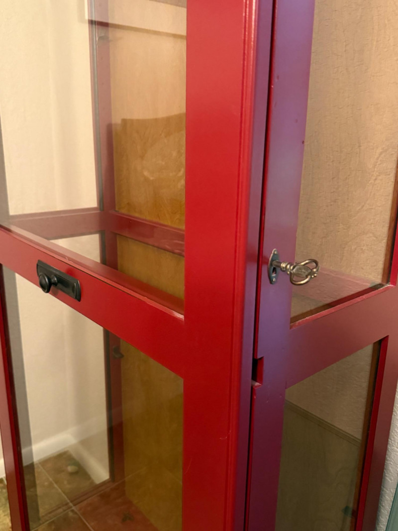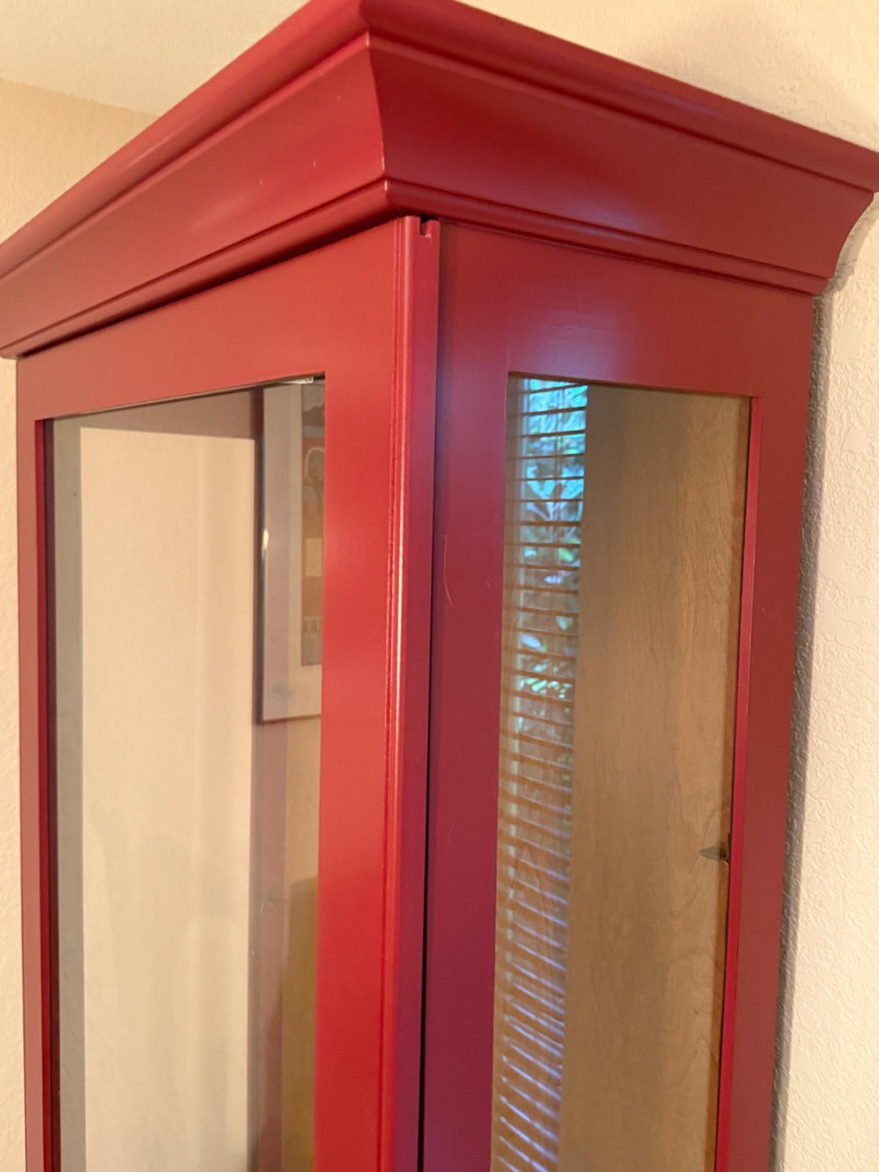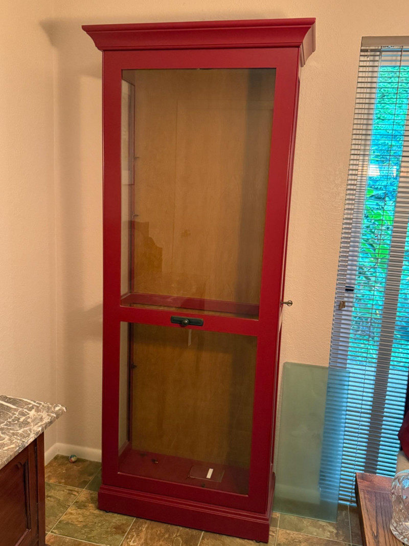 Howard Miller Collector Cabinet. Painted red cabinet with 4 glass shelves. Front door slides. Key inlcuded. 32.5“ x 14.5“ x 78.5“.
