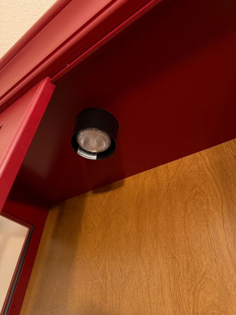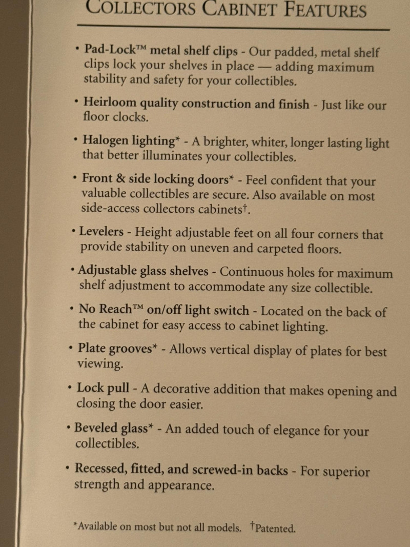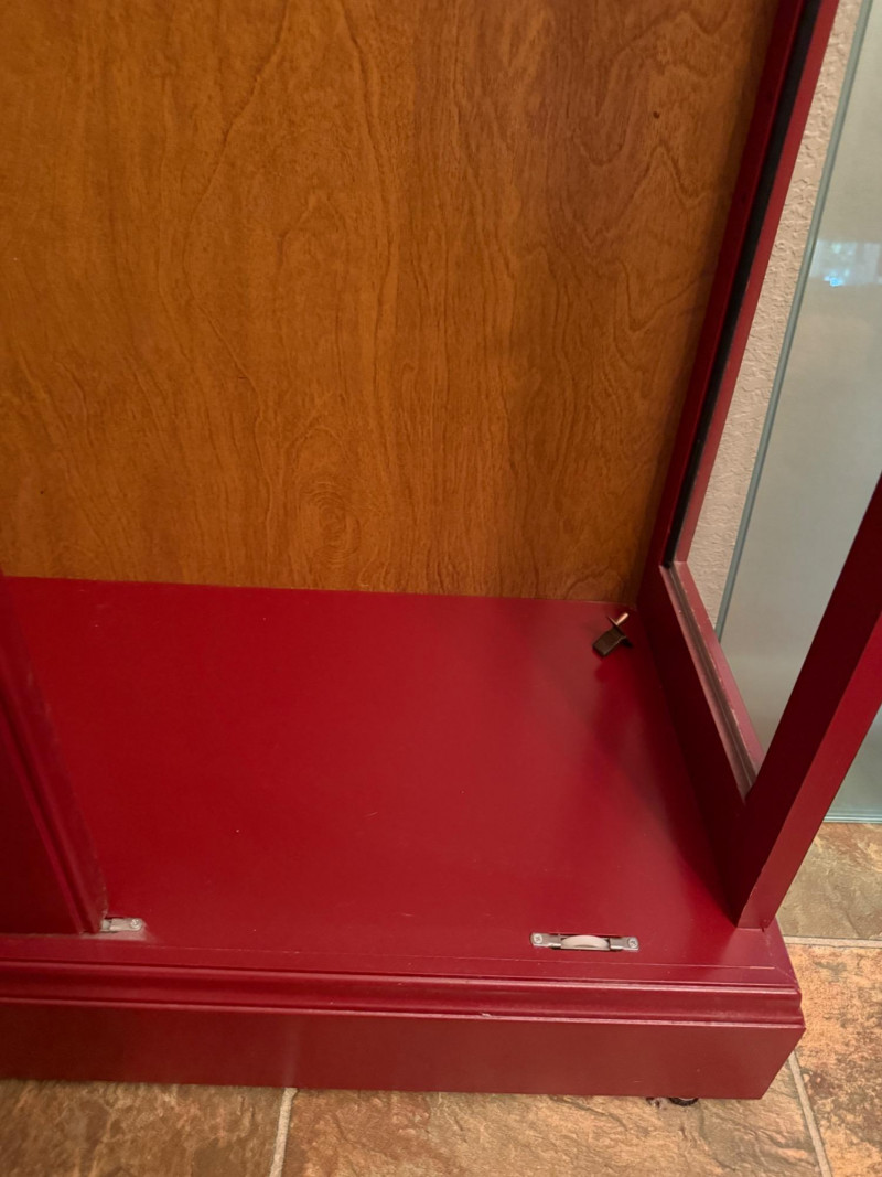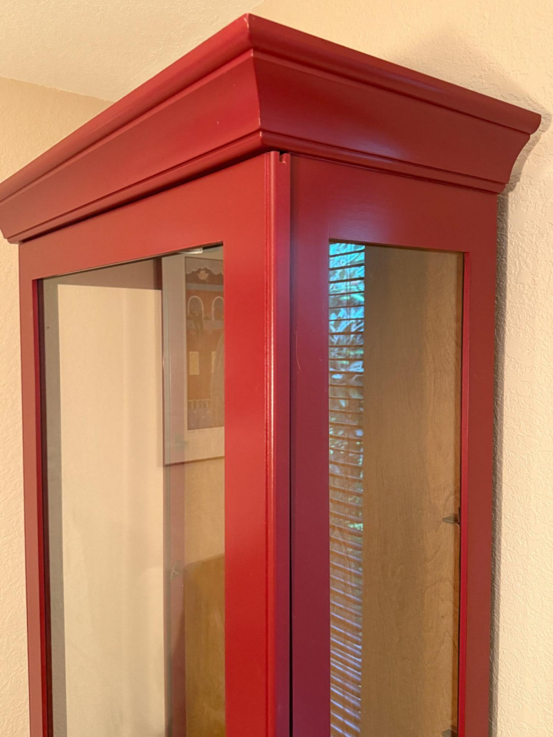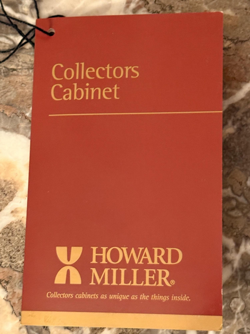 Howard Miller Collector Cabinet. Painted red cabinet with 4 glass shelves. Front door slides. Key inlcuded. 32.5“ x 14.5“ x 78.5“.