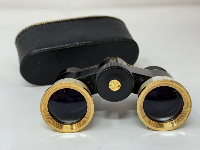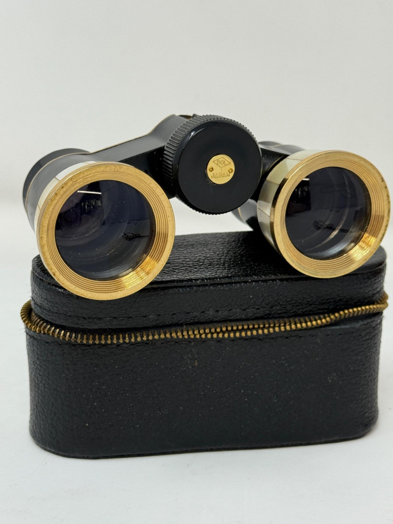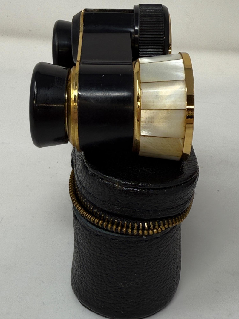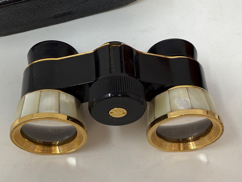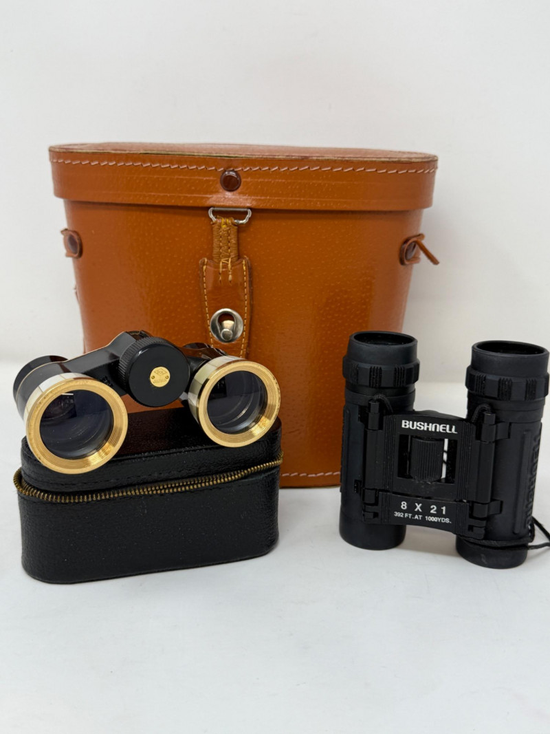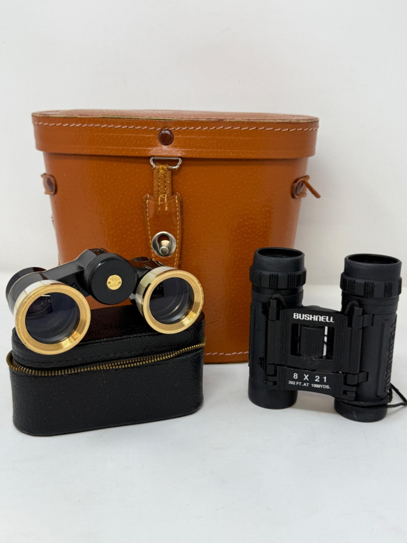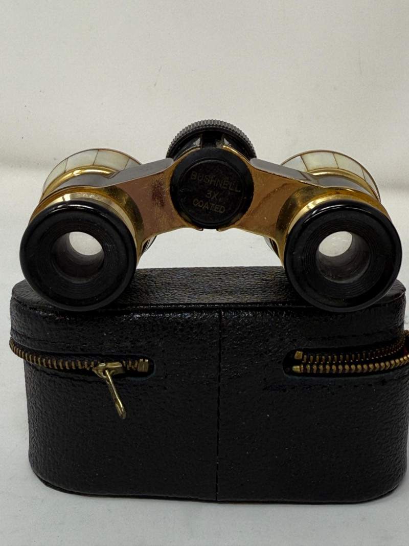 Pair of Bushnell Binoculars & Case Black 8x21 Bushnell compact binoculars Black with gold metal and Mother of Pearl opera binoculars.