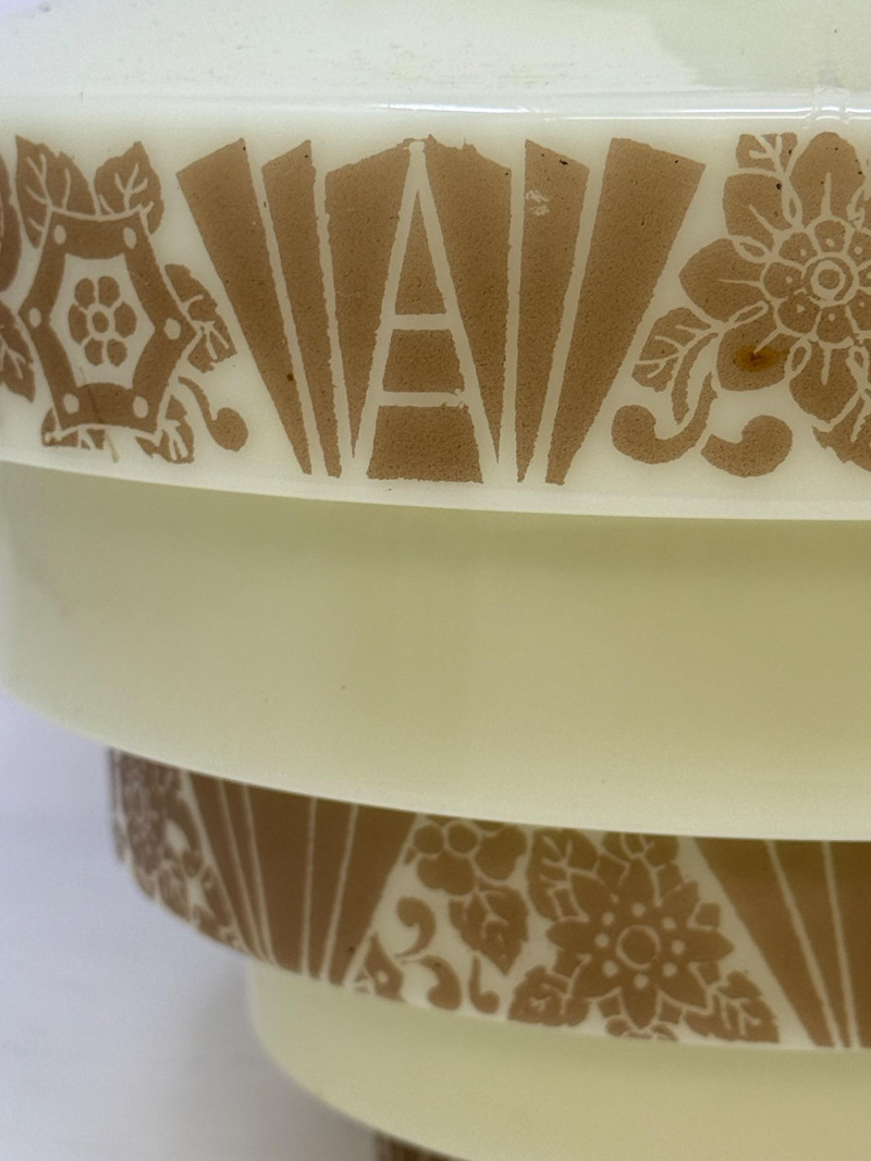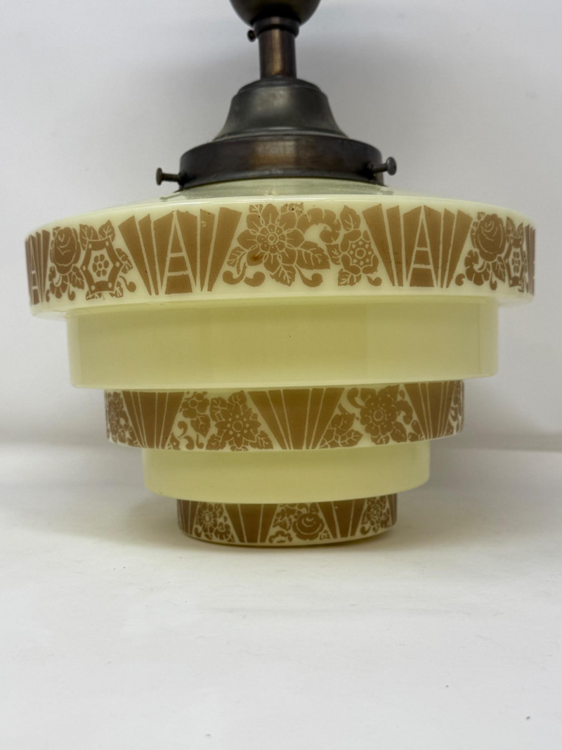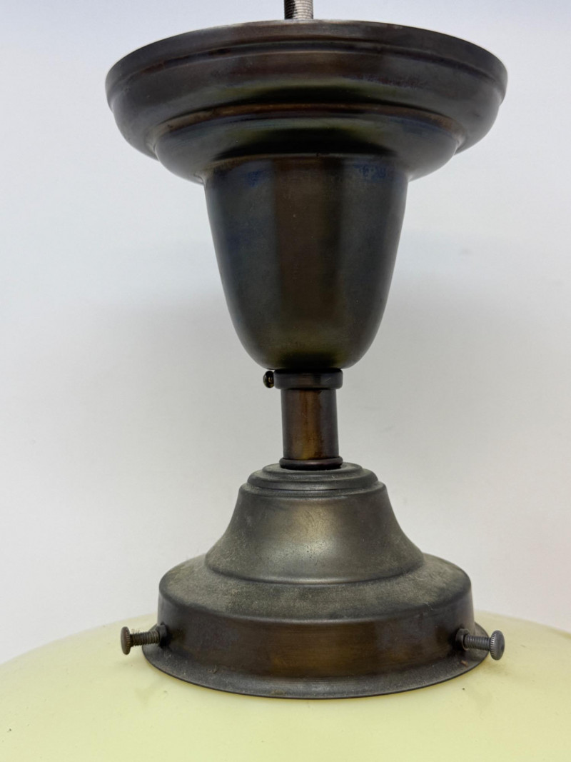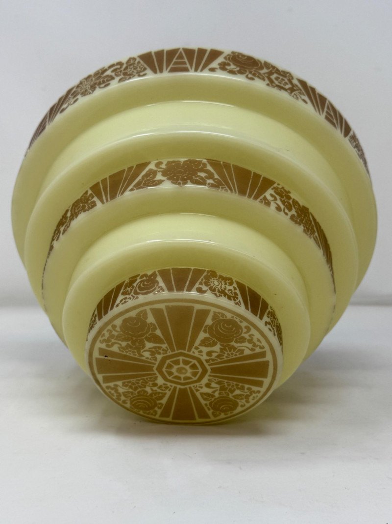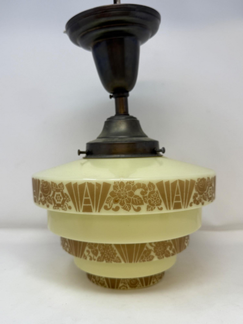 Art Deco lighting fixtures from the 1920s and 1930s are highly sought after for their geometric designs and elegant craftsmanship. These fixtures often feature stepped or tiered shades made of glass or metal, adorned with stylized floral or geometric motifs. Custard glass is a type of uranium glass, popular during this period, providing a soft, warm glow. Complete fixture measures 10 diameter and 14” drop. Not tested.