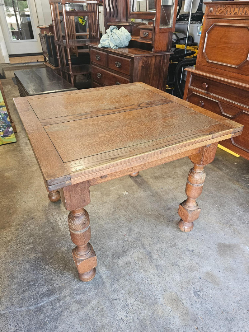 Early 20th Century English Oak Draw-Leaf Table Designed with leaves that slide out from beneath the main tabletop Coverts from 35.5" L to 58.5"L Looks to be in nice vintage condition (see pics) 30"T x 35.5"L x 34.5"W (Collapsed) 33"T x 58.5"L x 34.5"W (Extended)