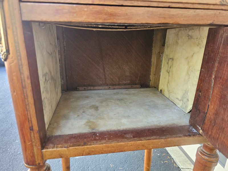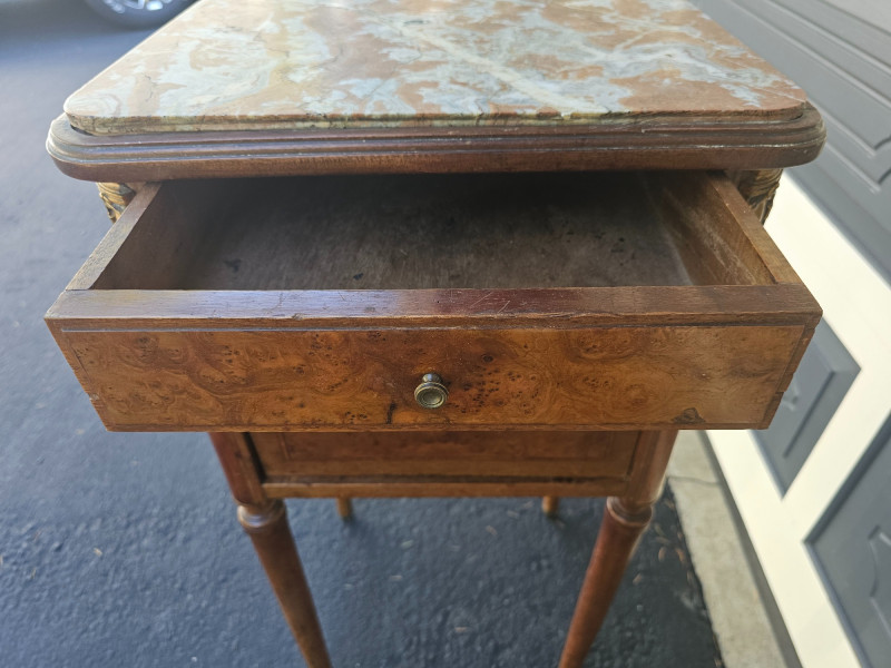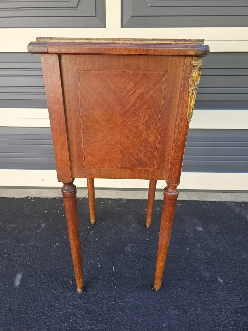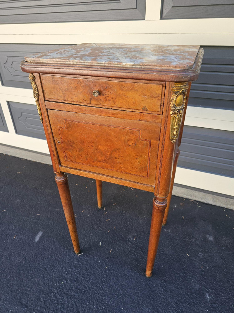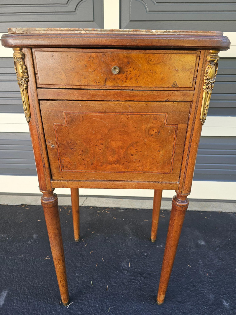 Antique French Louis XVI-Style Marble Top End Table Nice end table or nighstand has a marble top and gold metallic corner trim. Single drawer and cabinet for storage Missing cabinet door knob (screw is intact), normal wear & tear for this age of piece (see pics) 33.5"T x 17.5"W x 15"D