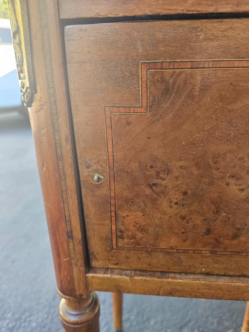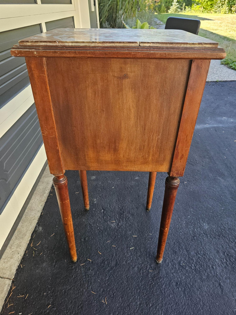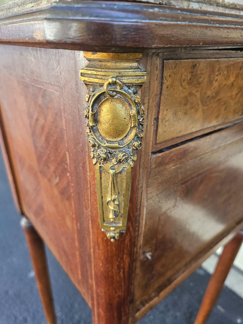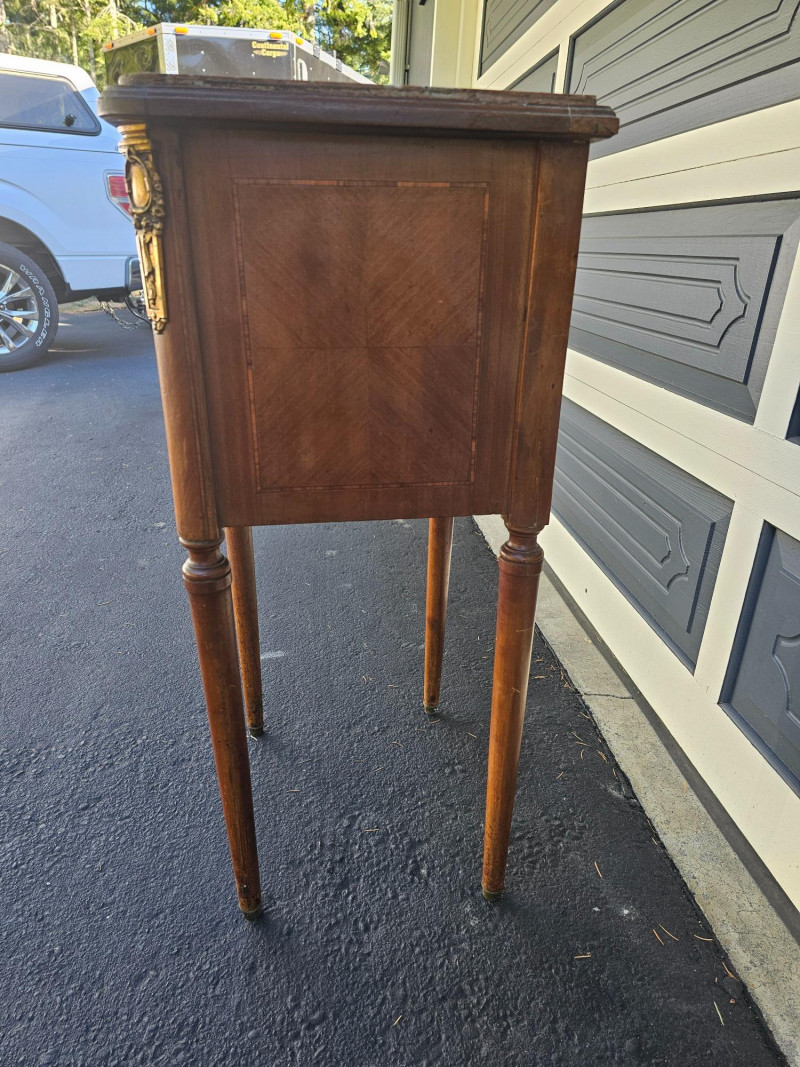 Antique French Louis XVI-Style Marble Top End Table Nice end table or nighstand has a marble top and gold metallic corner trim. Single drawer and cabinet for storage Missing cabinet door knob (screw is intact), normal wear & tear for this age of piece (see pics) 33.5"T x 17.5"W x 15"D