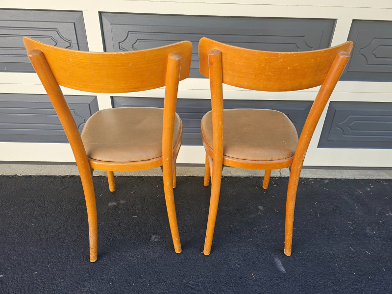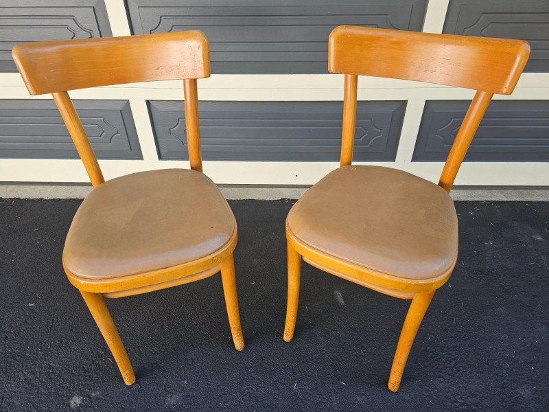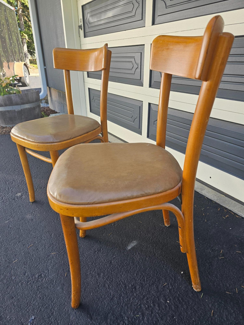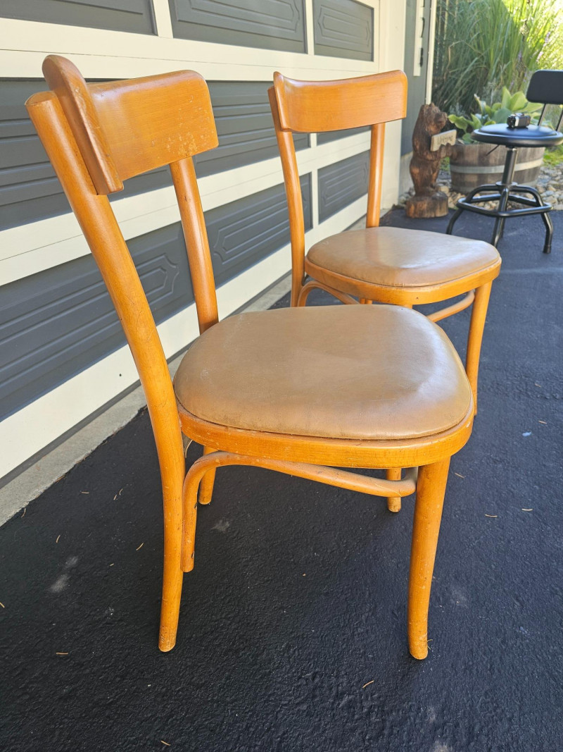 Pair Of Vintage Bentwood Chairs By Dohrmann Hotel Supply Co. Upholstered tan seats Some nicks & scratches consistent with use, but solid furniture 31"T x 17"W x 16"D