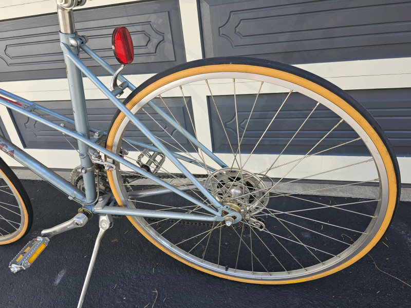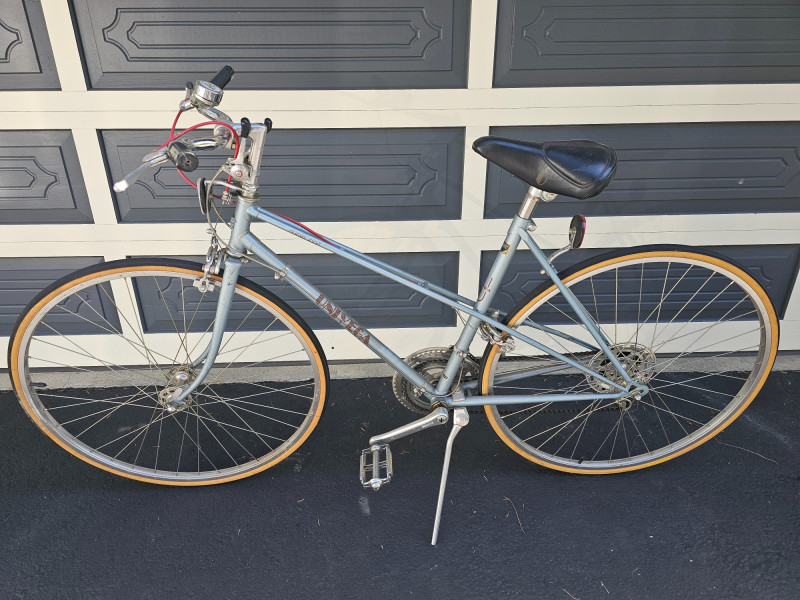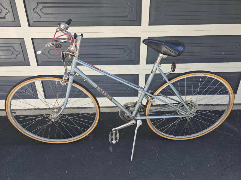Vintage 1980s Univega 12-Speed Nuovo Sport Road Bicycle Suntour V GT-Luxe Derailleur & PowerShift, Dia-Compe brakes Original Univega Padded Saddle Frame is "Light High Tension Steel Tubing" Tires hold air, rims are true, and brakes work Stored in a garage, could use a cleaning up but appears to be in nice original condition. Even a Mickey Mouse bell!