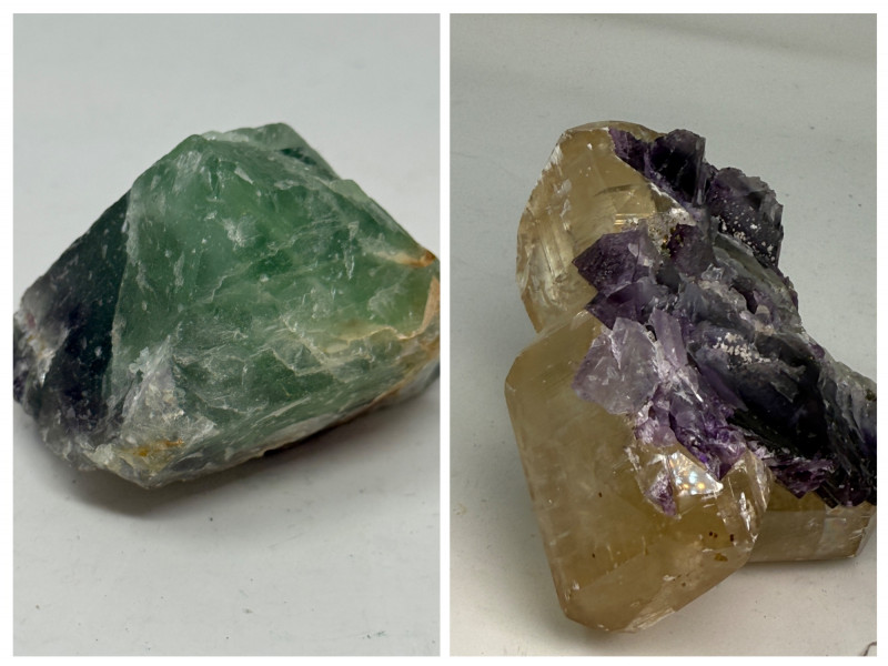 Amethyst Quartz in Clear Calcite Cluster and Green Calcite Amethyst Quartz in Calcite Cluster 23oz This is a really cool cluster of large pieces. Green Calcite 7.7 oz Larger than they appear in photos! Disclaimer: I am not a gemologist. This is my best guess at these stones.