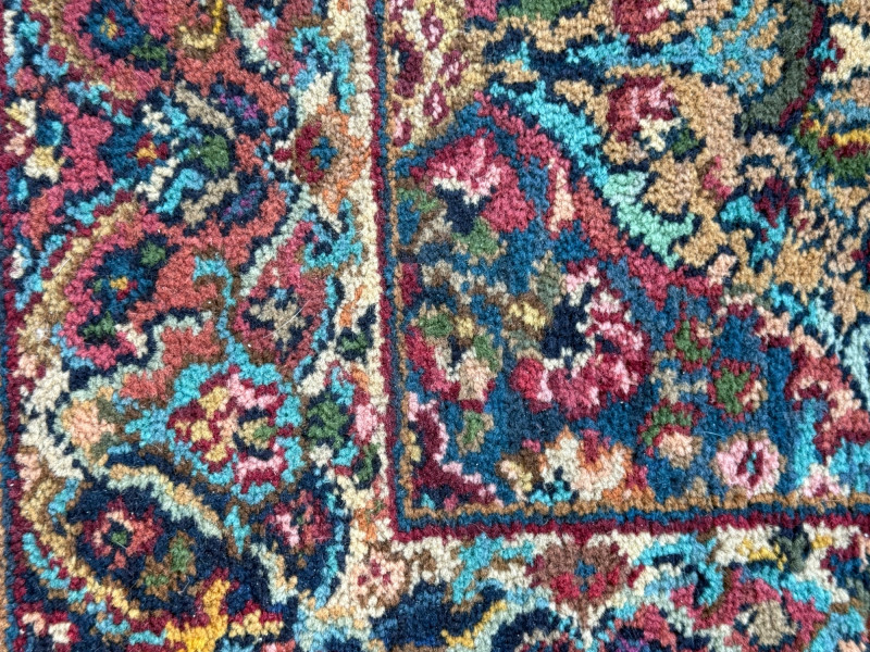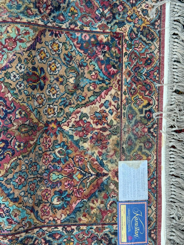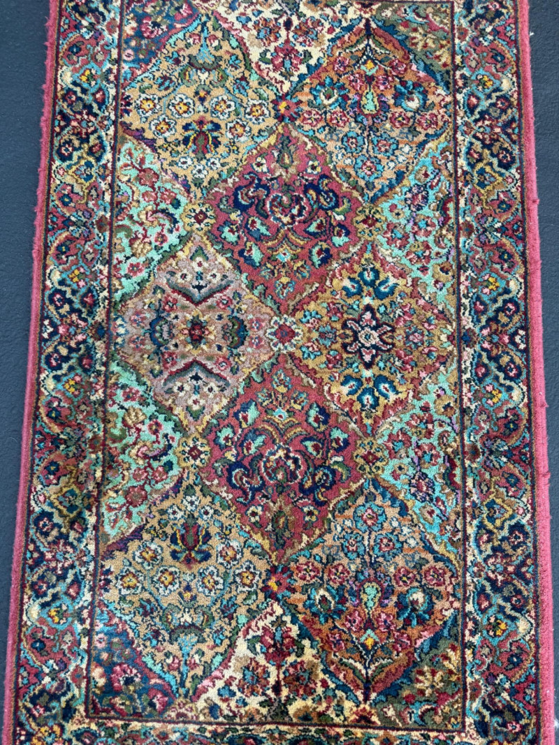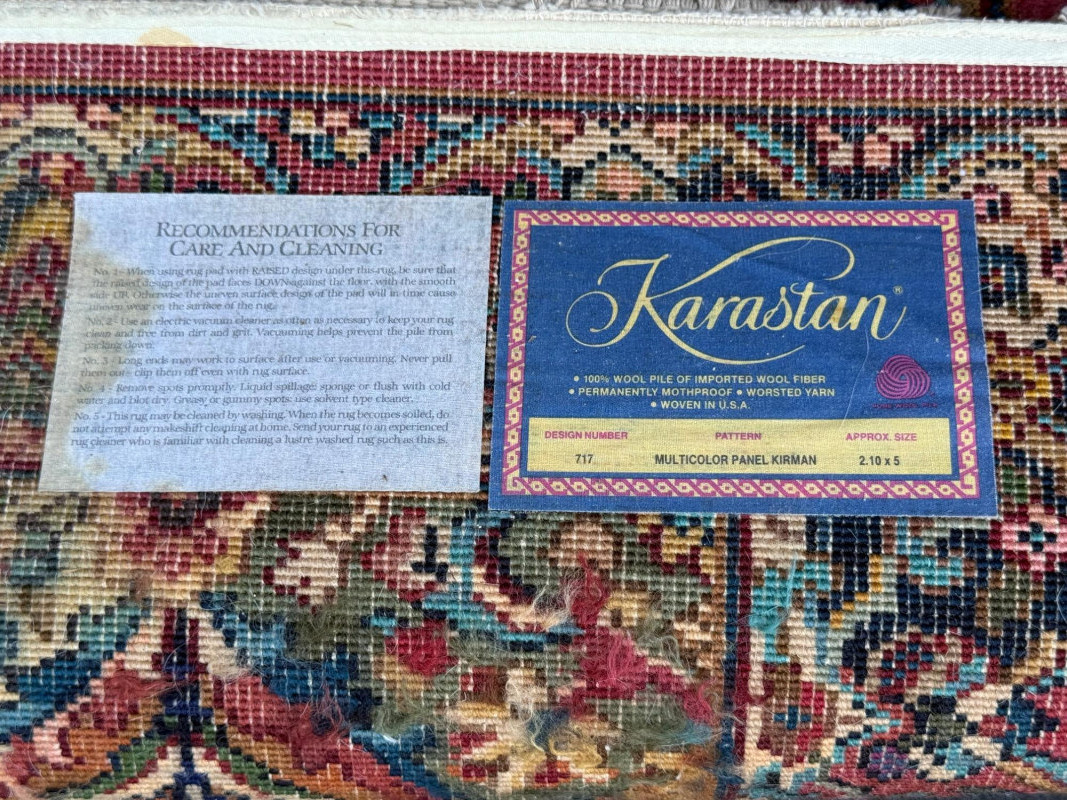 Karastan Machine Loomed Wool Rug Multicolor panel Kirman pattern approximately 34x60" Cat friendly home.