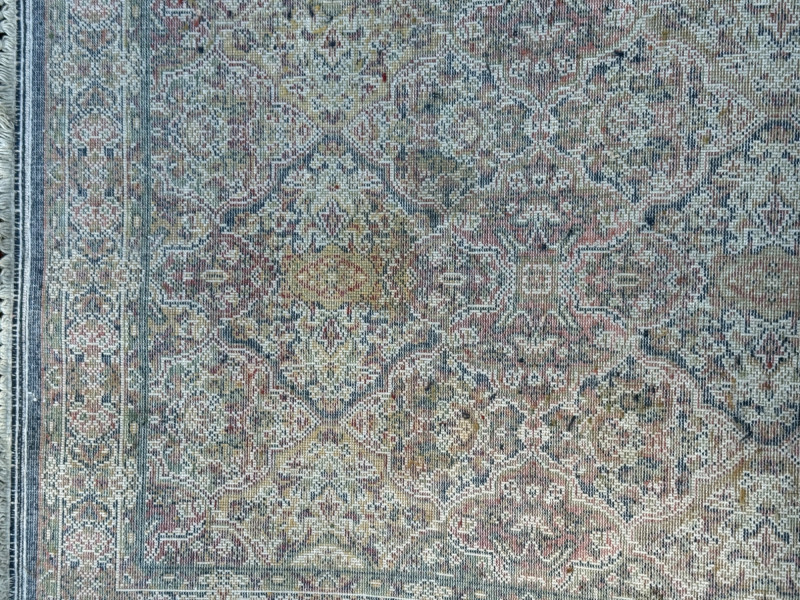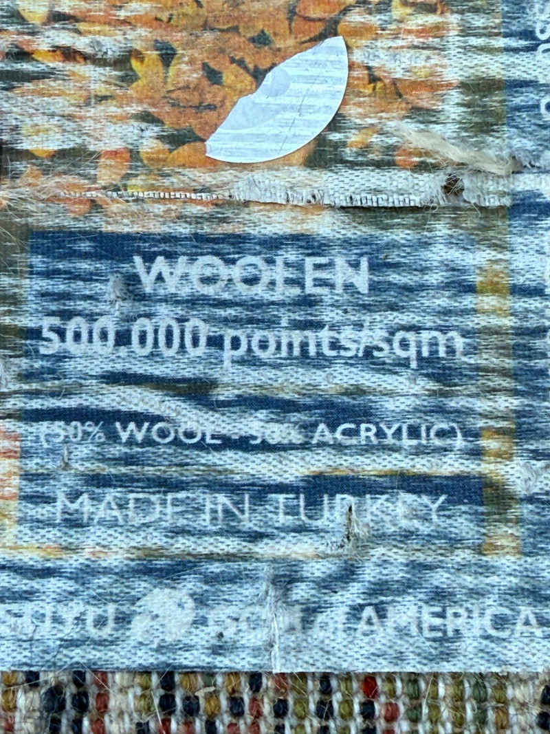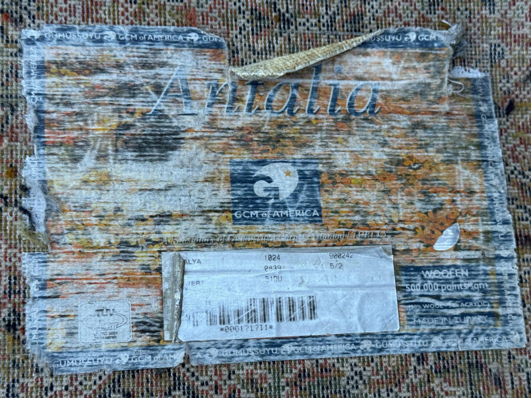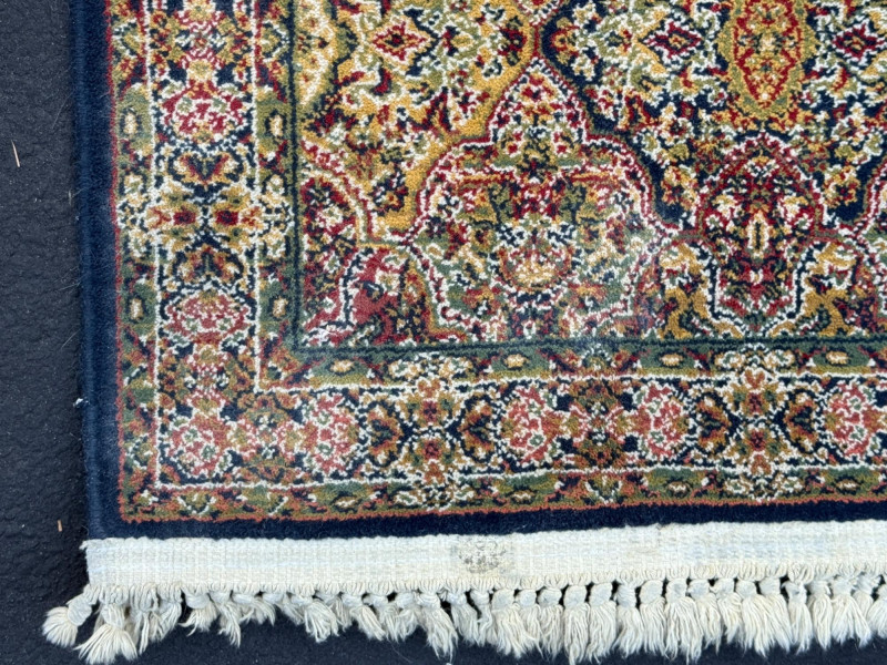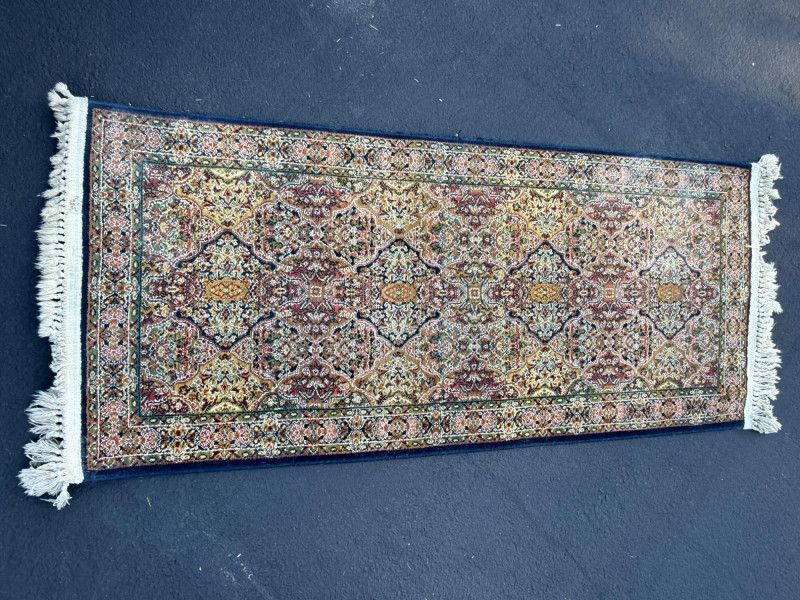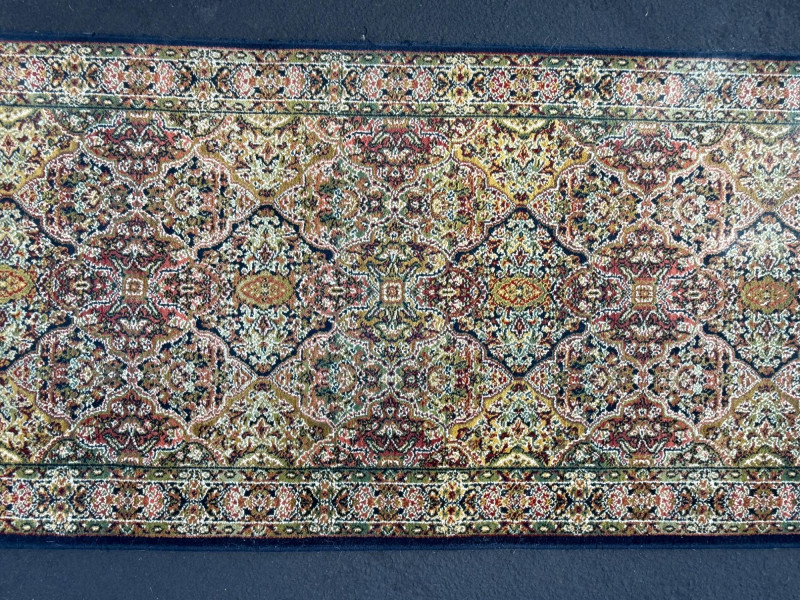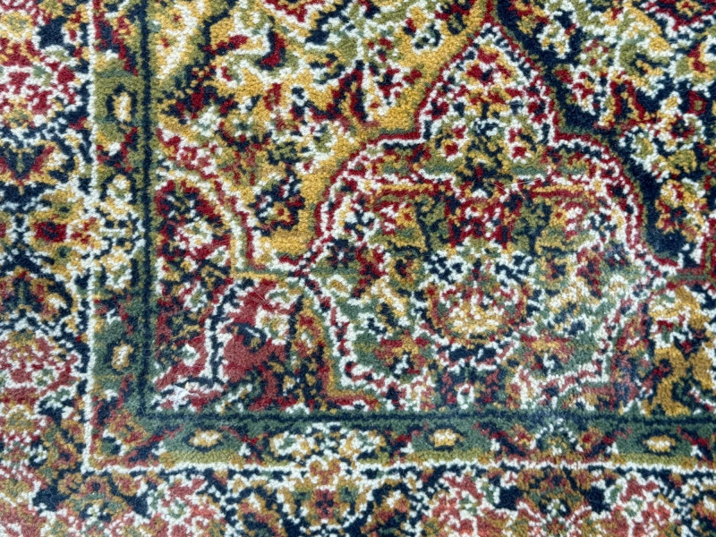 Antalia Turkish Wool Blend Area Rug 60x26” Green, yellow, and red with dark blue border. Cat friendly home.