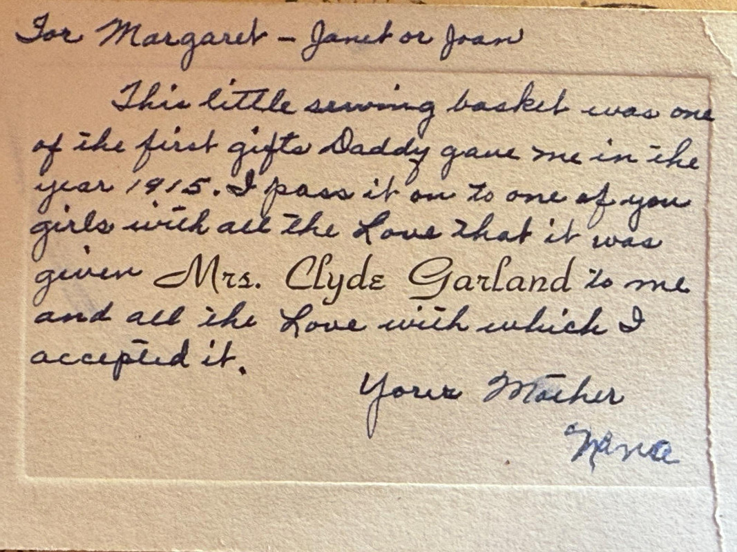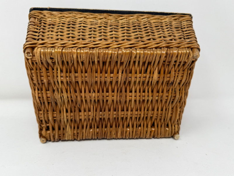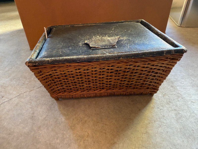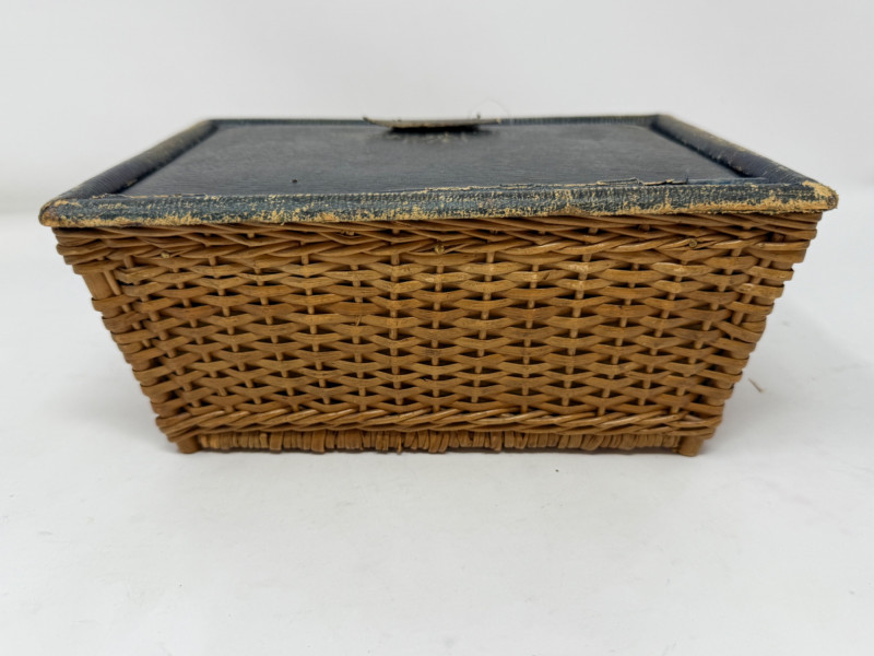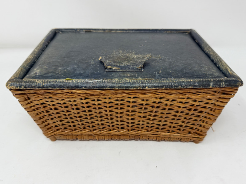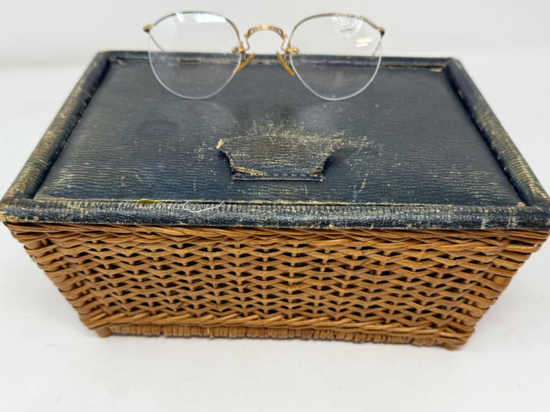 Leather lid on a wicker basket. 1915 Sewing Basket & Contents & Antique Magnifying Glasses. 8x6.5x3.5” Old buttons, measuring tapes, ribbon and treasures.