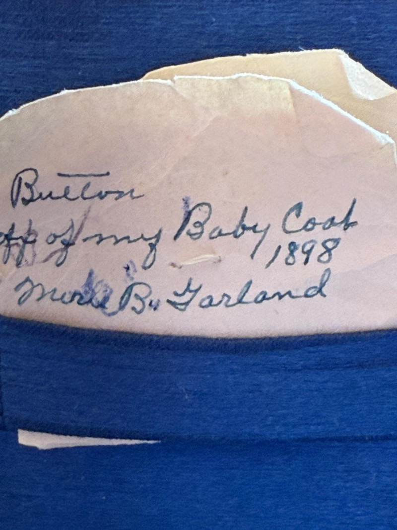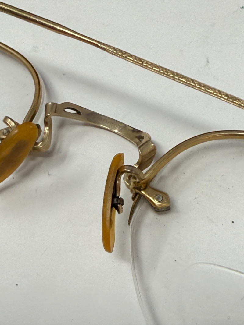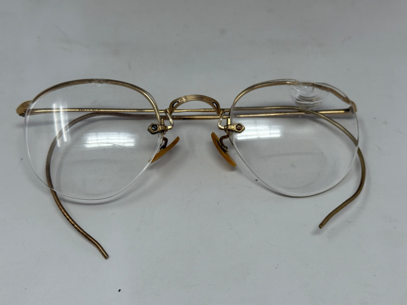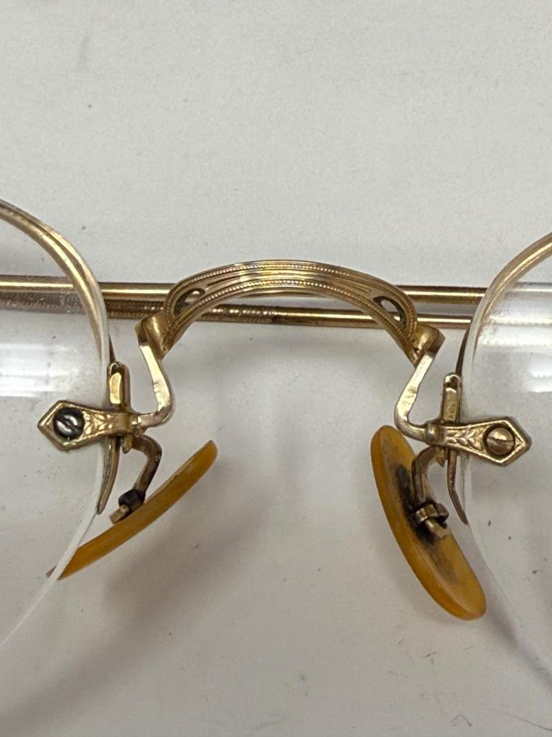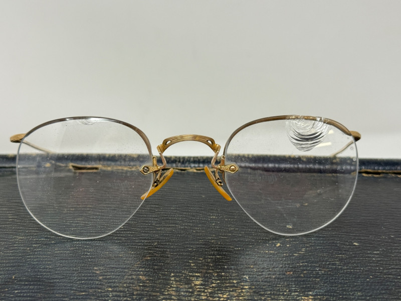 Leather lid on a wicker basket. 1915 Sewing Basket & Contents & Antique Magnifying Glasses. 8x6.5x3.5” Old buttons, measuring tapes, ribbon and treasures.