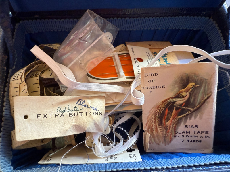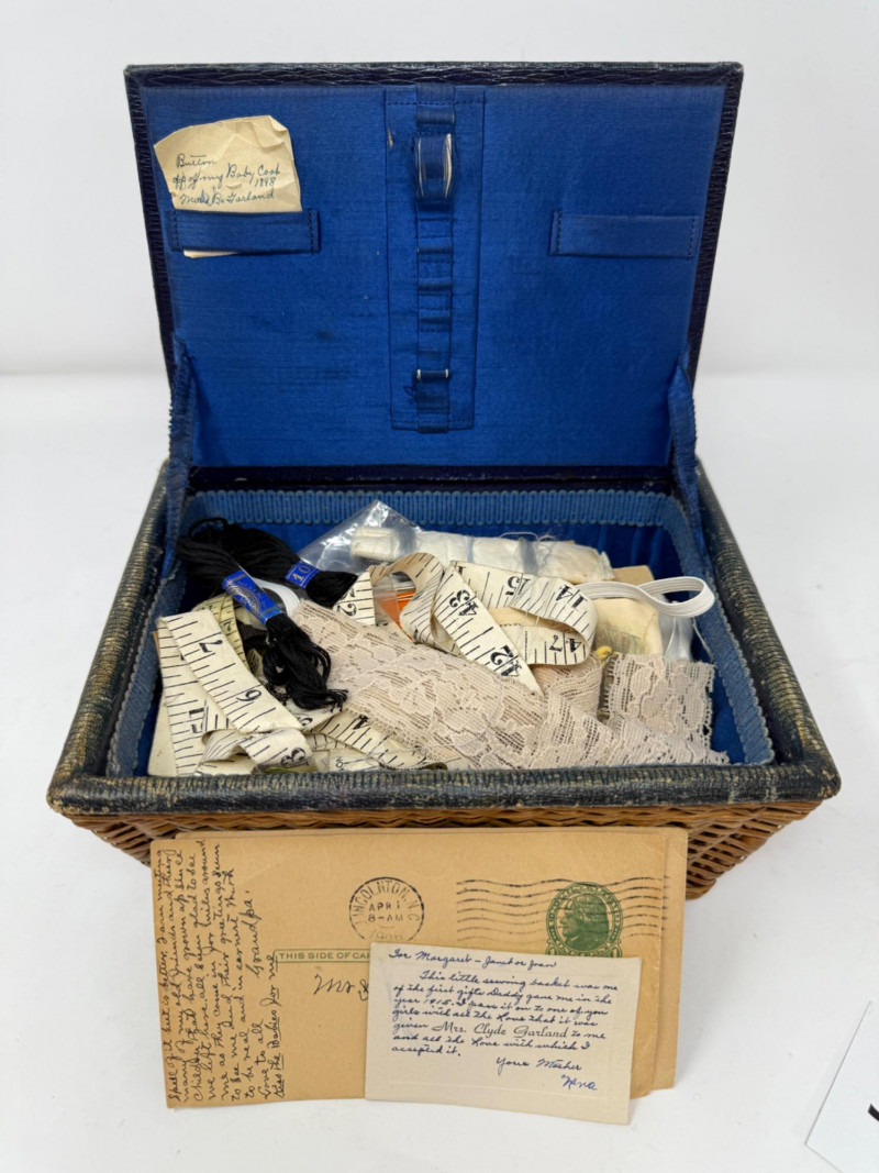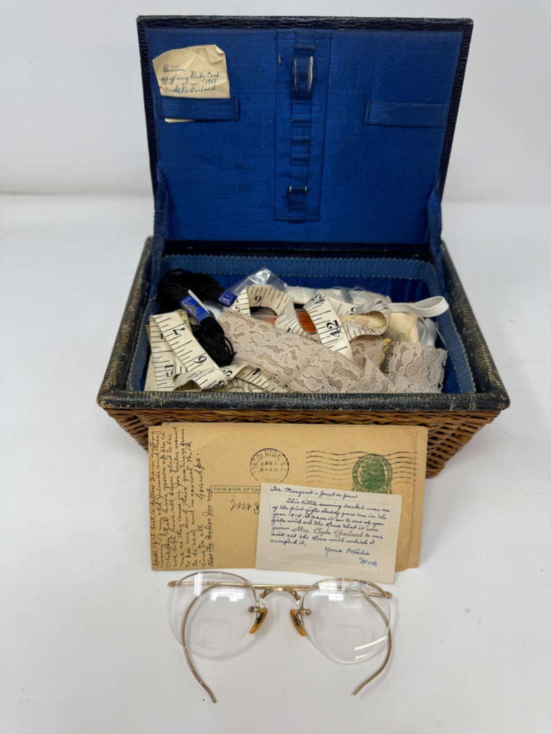 Lot # 74 - 1915 Sewing Basket & Contents & Antique Magnifying Glasses
