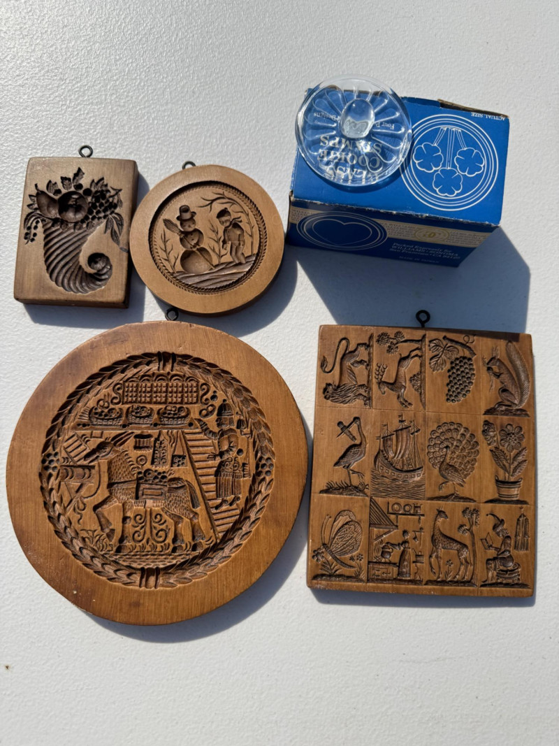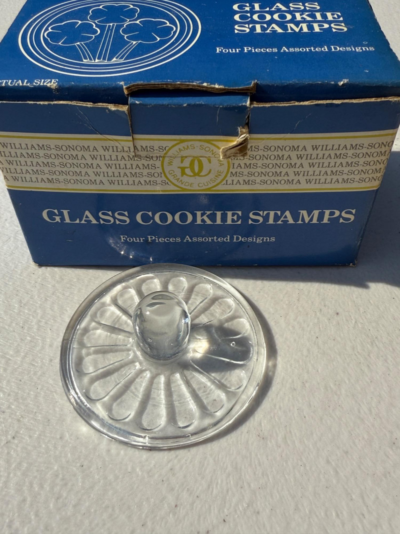(8) Wood and Glass Cookie Presses Set of 4 in box vintage Williams Sonoma glass presses Largest round press is 7”