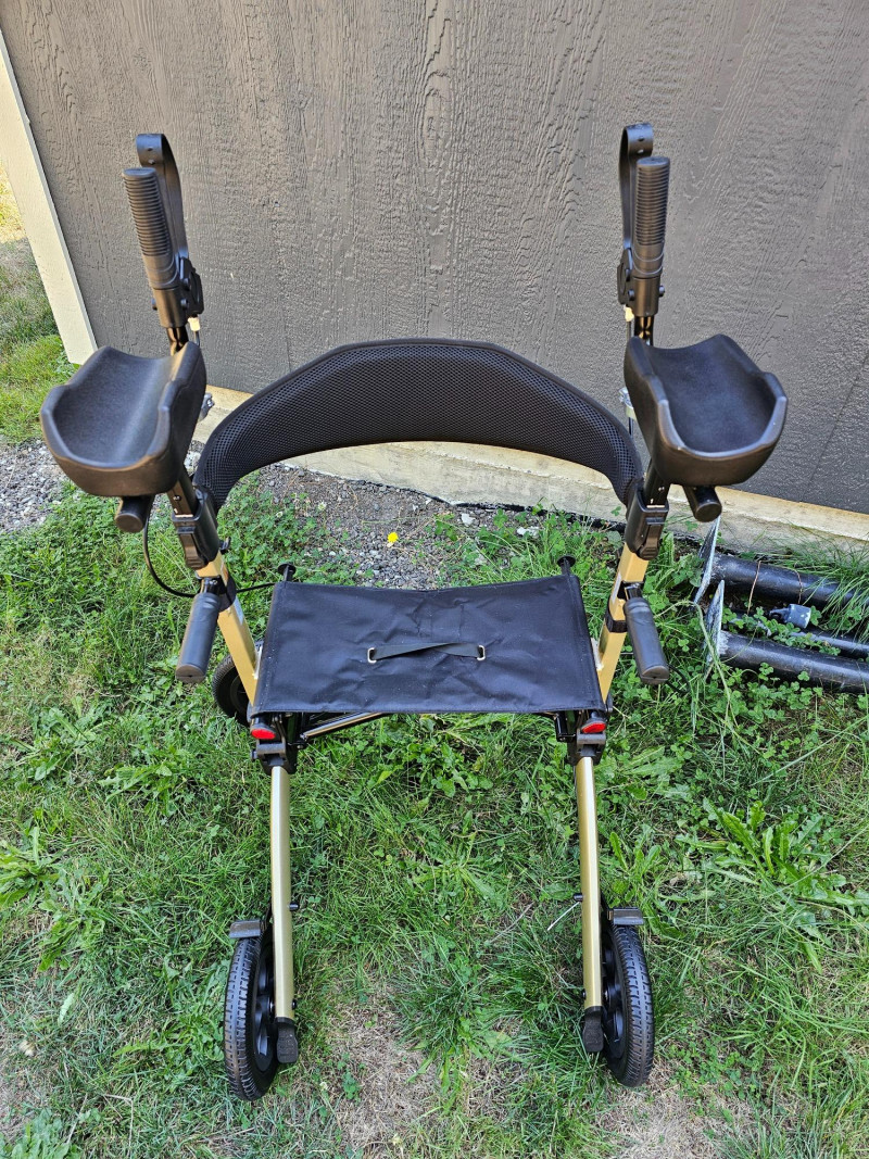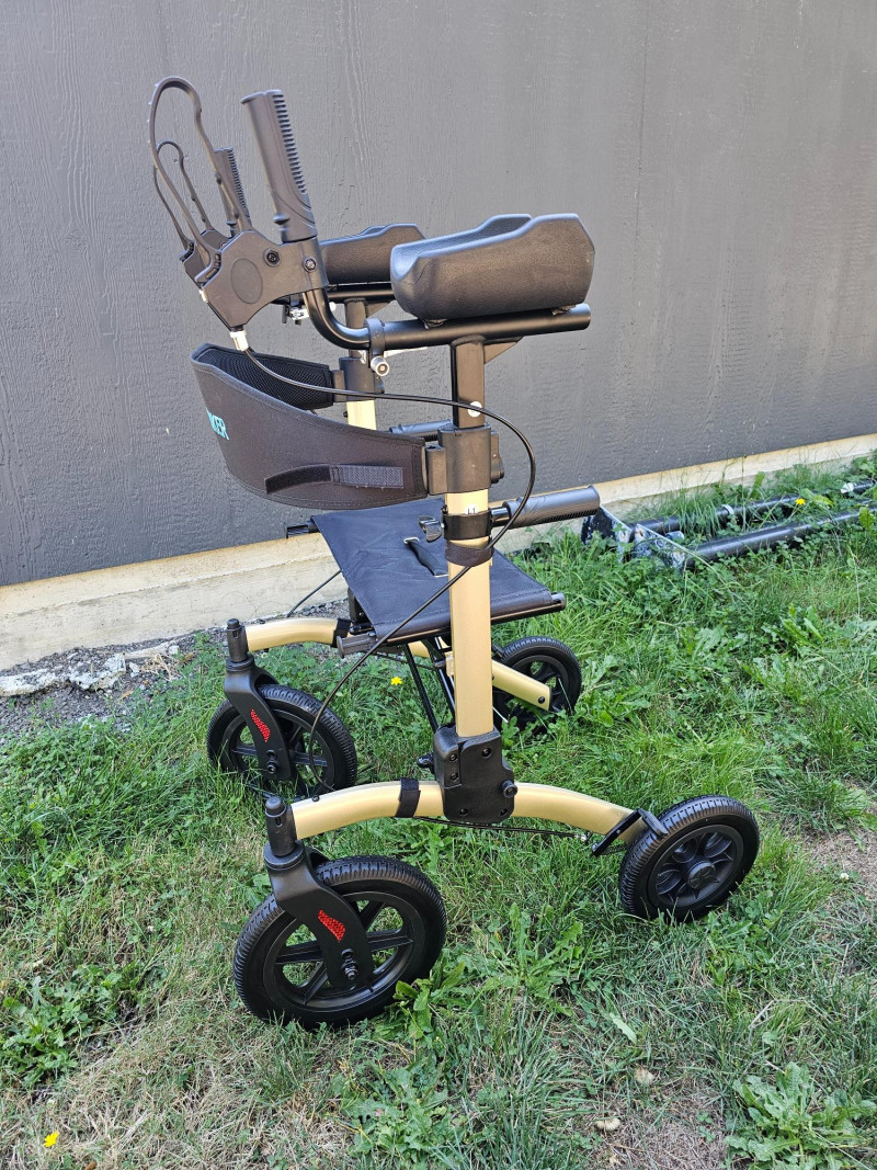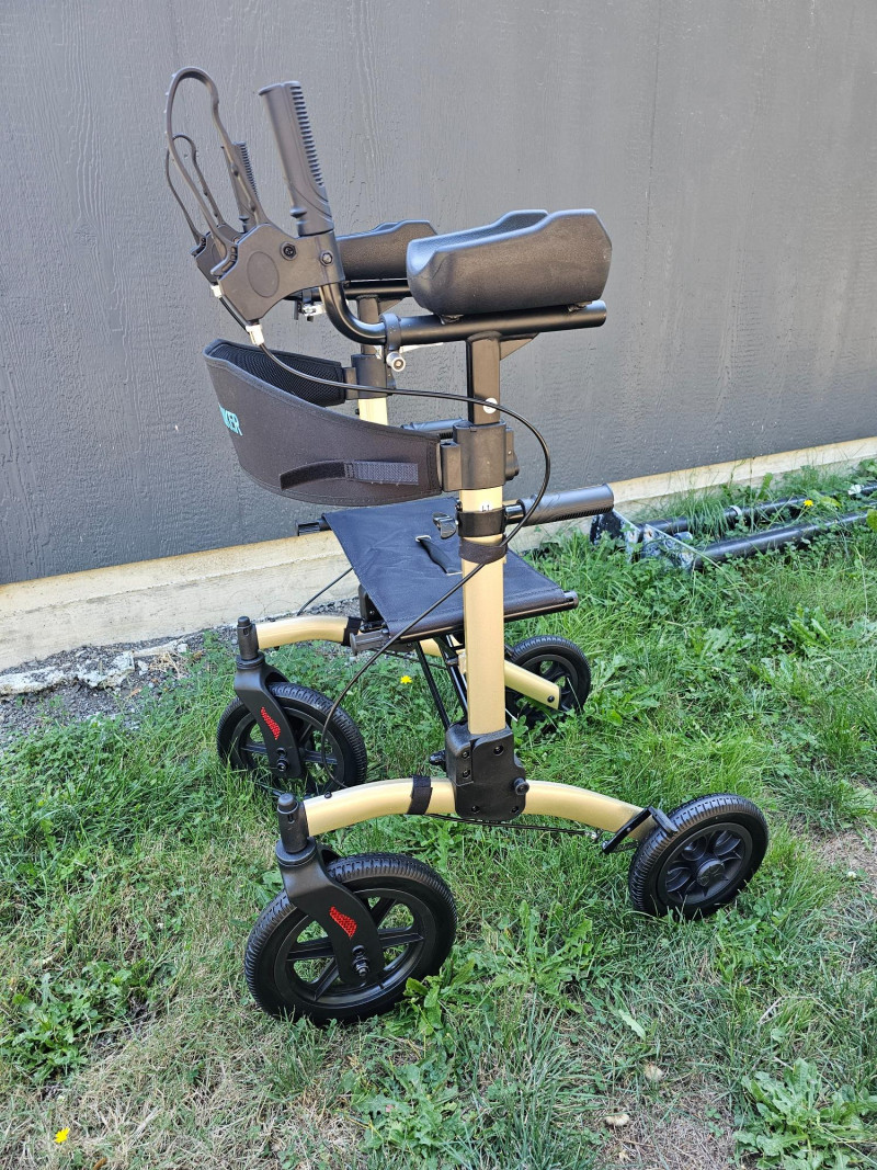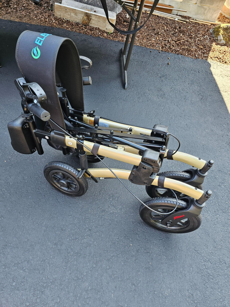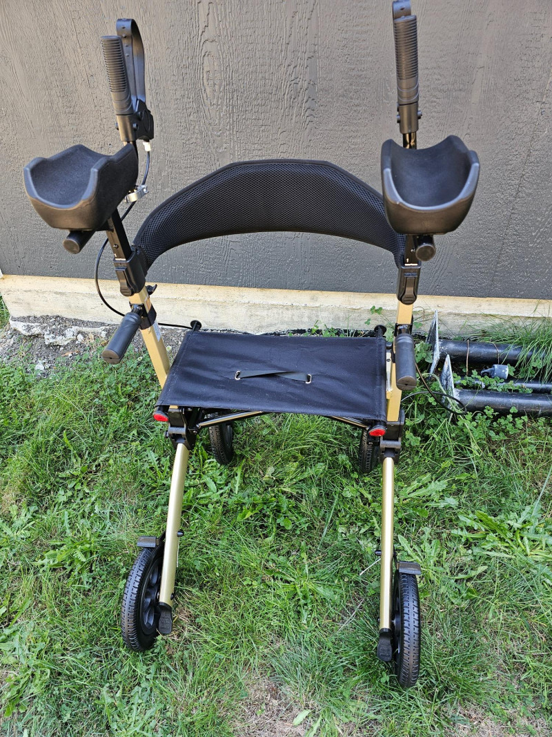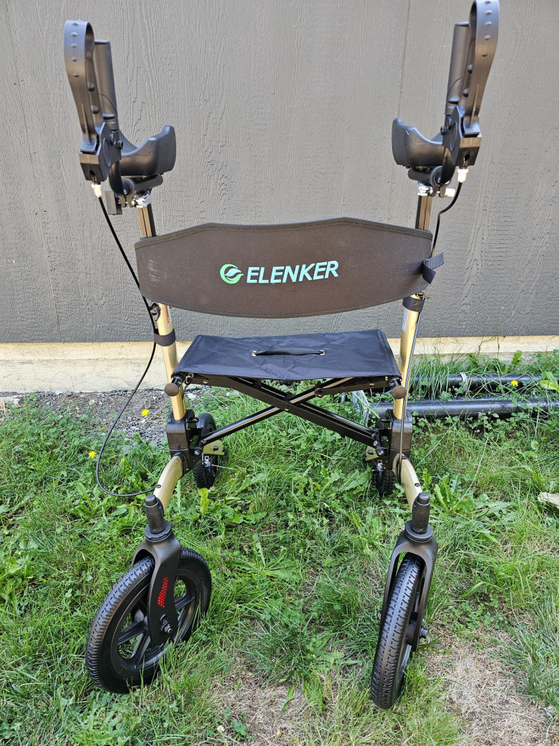 Elenker All-Terrain Rollator Walker Non-pneumatic 12” front rubber tires & 10" rear rubber tires allow for safe and comfortable movement on all surfaces Dual handbrakes for safety Fully adjustable for different sized people Folds up for easy storage or transport This unit is like new! 44.5"T x 31"L x 26"W