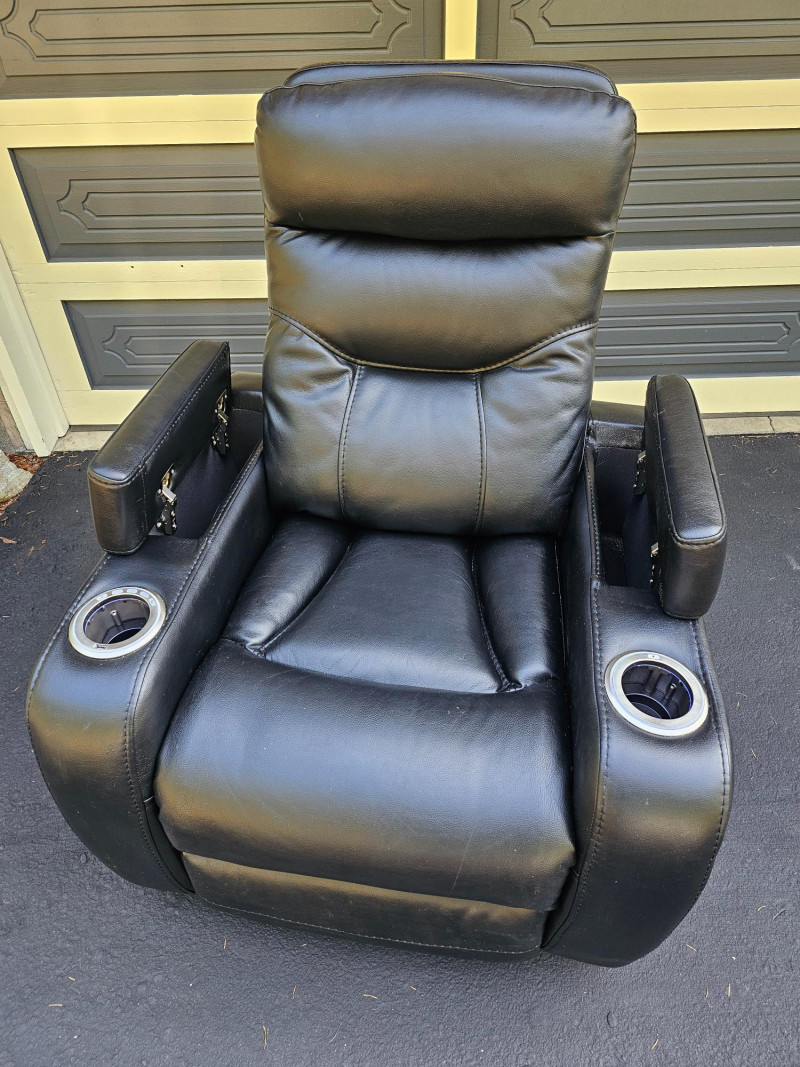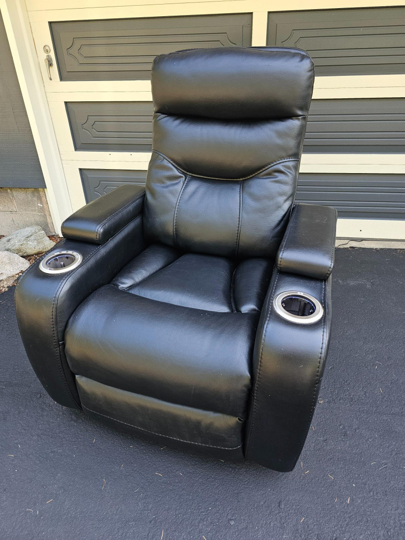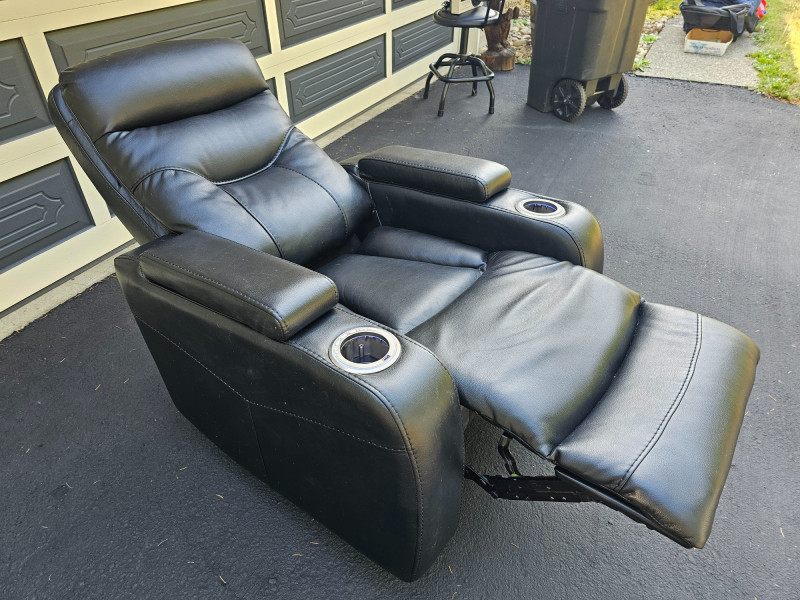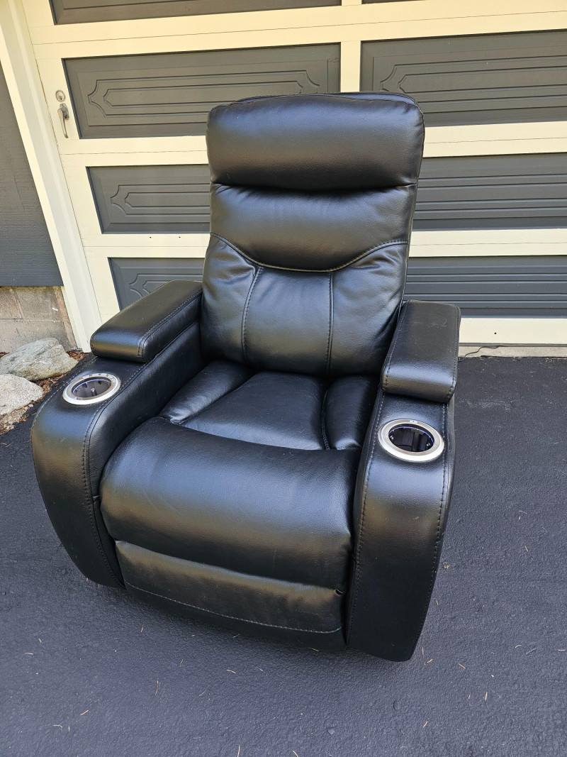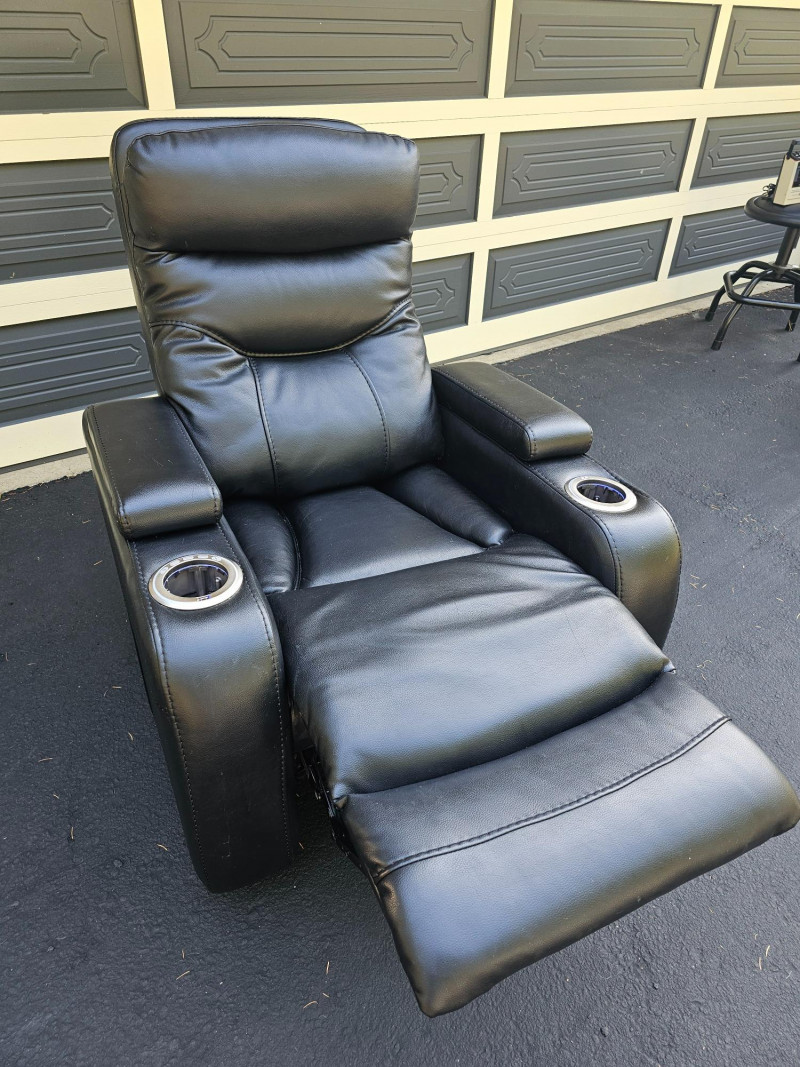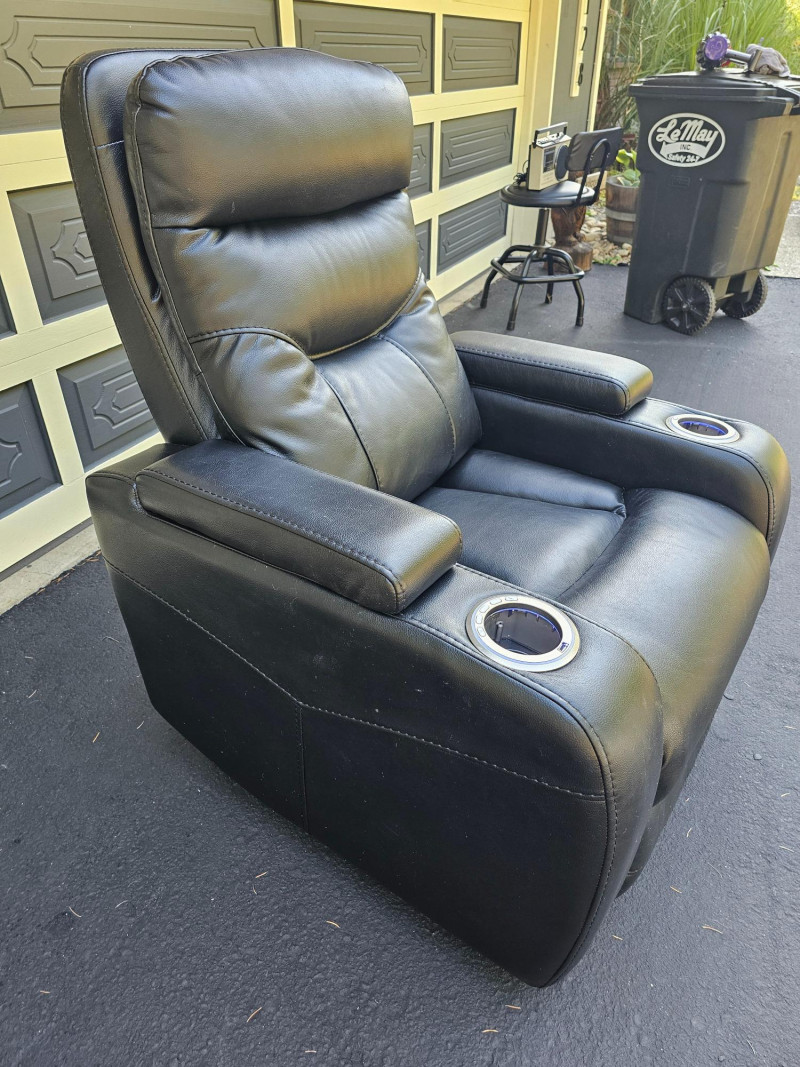 Black Faux Leather Power Theater Recliner Power recliner has blue illuminated cupholders and 2 armrest storage compartments Could use a thorough surface cleaning (see pics) Tested - Works! 42"T x 34"W x 34"D