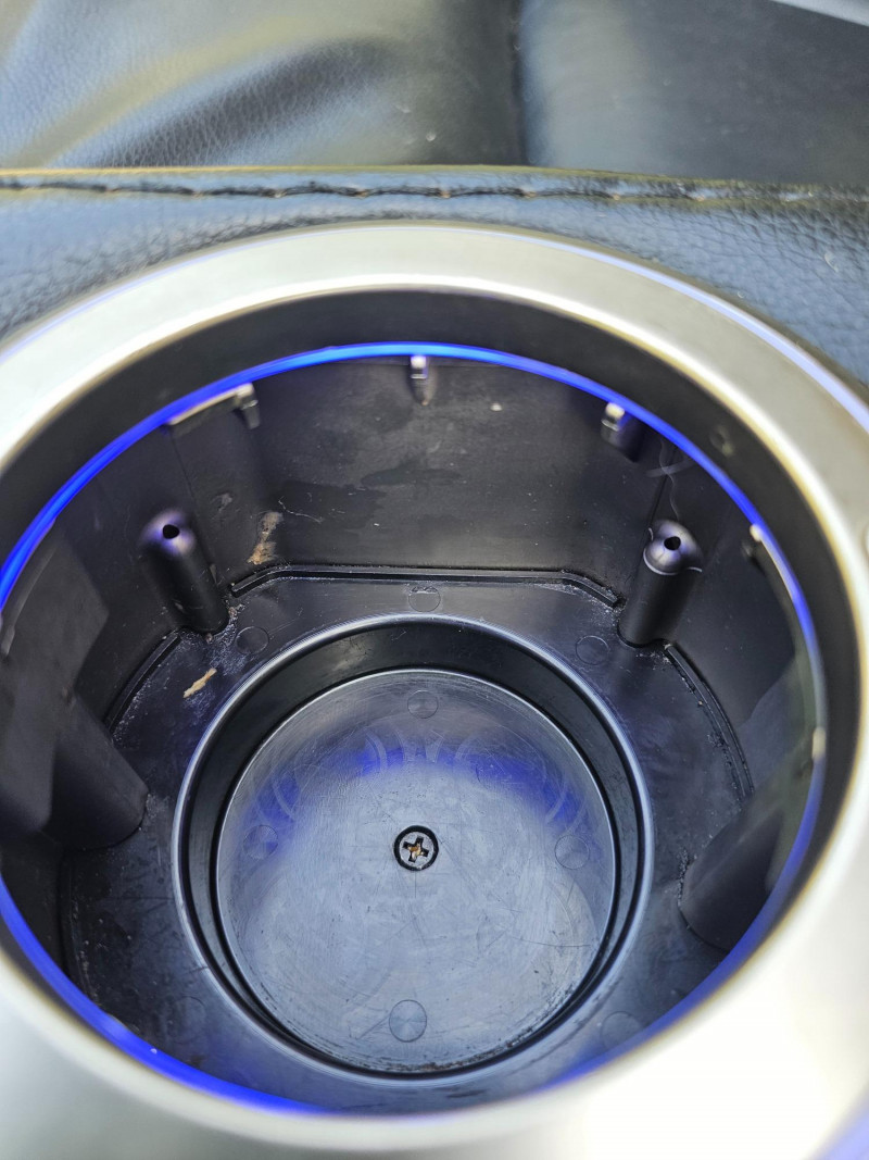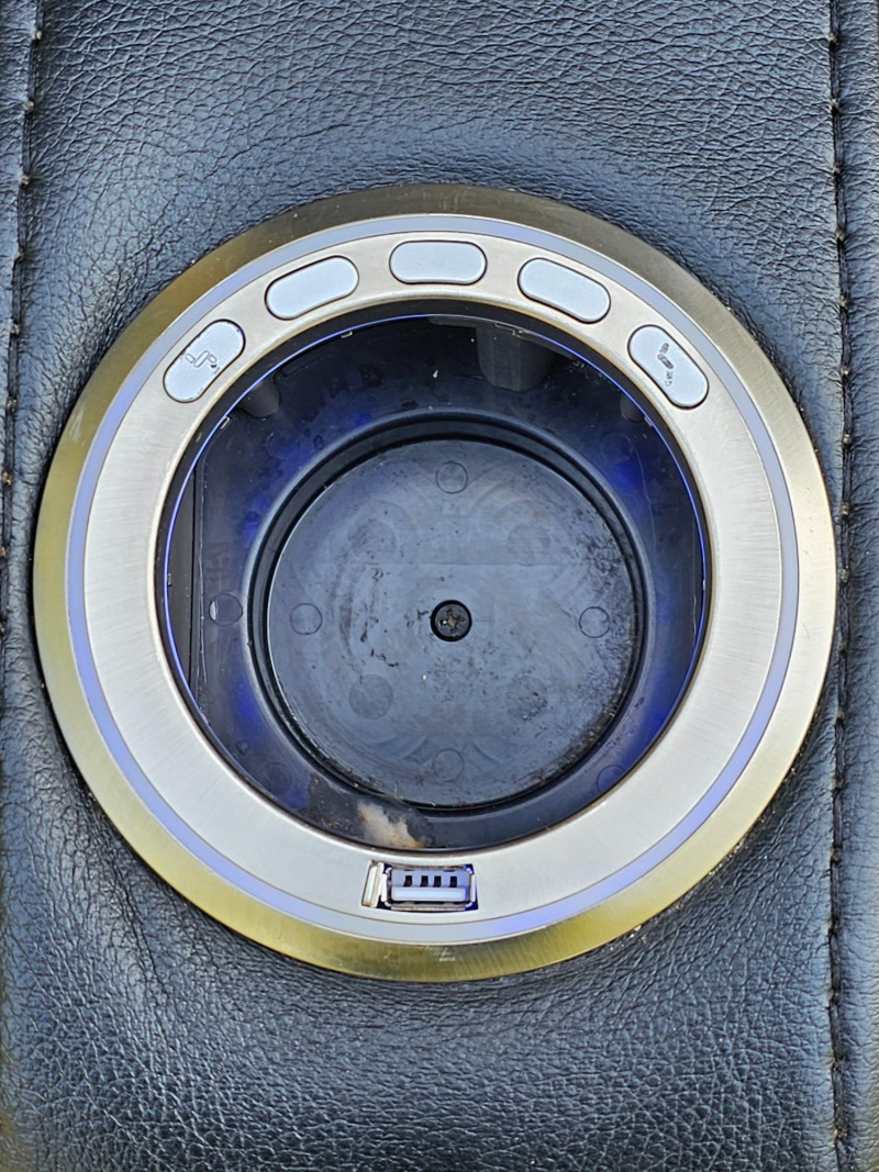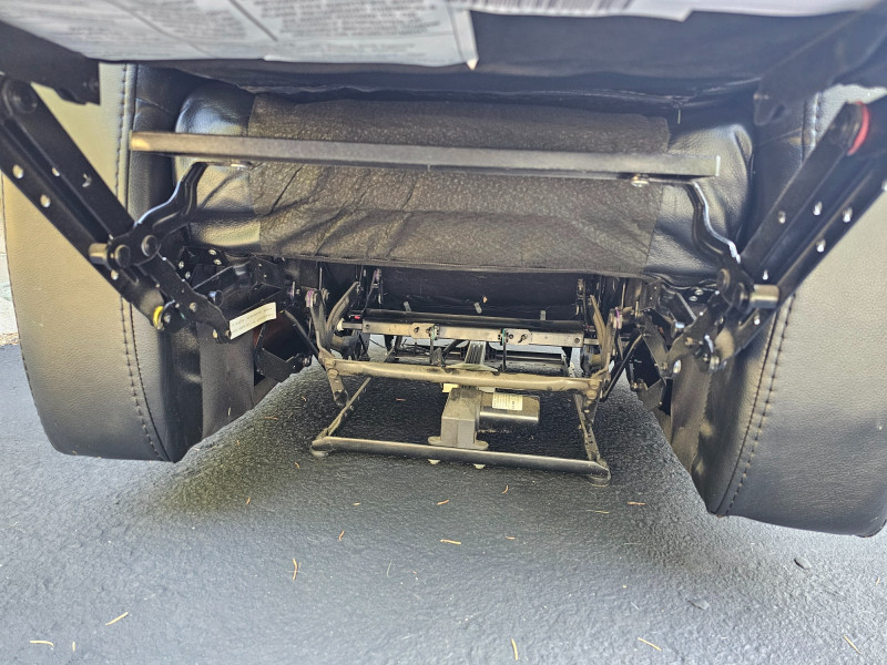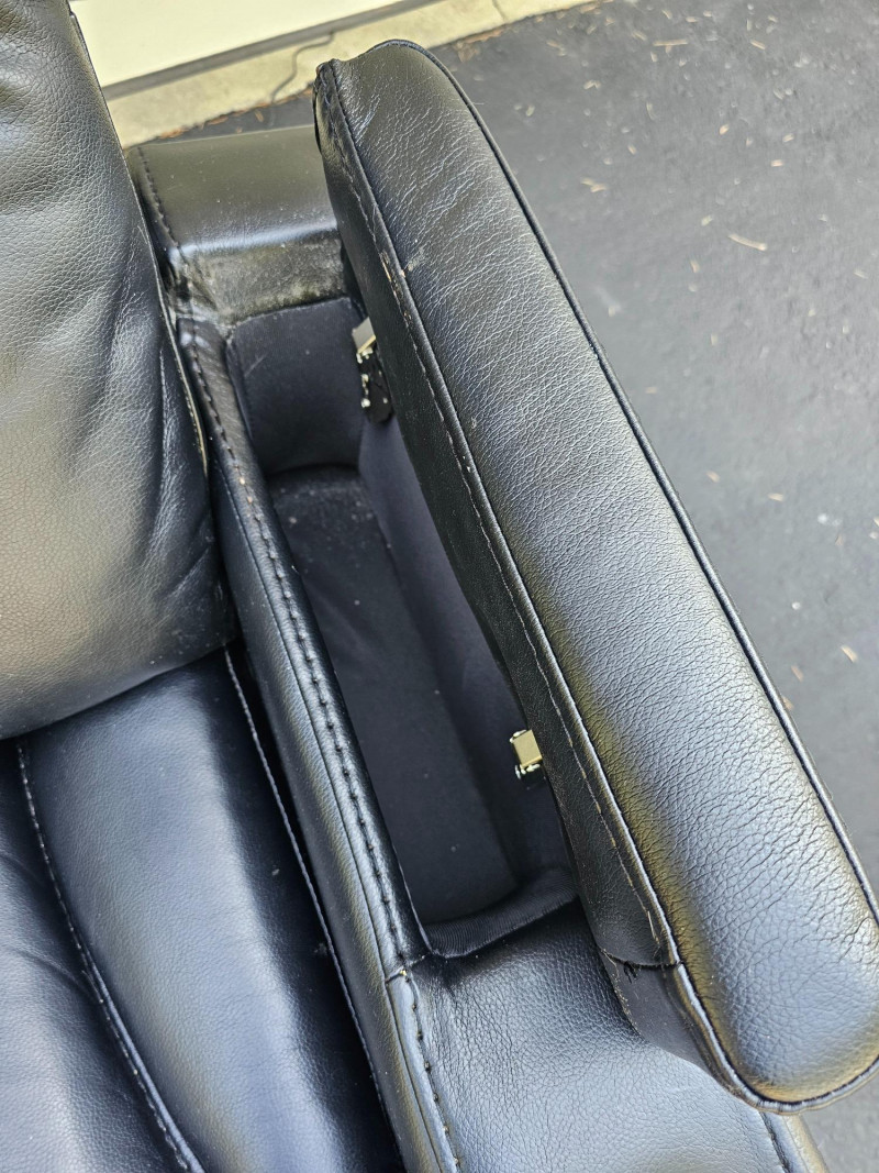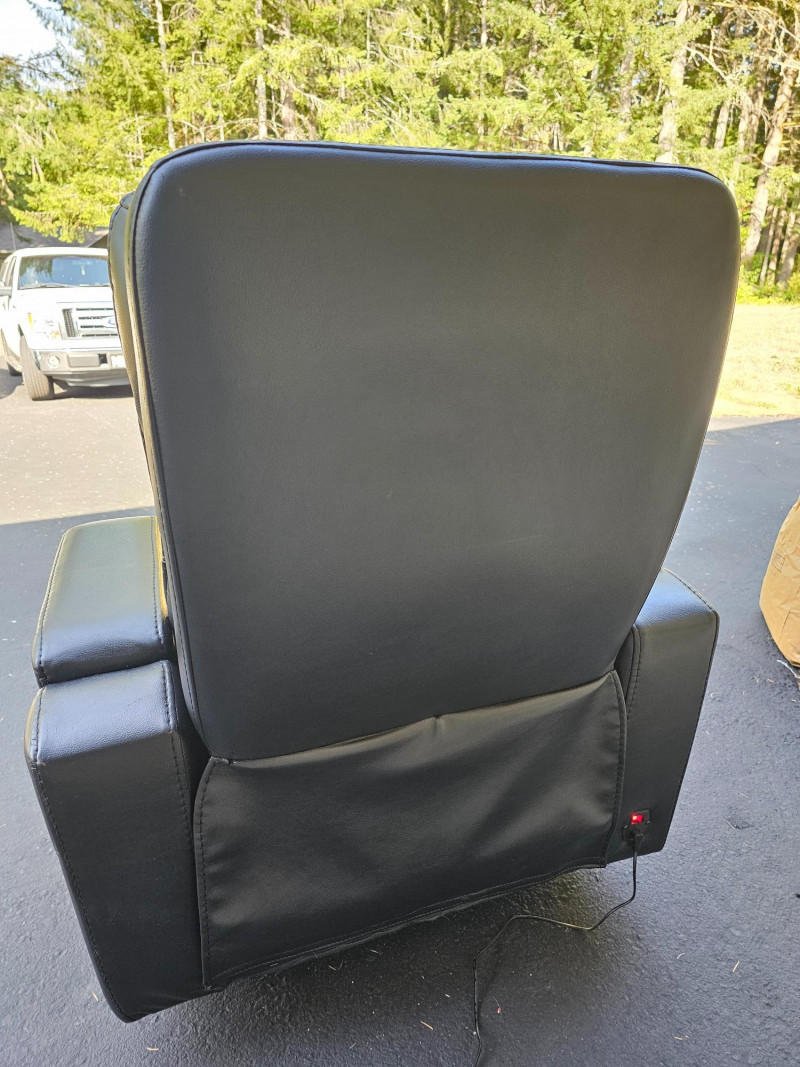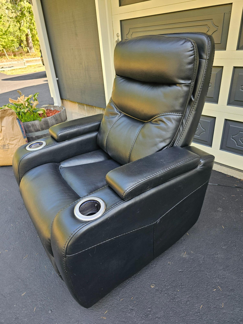 Black Faux Leather Power Theater Recliner Power recliner has blue illuminated cupholders and 2 armrest storage compartments Could use a thorough surface cleaning (see pics) Tested - Works! 42"T x 34"W x 34"D