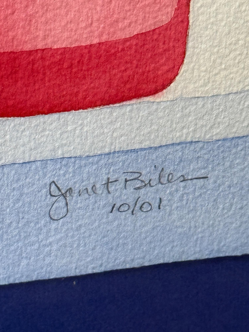 “Vertical Tasting” an Original Watercolor Signed by Janet Biles A colorful watercolor on paper, mounted on a blue background with black frame. 26.25x38.5”