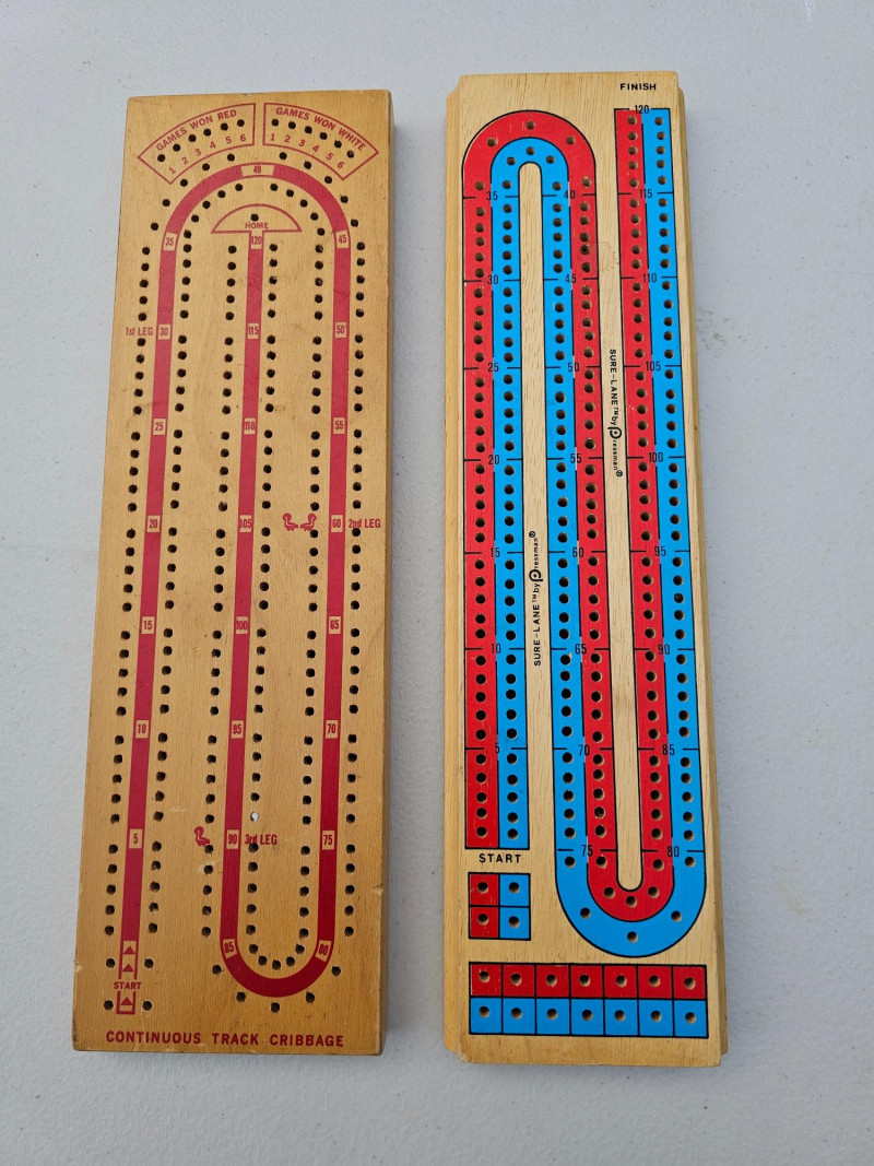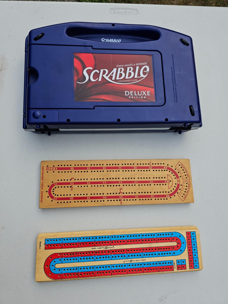 Travel Scrabble & 2 Wood Cribbage Boards Travel Scrabble Deluxe Edition In convenient plastic carry case! Missing one little wood tray for Letters (2) Wood Cribbage Boards With Pins