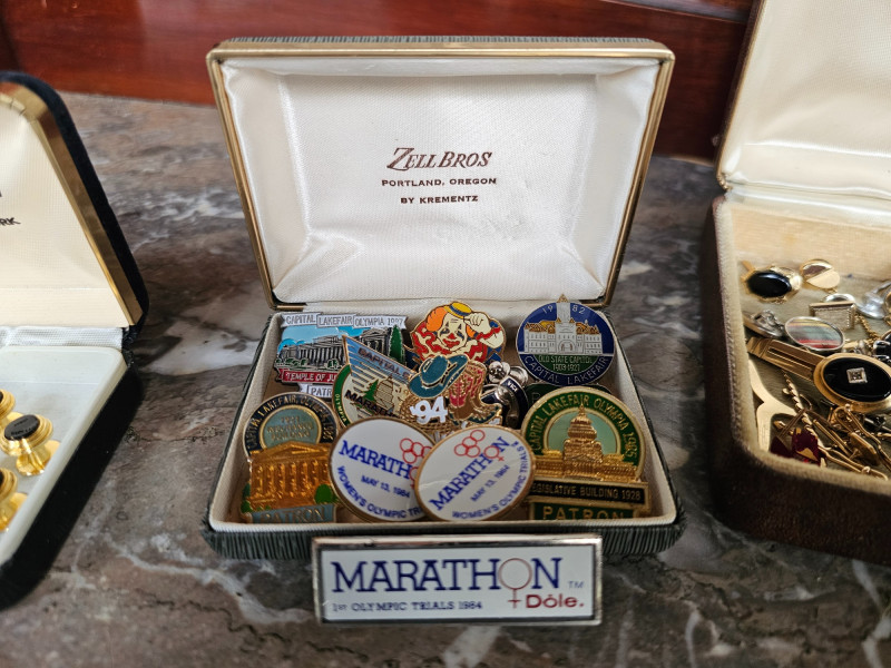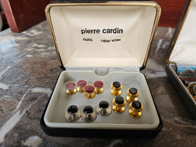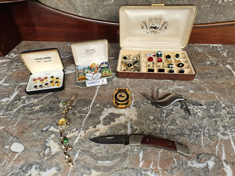 Men's Cufflinks, Tie Tacks, Tuxedo Buttons, And More! 7 sets and a couple.of single cufflinks A bunch of miscellaneous tie tacks 3 different sets of tuxedo buttons 2 pocket knives Bunch of Lakefair pins 28th Lakefair Invitational Money Clip Women's watch