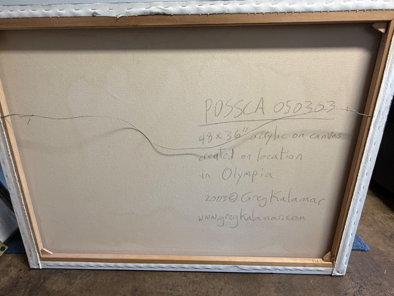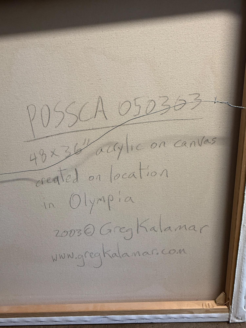 Large format original acrylic art, painted on location at the POSSCA in Olympia, WA. Signed by Artist Greg Kalamar 2003.