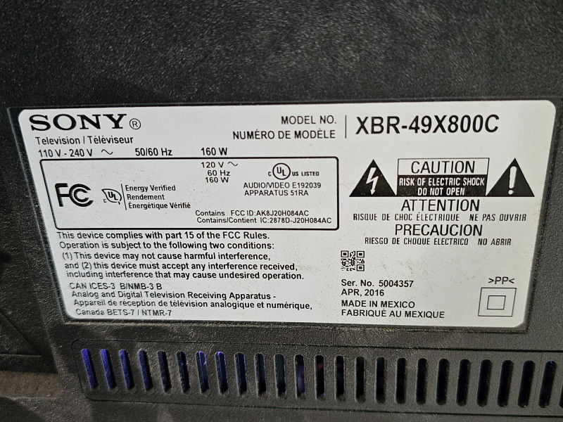 Sony Bravia 49" 4K Ultra HD Smart LED TV Sony Model #XBR-49X800C Mfg April 2016 Pulled from a working system Includes remote, power cable, HDMI cable & Sanos wall mount Tested - Powers On!