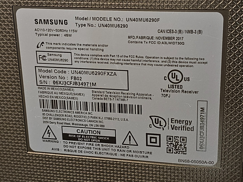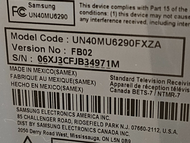 Samsung 40" 4K UHD Smart LED TV Samsung Model #UN40MU6290FXZA Mfg Date November 2017 Includes power cable, stand, remote & HDMI cable Pulled from a working system Tested - Works! 23.5"T x 36"W x 2.5"D