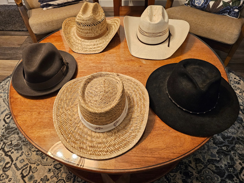 (5) Men's Hats Ole Classic Straw Cowboy Hat (OSFA) Twister Bangora Straw Cowboy Hat (7 5/8) Hunt Club Diamond Jim Felt Hat By Eddy Bros Ole Natural Sun Boaters Straw Hat (OSFA) Bailey Of Hollywood Classic Felt Fedora-Style Hat (XL) All in good used condition!