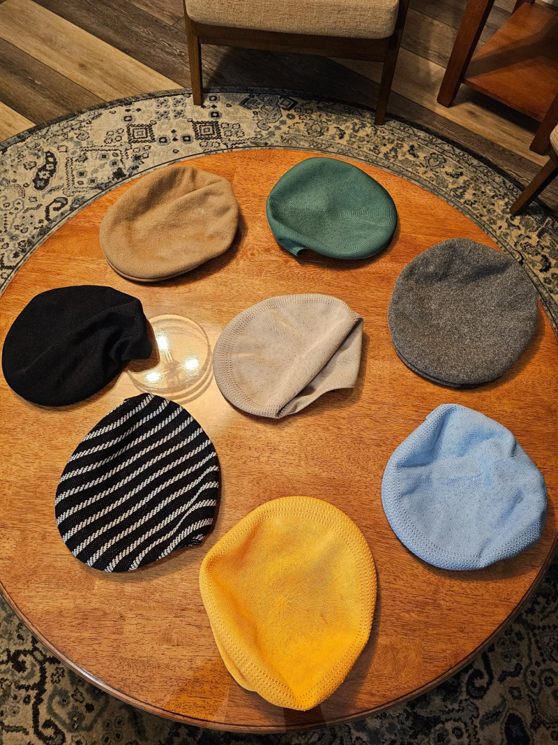 (8) Men's Kangol Hats Kangol Tropic 504 Ventair in Orange (XL) Kangol Tropic 504 Ventair in Forest Green (XL) Kangol Tropic 504 Ventair in Sky Blue (XL) Kangol Tropic 504 Ventair in Sand (XL) Kangol Tropic 504 Ventair in Classic Black (XL) Kangol Twist Stripe 504 Ivy Cap (XL) Kangol The Wool 504 in Beige (XL) Kangol The Wool 504 in Gray (XL) All in good, clean condition!