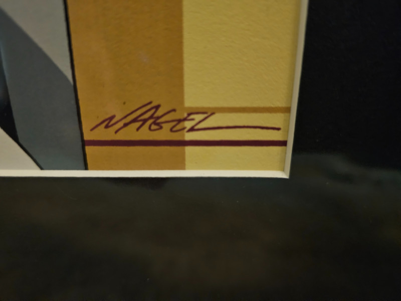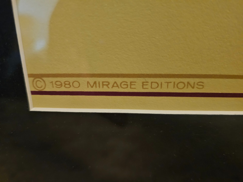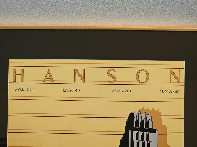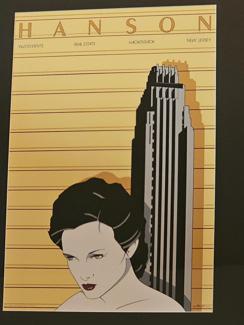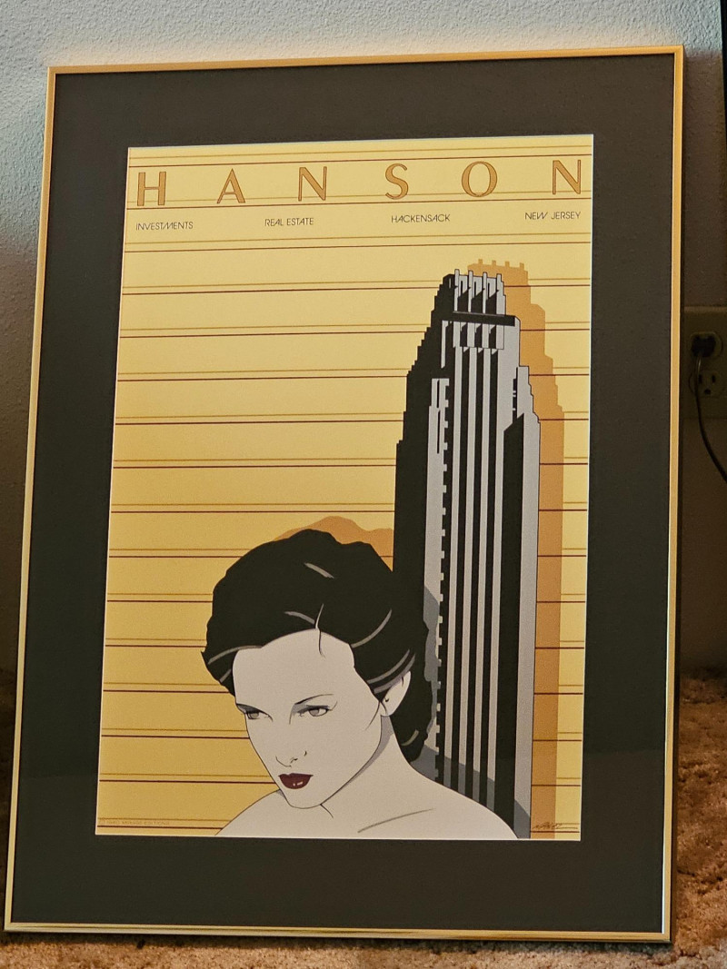 Patrick Nagel "Hanson" Silkscreen Print 1980 Patrick Nagel was an American artist best known for his stylized illustrations that captured the essence of 1980s glamour and sophistication. His work gained widespread popularity in the 1980s, appearing in magazines like Playboy and on the cover of Duran Duran's album "Rio." The "Hanson" print, with its Art Deco influences and connection to investments and real estate, reflects the commercial aspect of Nagel's work, often commissioned by businesses to create a sense of luxury and modernity. Bottom left corner has "1980 Mirage Editions" with signature bottom-right corner Professionally framed and matted. Some fading possible due to age 33.25"T x 27.25"W