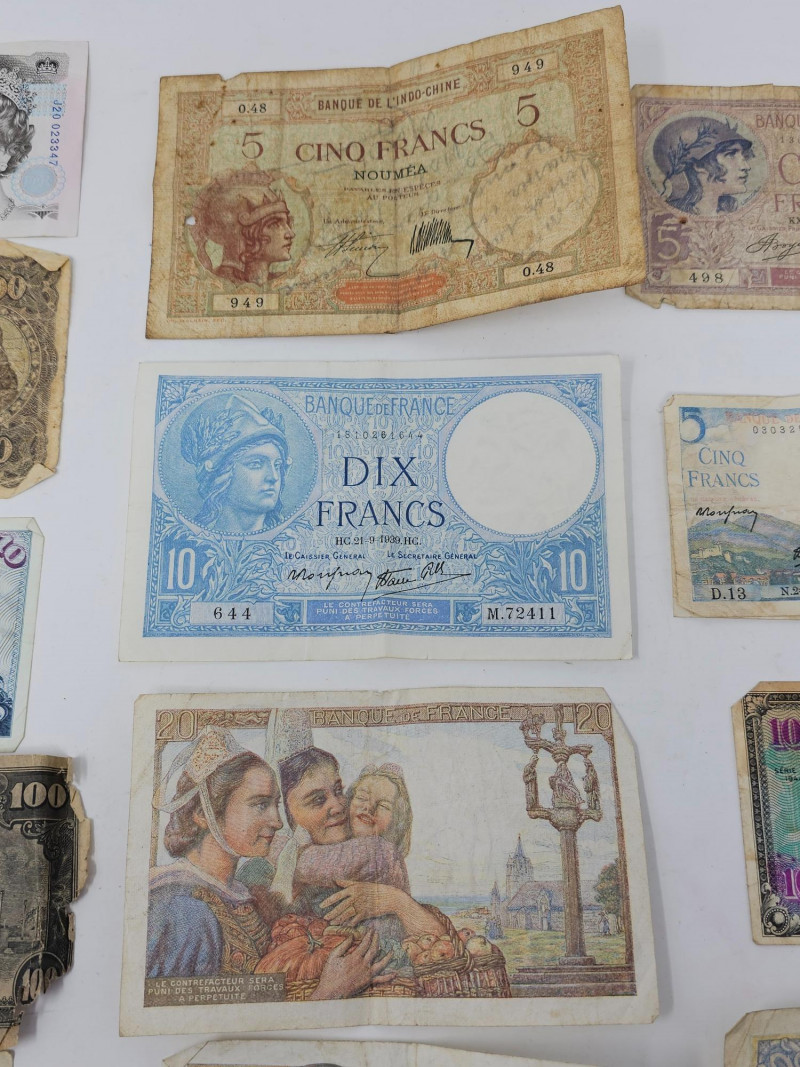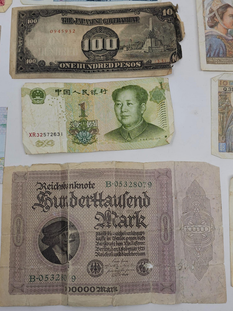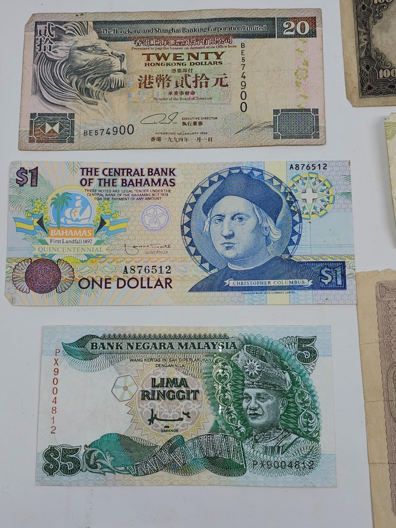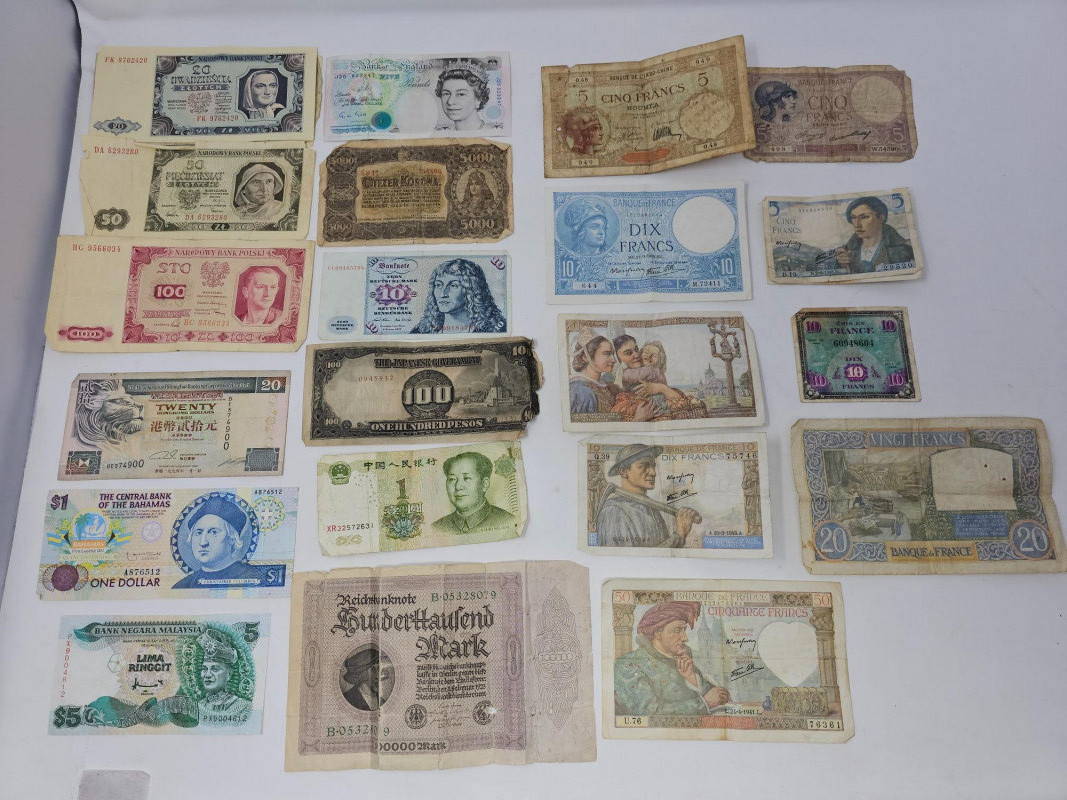 Foreign Currency From All Over The World! 20, 50, 100 Zlotych from Poland (1948) 20 Dollar from Hing Kong (1994) 1 Dollar from Bahamas (1992) 5000 Korona from Hungary (1923) 10 Deutsche Mark from Germany (1970) 5 Ringgit from Malaysia (1986 - 2000) 5 Pound Note from England (1990) 100 Peso from Phillipines (Japan Military Currency WWII) 1 Yuan from China (1999) 100,000 Marks from Germany (1923) 5 Francs from France (1926) 10 Francs from France (1916 - 1942) 20 Francs from France (pre-1958) 20 Francs from France (pre-1958) 10 Francs from France (1943) 50 Francs from France (1941) 5 Francs from France (1933?) 5 Francs from France (1943) 10 Francs from France (Allied Military Currency 1944) 28 bills in all!