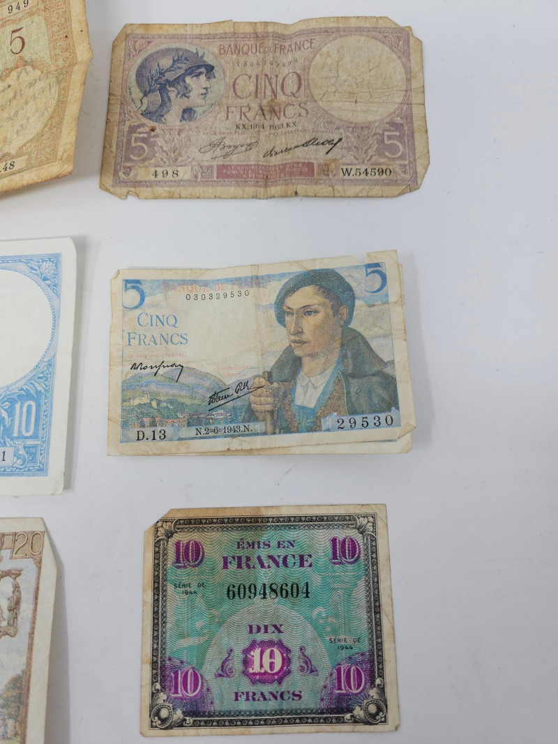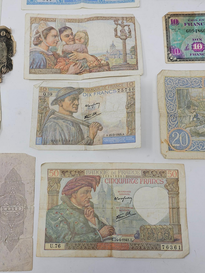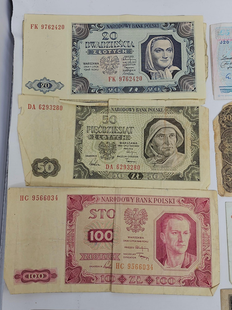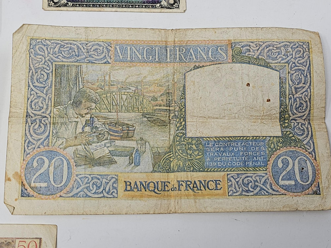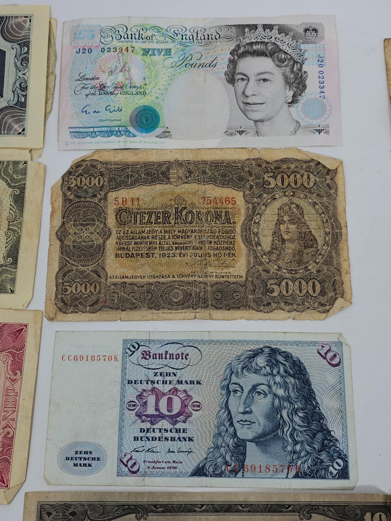 Foreign Currency From All Over The World! 20, 50, 100 Zlotych from Poland (1948) 20 Dollar from Hing Kong (1994) 1 Dollar from Bahamas (1992) 5000 Korona from Hungary (1923) 10 Deutsche Mark from Germany (1970) 5 Ringgit from Malaysia (1986 - 2000) 5 Pound Note from England (1990) 100 Peso from Phillipines (Japan Military Currency WWII) 1 Yuan from China (1999) 100,000 Marks from Germany (1923) 5 Francs from France (1926) 10 Francs from France (1916 - 1942) 20 Francs from France (pre-1958) 20 Francs from France (pre-1958) 10 Francs from France (1943) 50 Francs from France (1941) 5 Francs from France (1933?) 5 Francs from France (1943) 10 Francs from France (Allied Military Currency 1944) 28 bills in all!