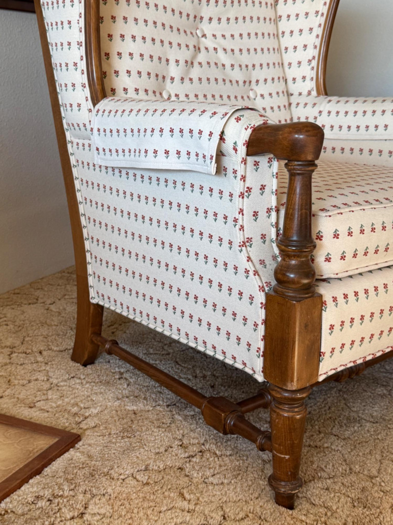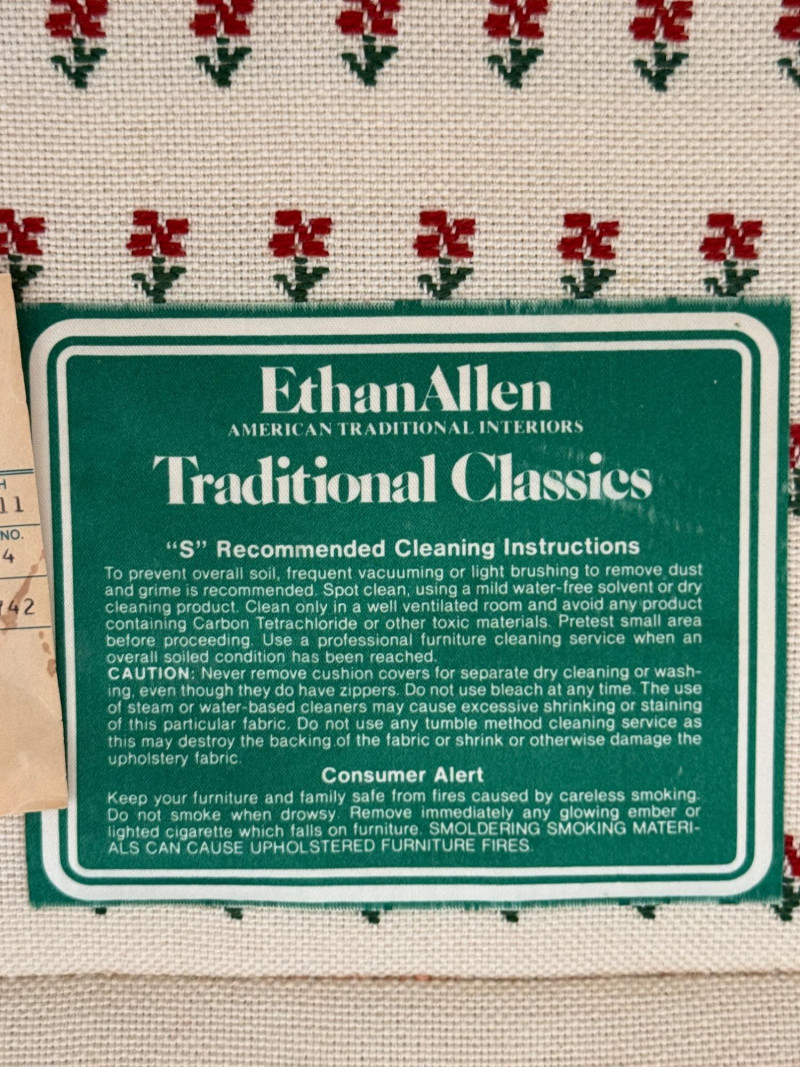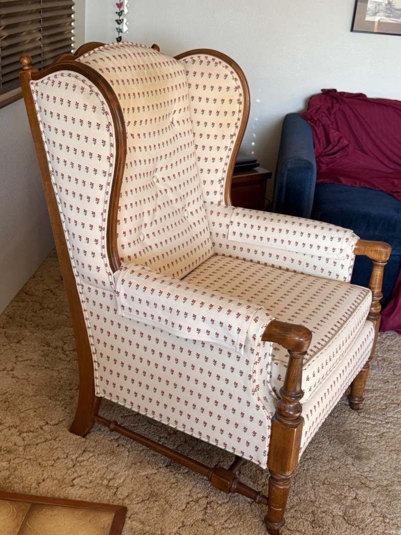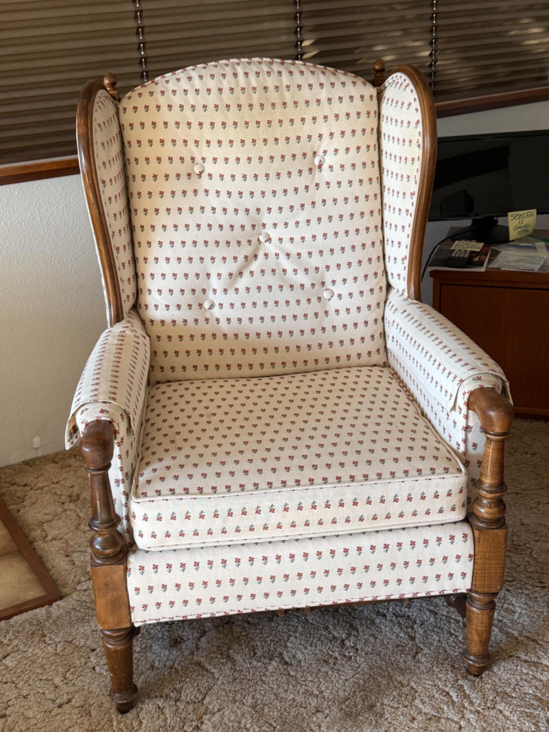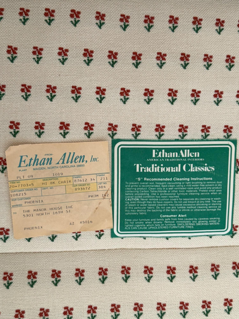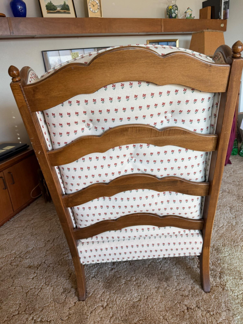 29x40x32” Ivory with rust and green flower pattern upholstery.