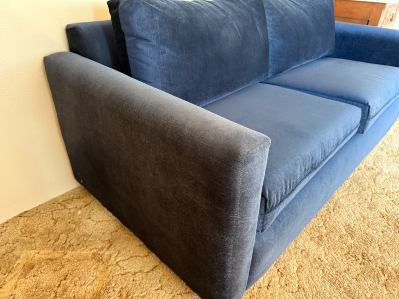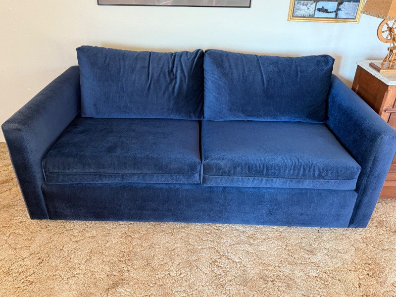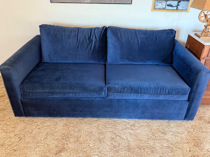 Blue hide-a-bed 2 seat sofa with removable cushions and pull out full size bed.