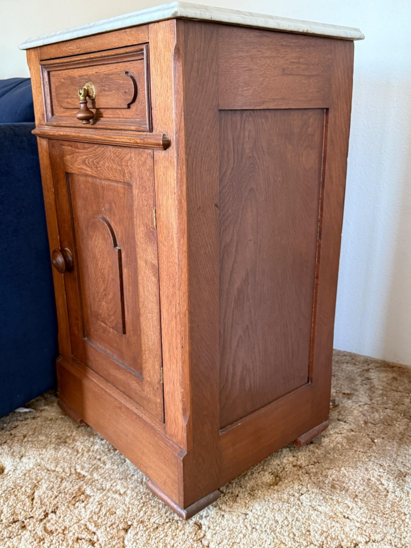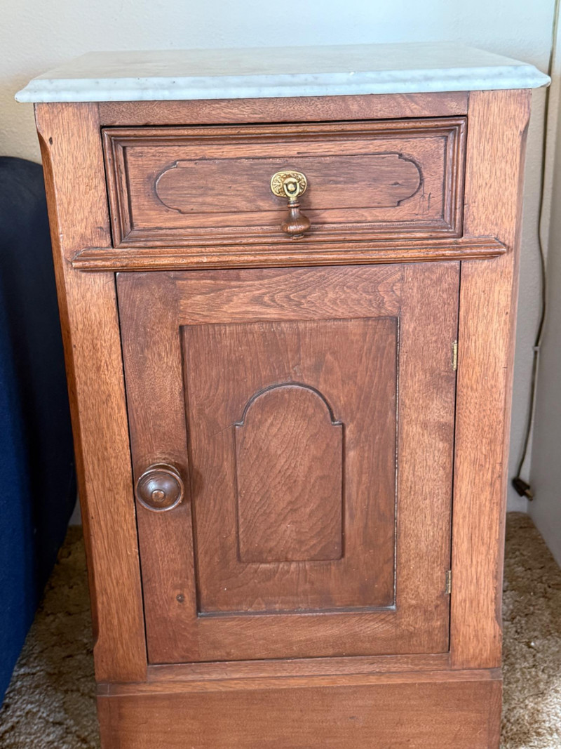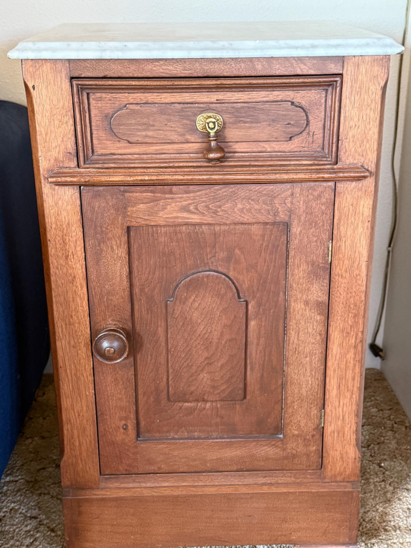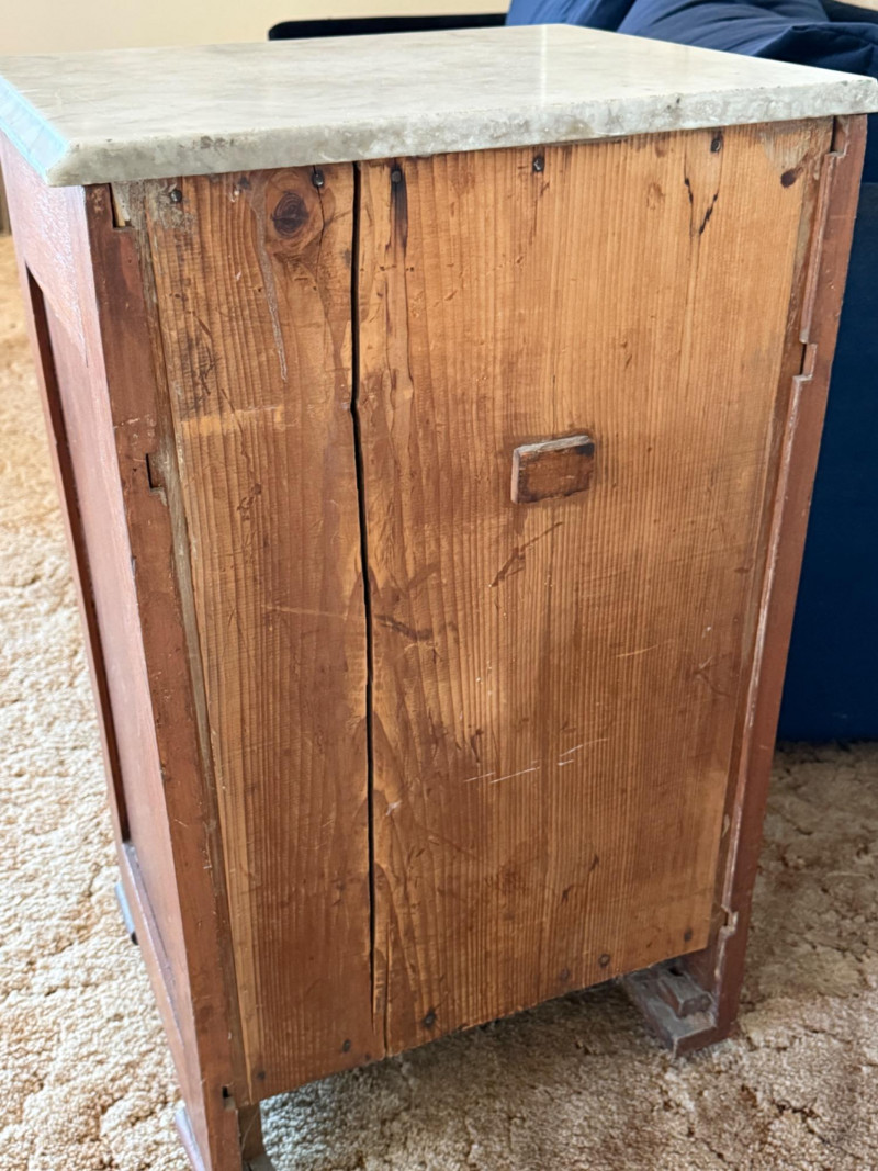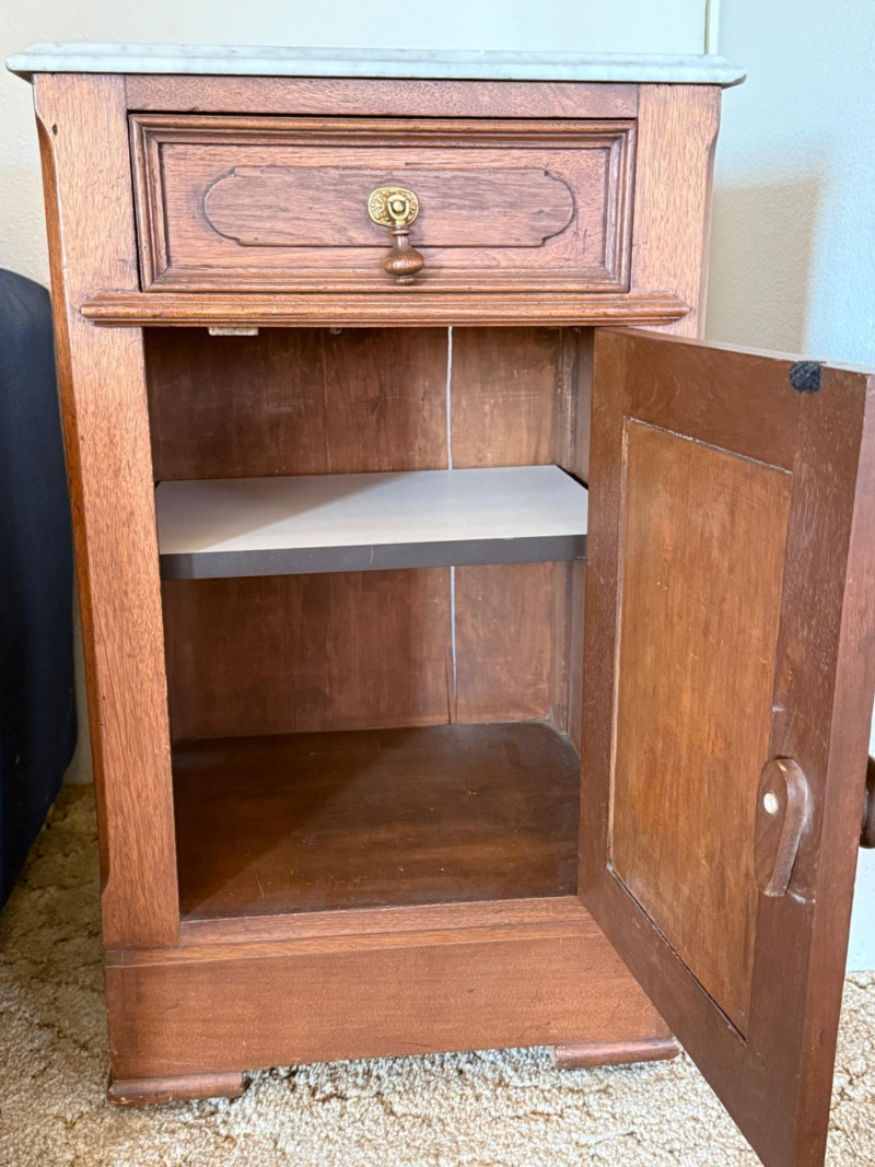 French Inspired Telephone Table With Marble Top 15x18x30.5” Marble top is removable, drop drawer pull, wood door latch and one interior shelf.