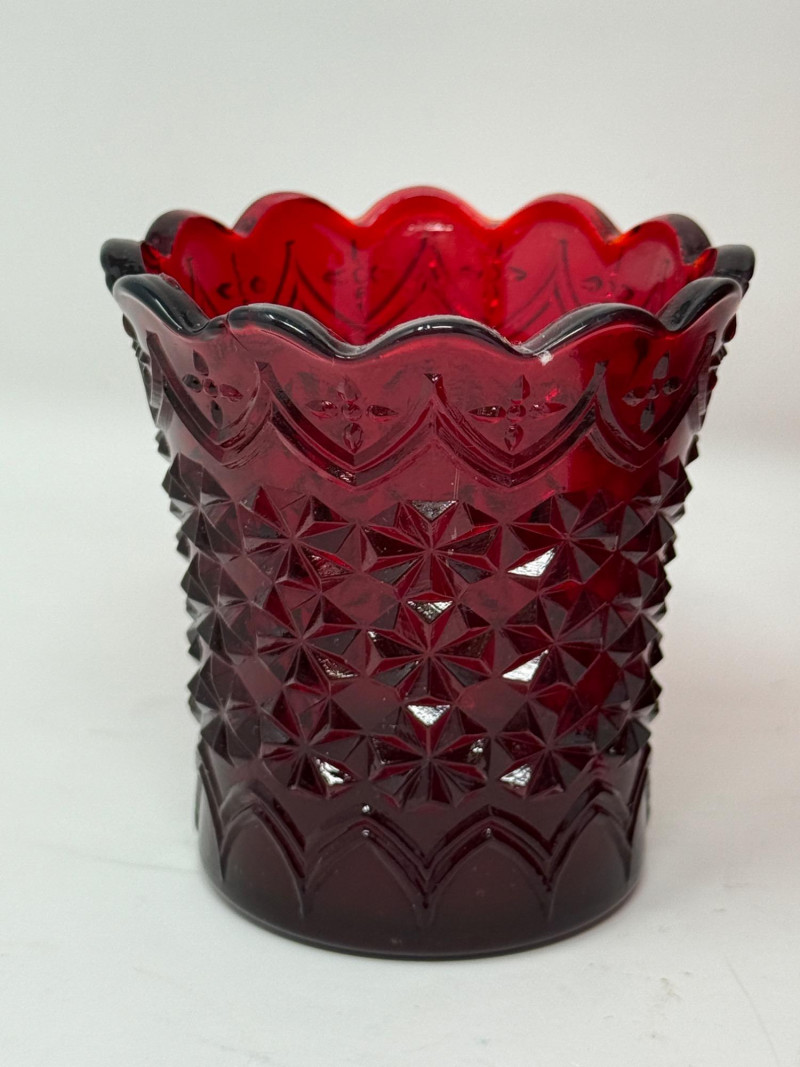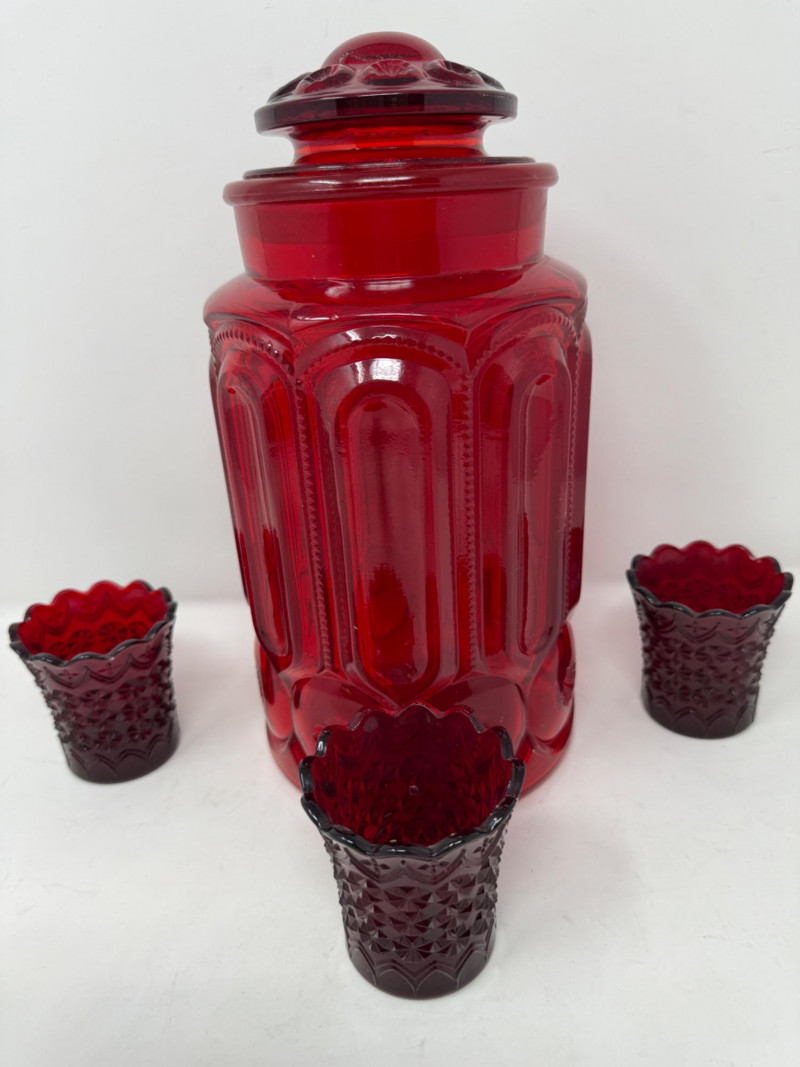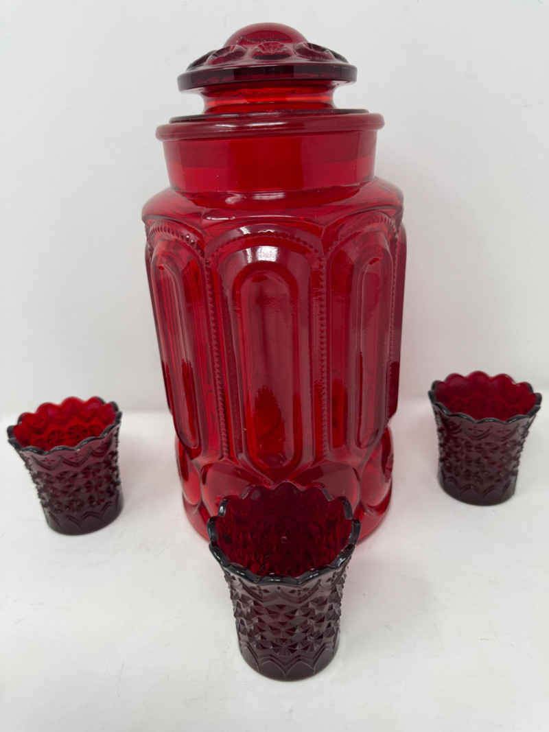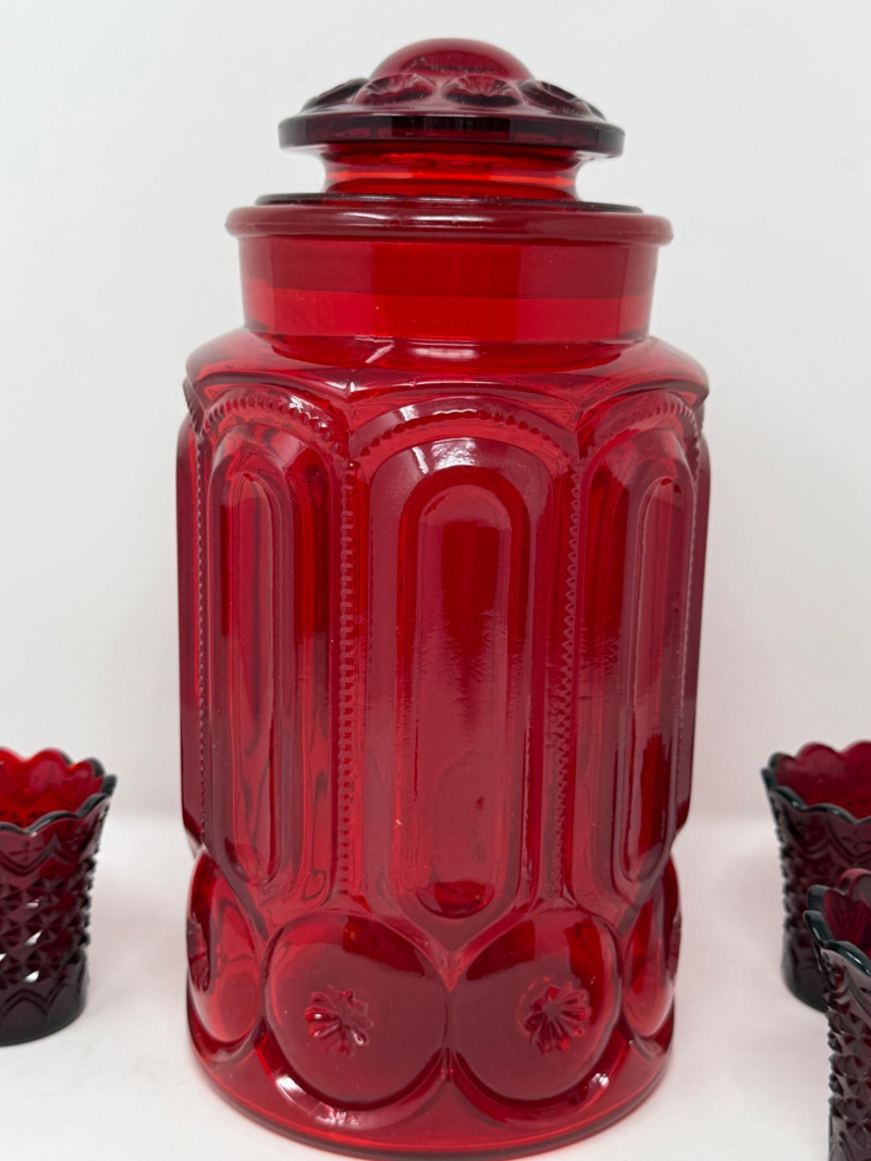 L.E. Smith Moon and Stars Amberina Canister and 3 votive candle holders.