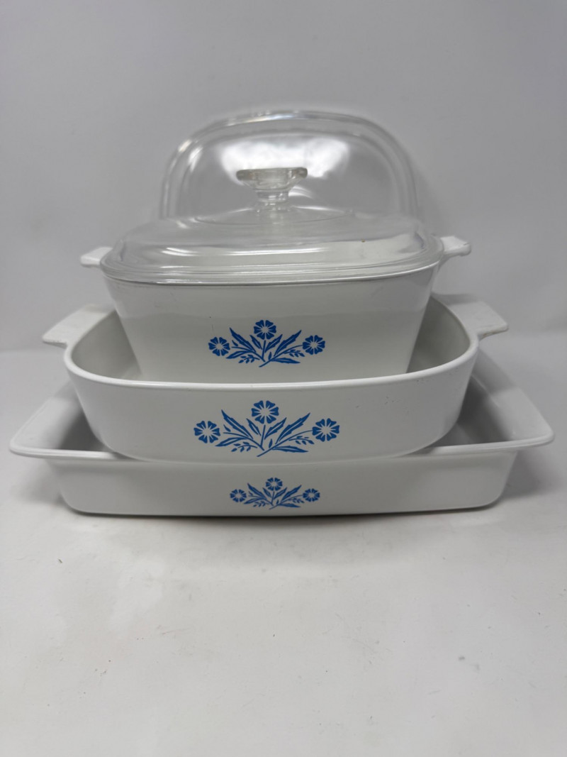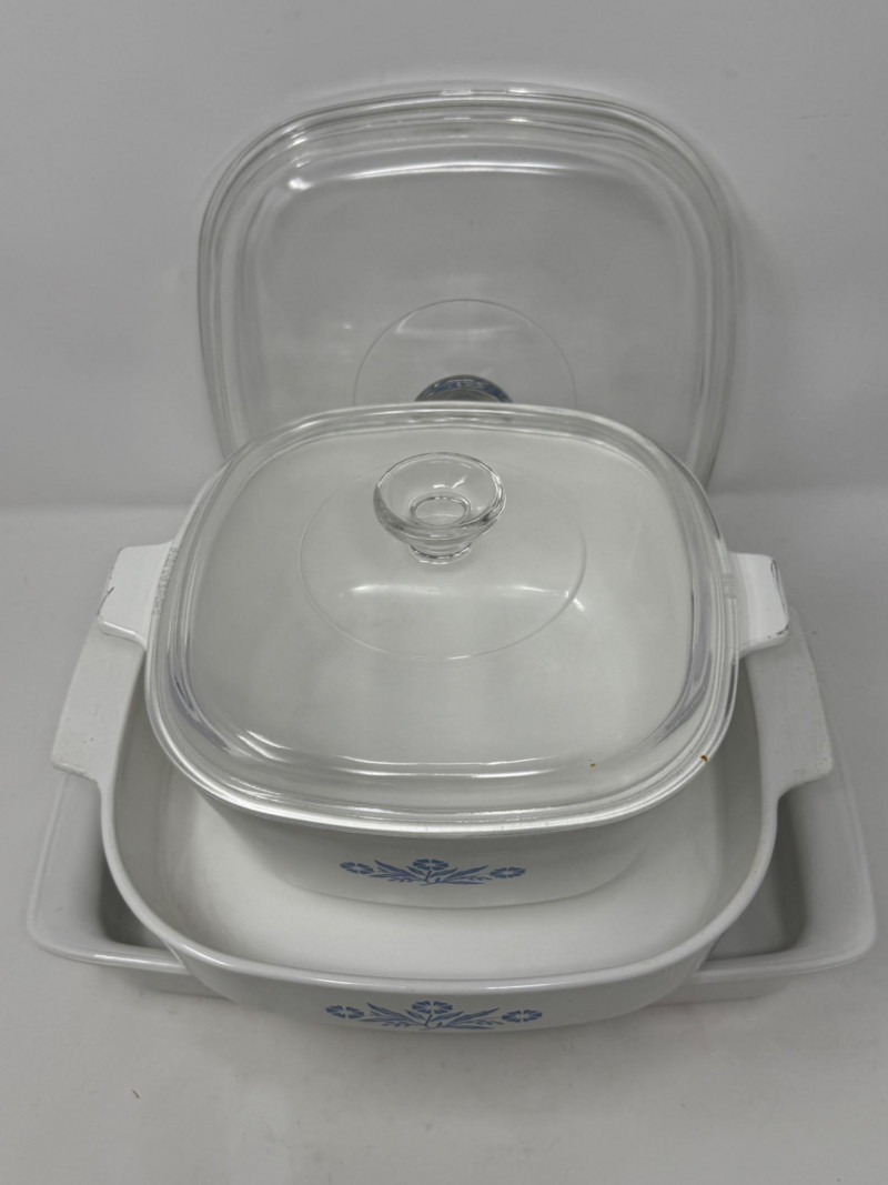 Cornflower Blue Corningware casseroles. Lasagna pan, large lidded casserole, lidded vegetable dish