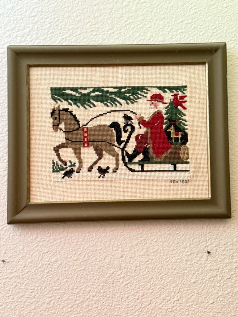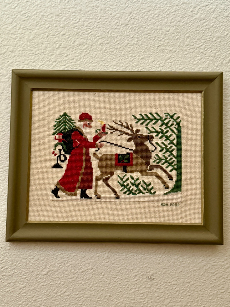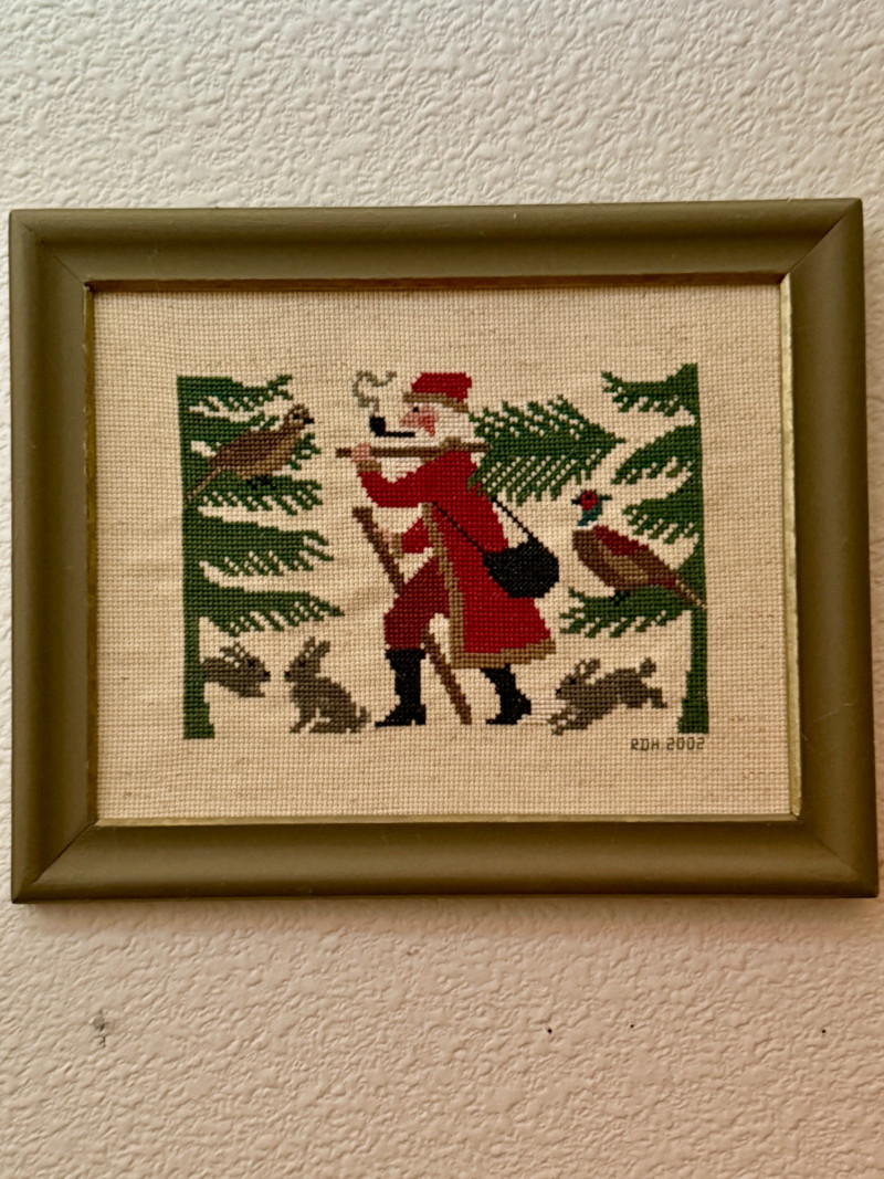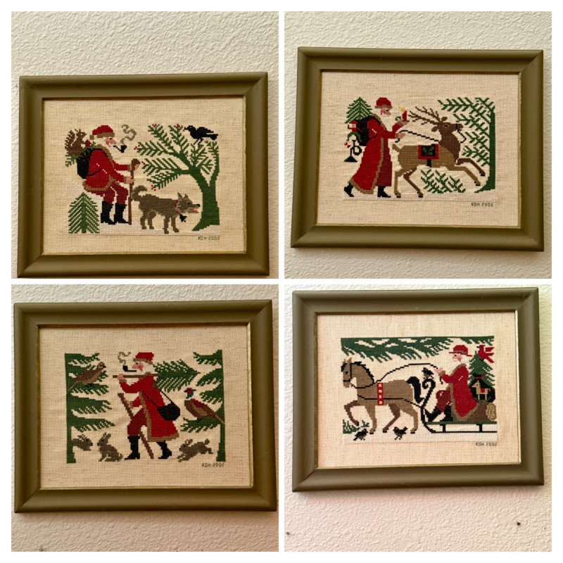 (4) Green Frame Needlepoint Santas Each 8.5x11” Dated 2002 Sleigh Santa Sitting Santa Nature Santa Reindeer Santa