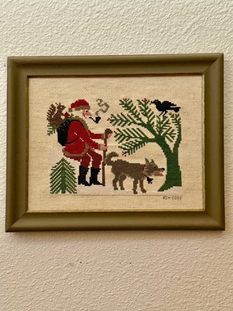 Lot # 43 - (4) Green Frame Needlepoint Santas